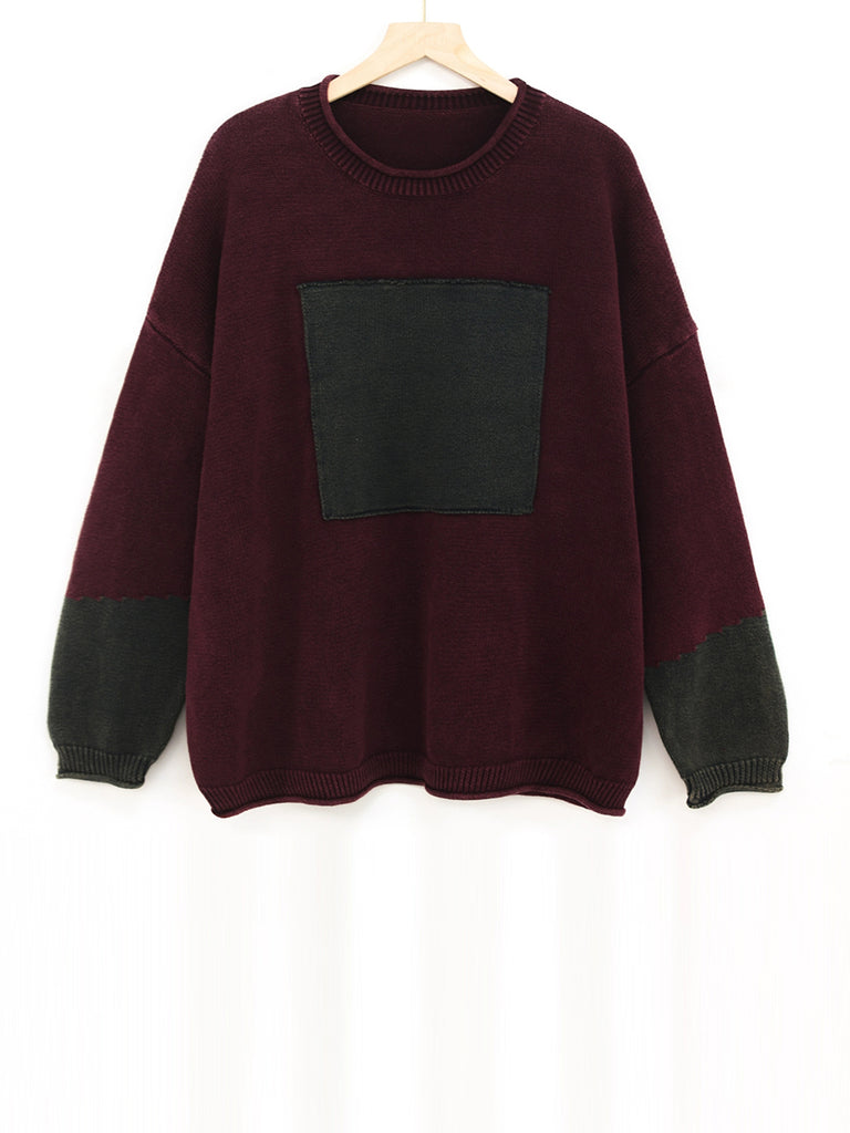 Women Autumn Retro Spliced 100%Cotton O-Neck Sweater