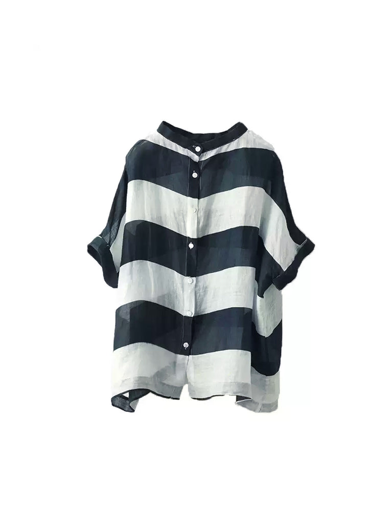 Women Summer Stripe Stand Collar 100%Ramie Thin Shirt