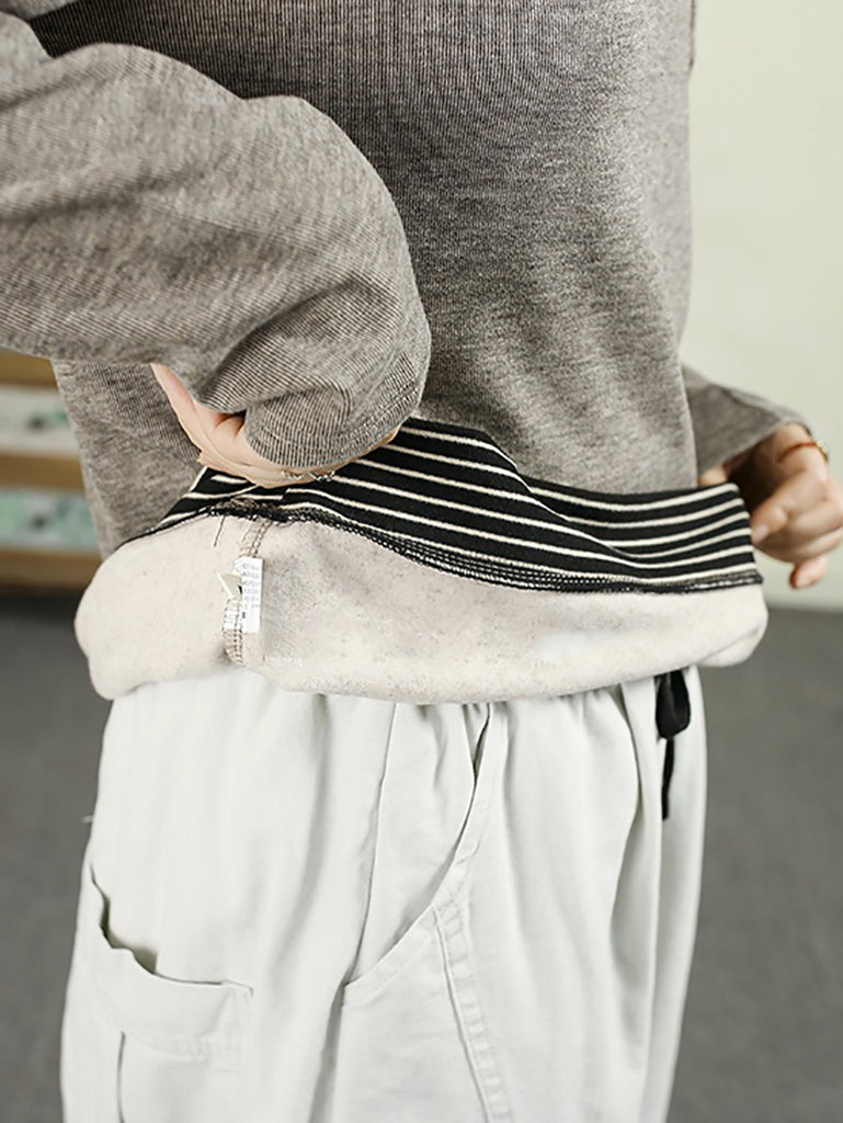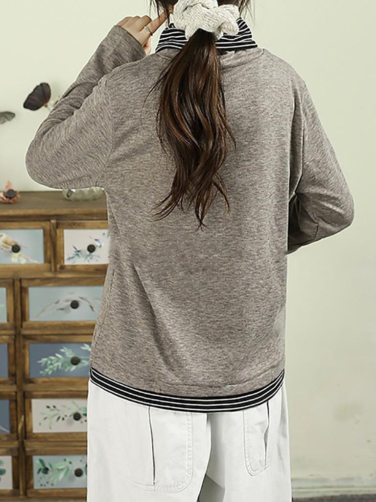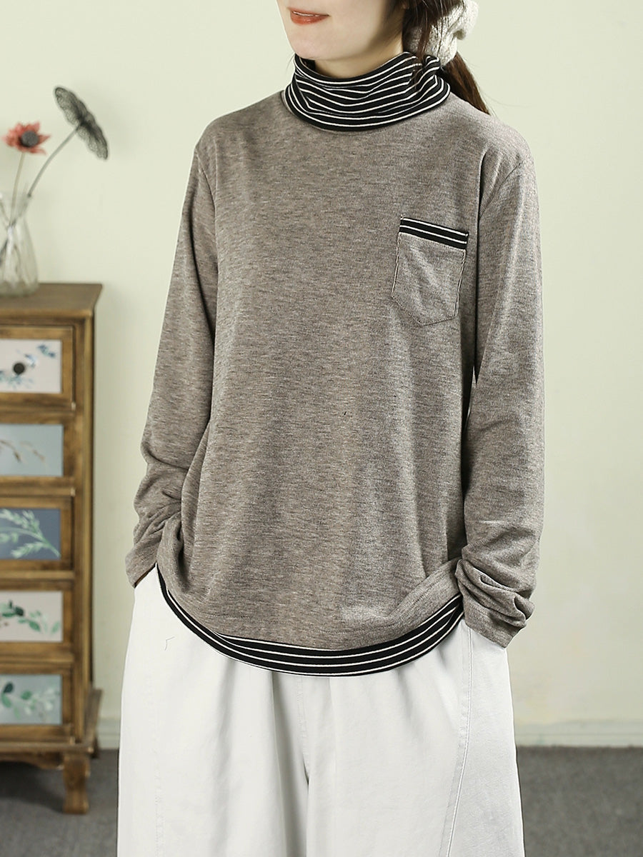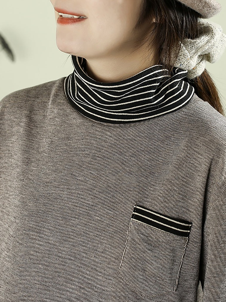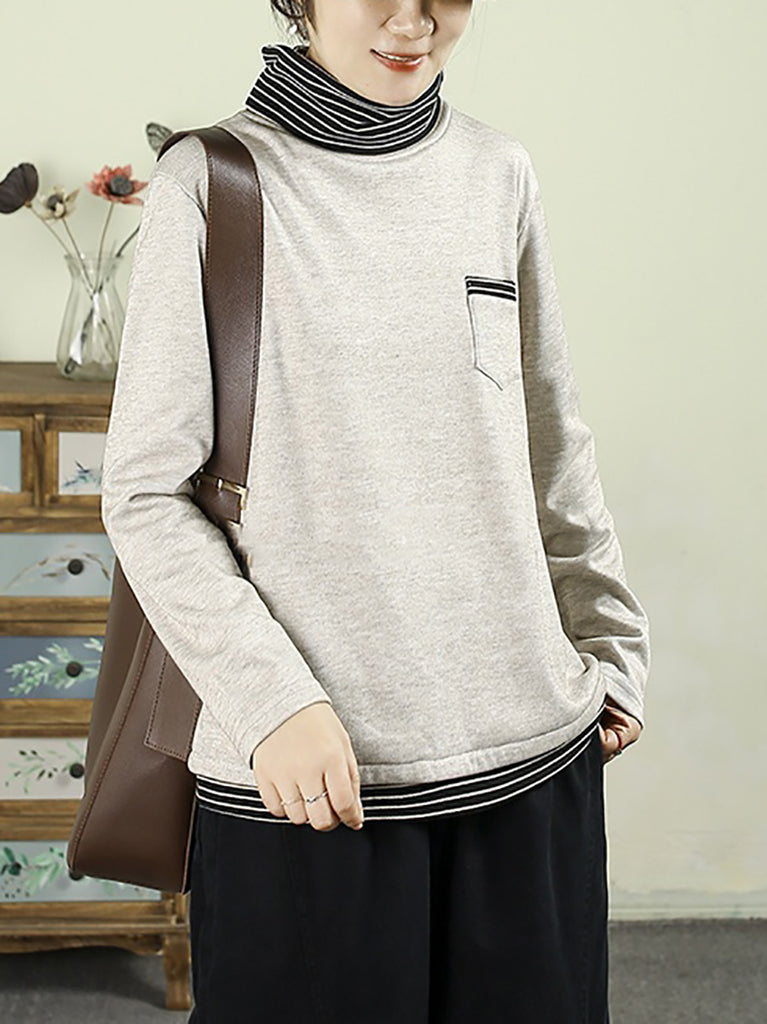Women Winter Stripe Spliced Turtleneck Fleece-lined Blouse