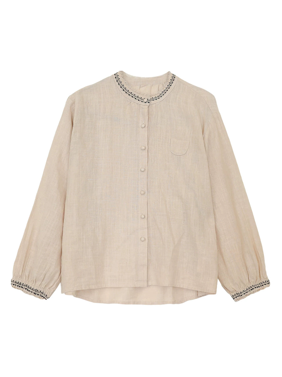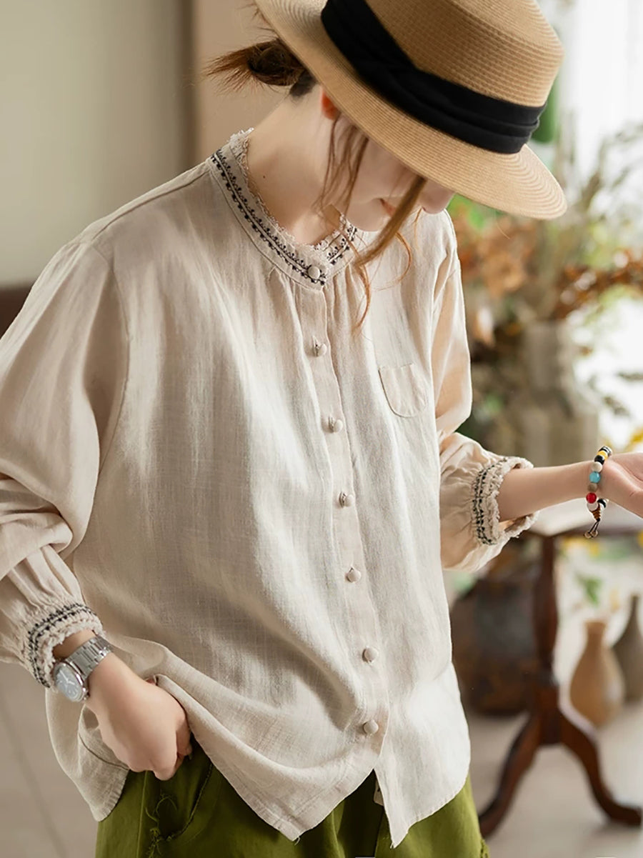 Women Artsy Summer Embroidery O-Neck Ramie Blouse