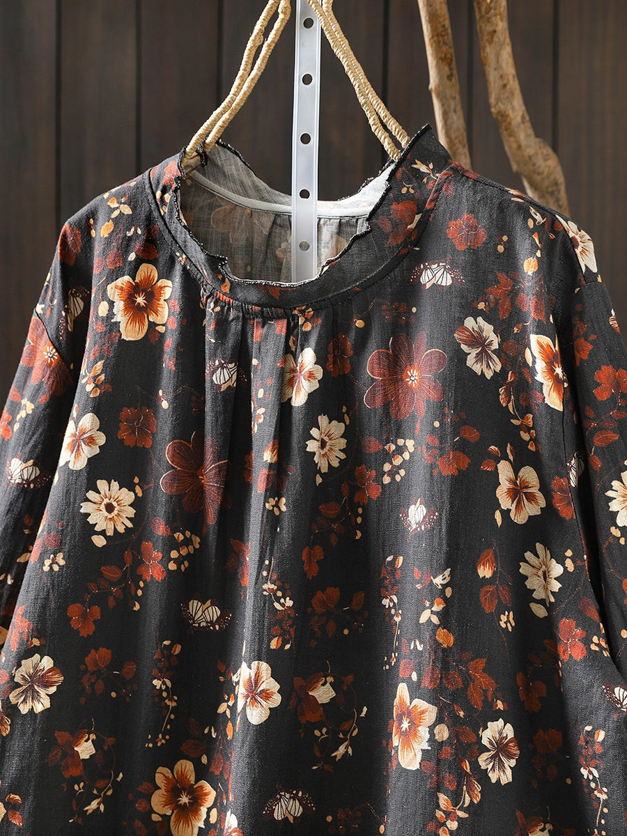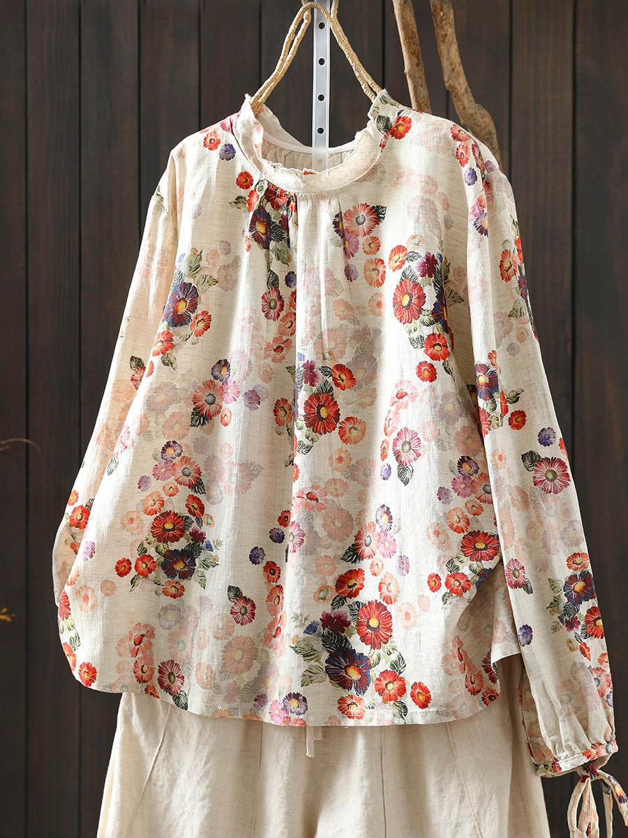 Women Spring Artsy Flower 100%Linen Blouse