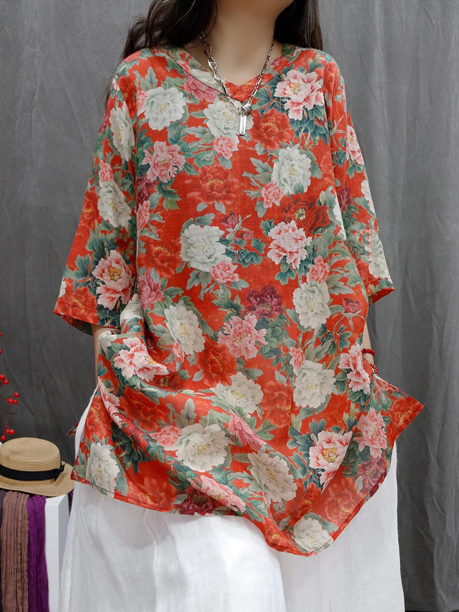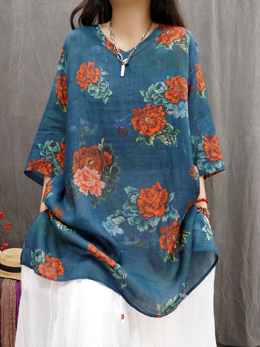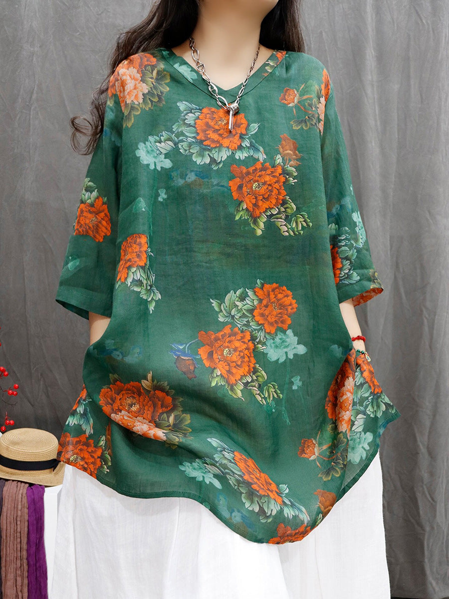 Women Spring Artsy Flower 100%Ramie V-Neck Blouse