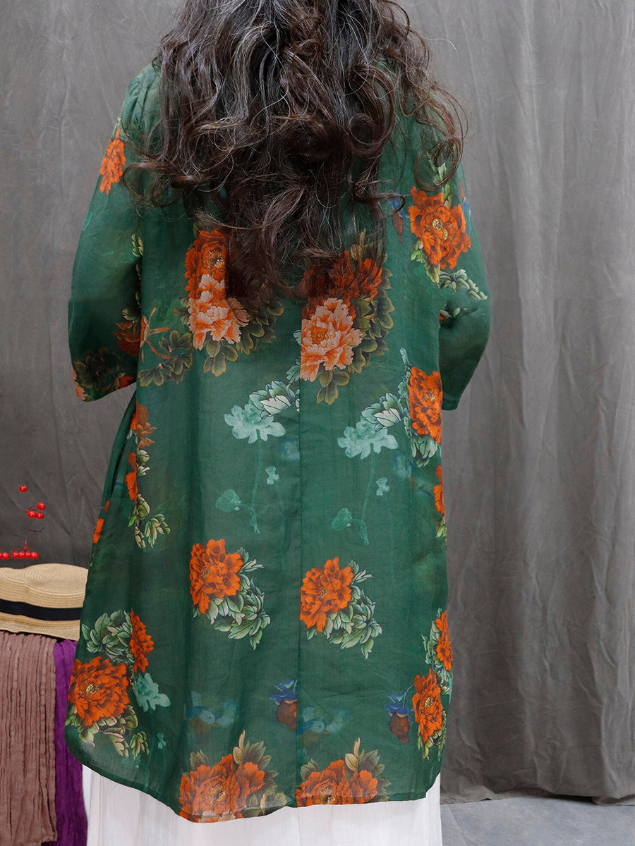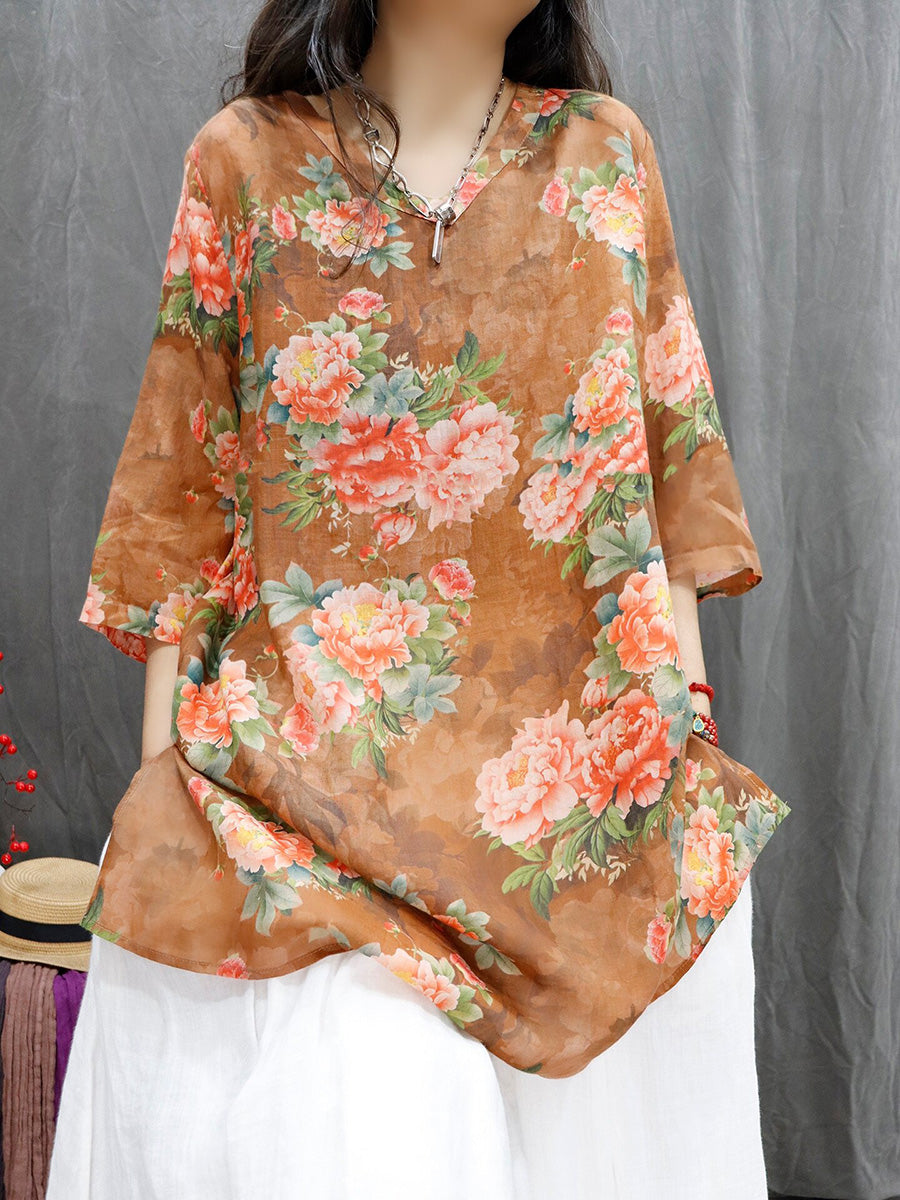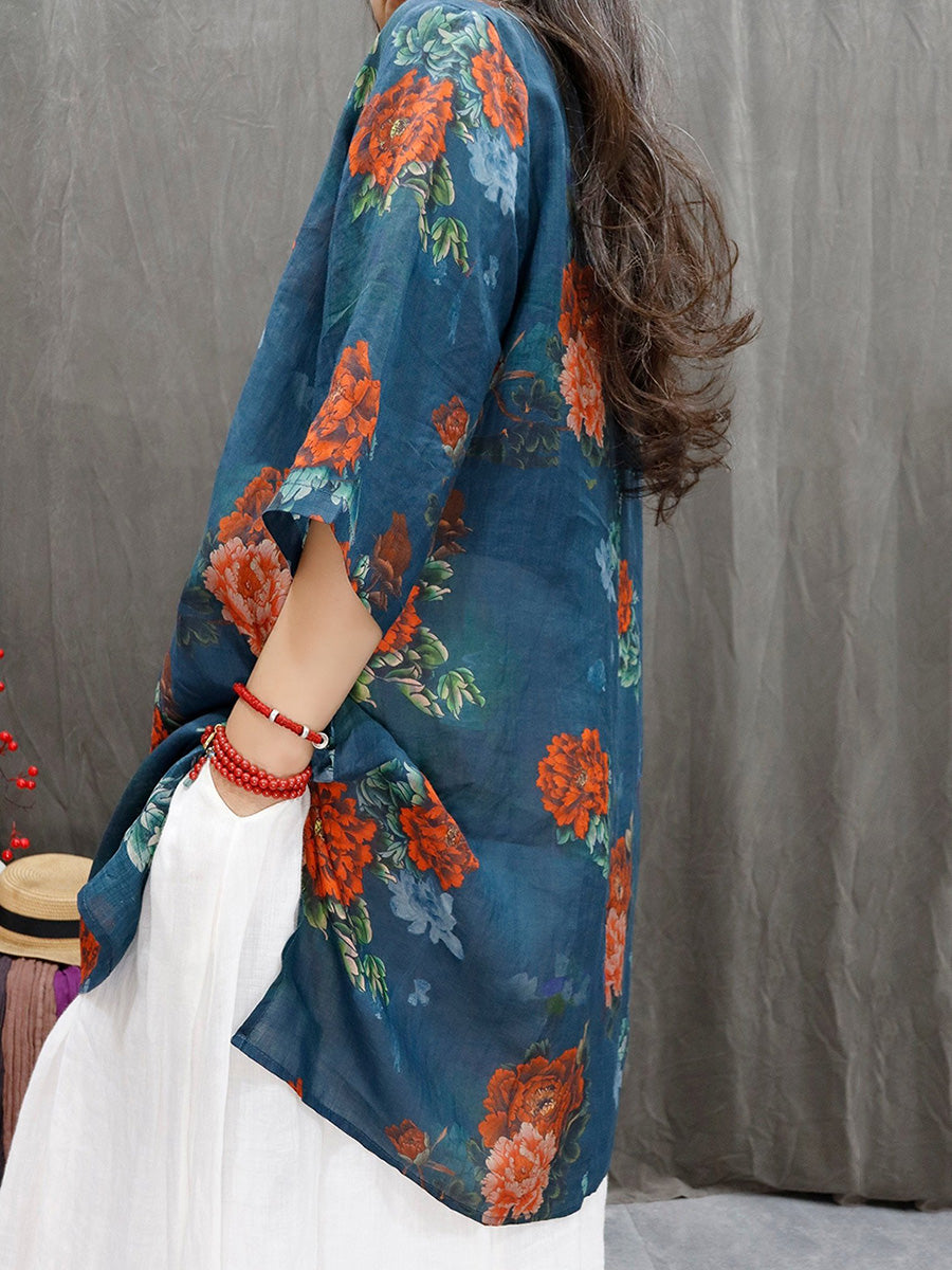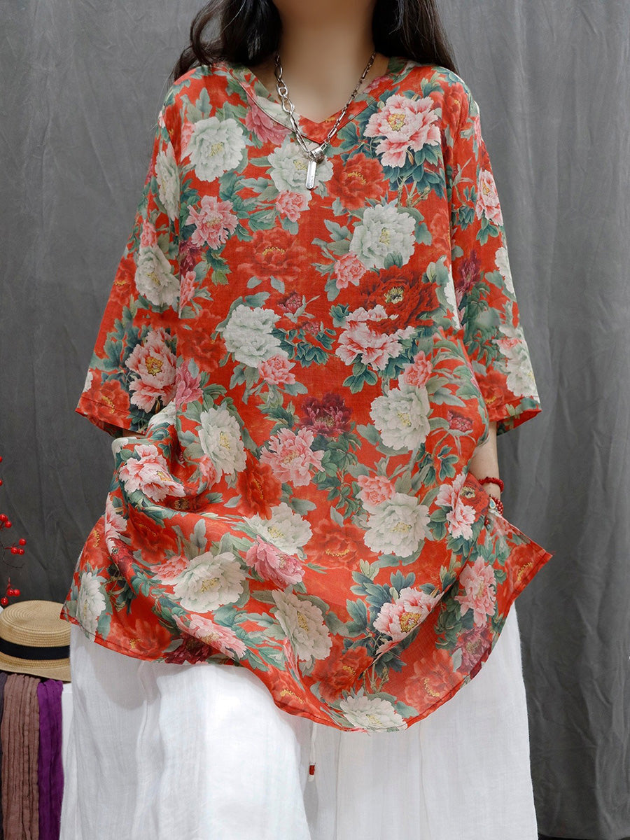 Women Spring Artsy Flower 100%Ramie V-Neck Blouse