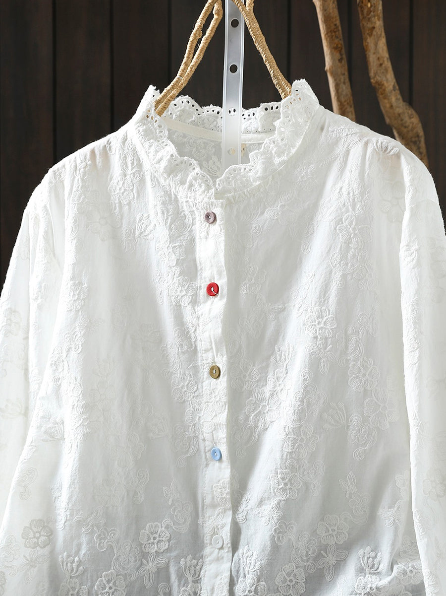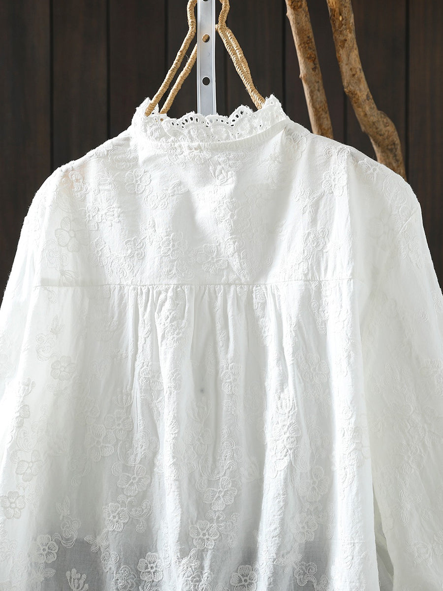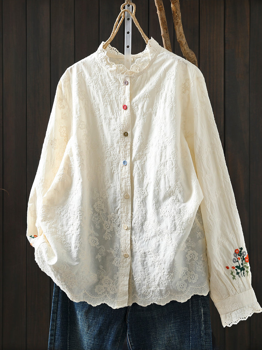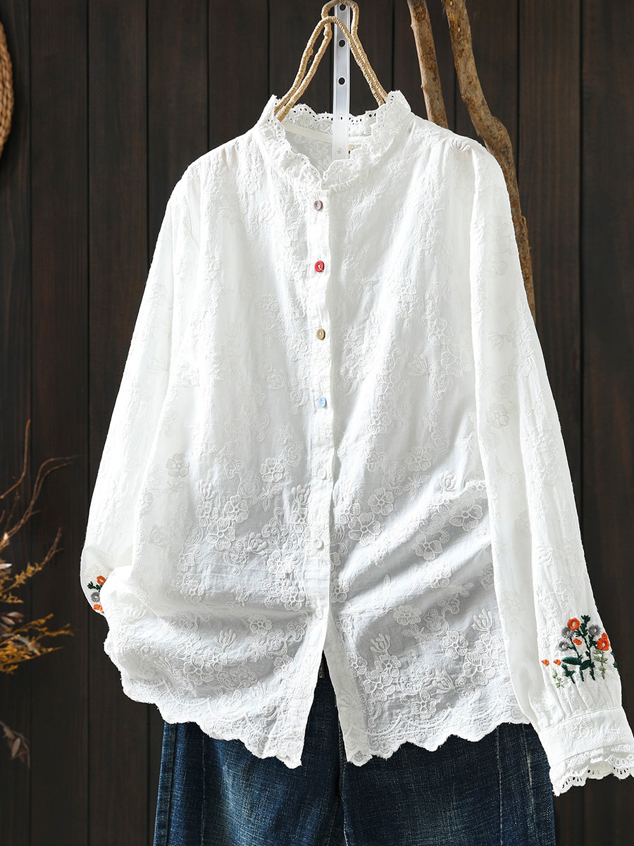 Women Spring Artsy Flower Embroidery 100%Cotton Shirt
