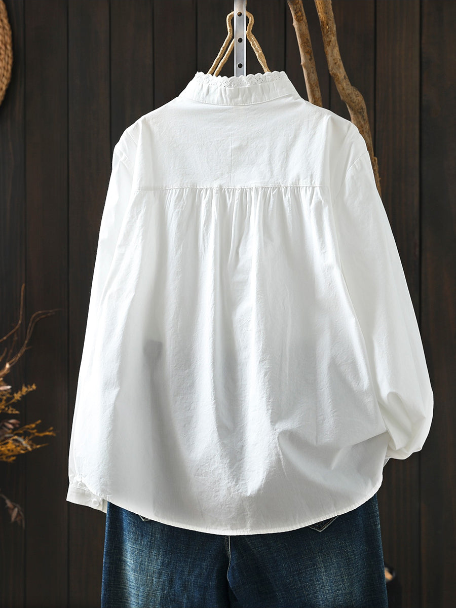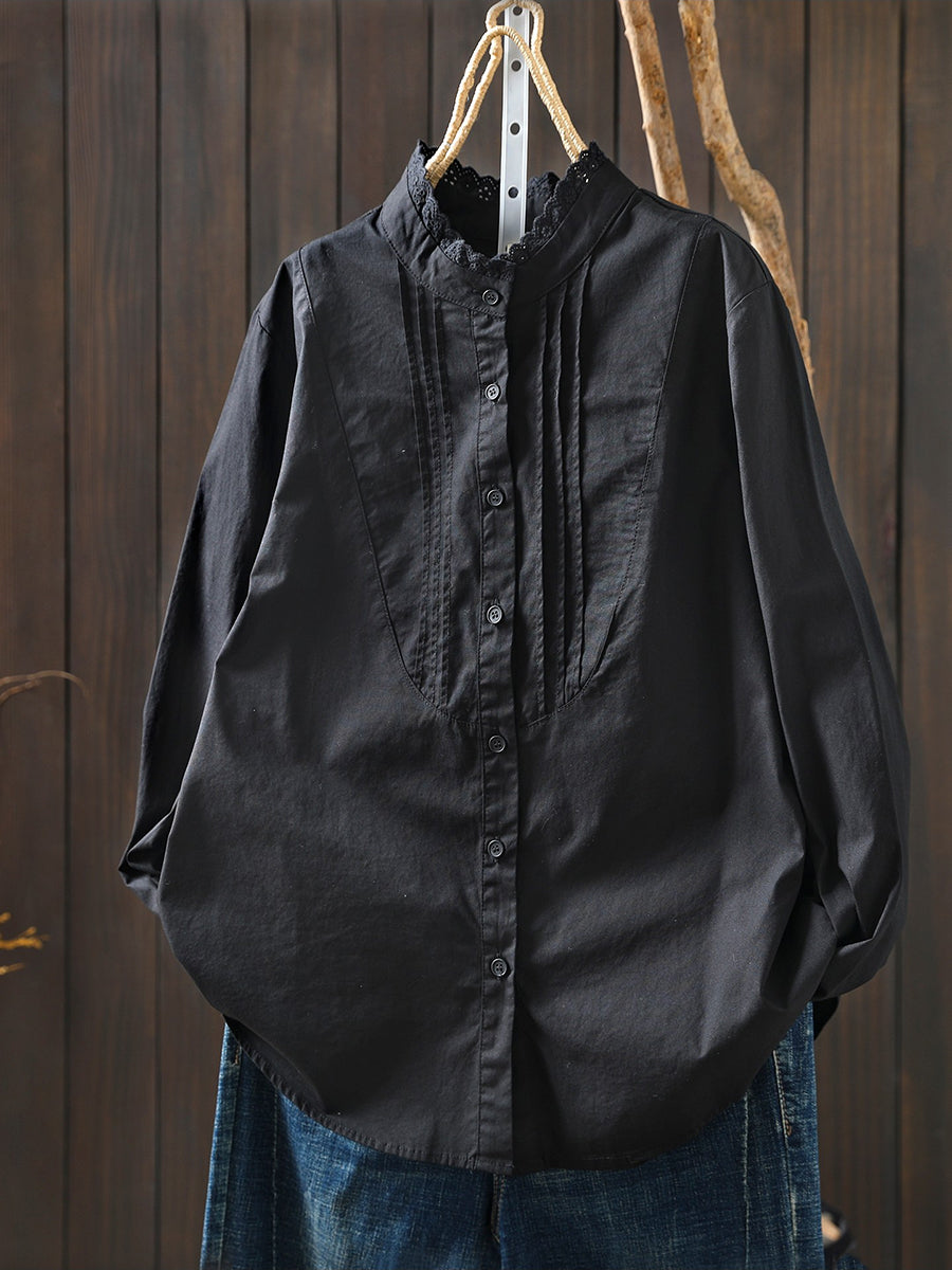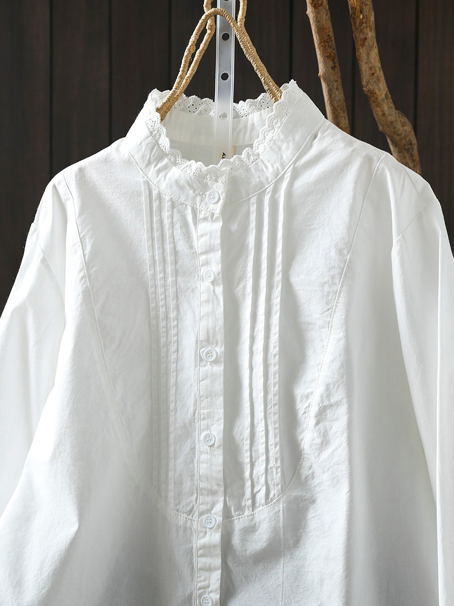 Women Spring Artsy Shirred 100%Cotton Stand Collar Shirt