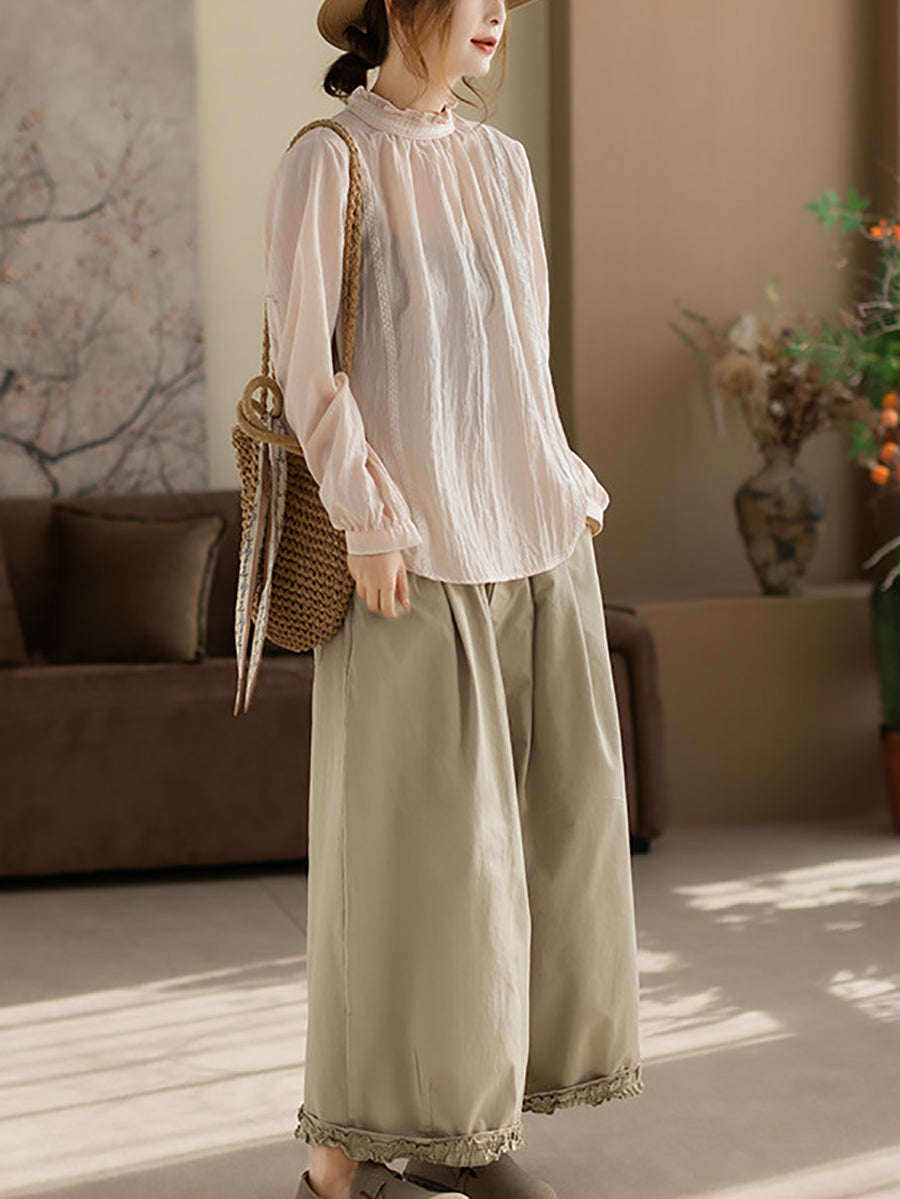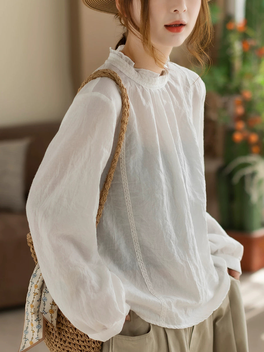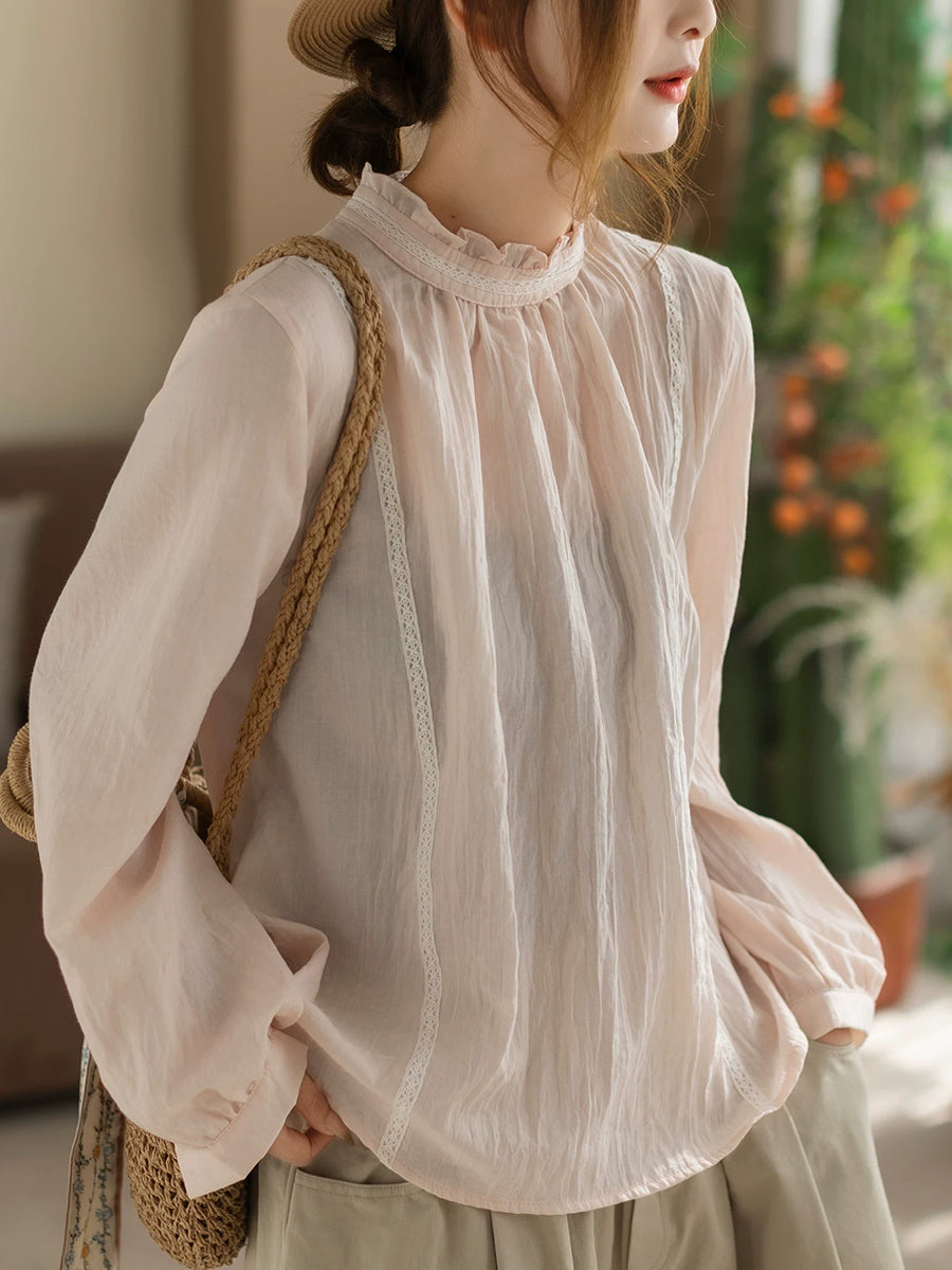 Women Spring Artsy Pure Color Cotton Stand Collar Blouse