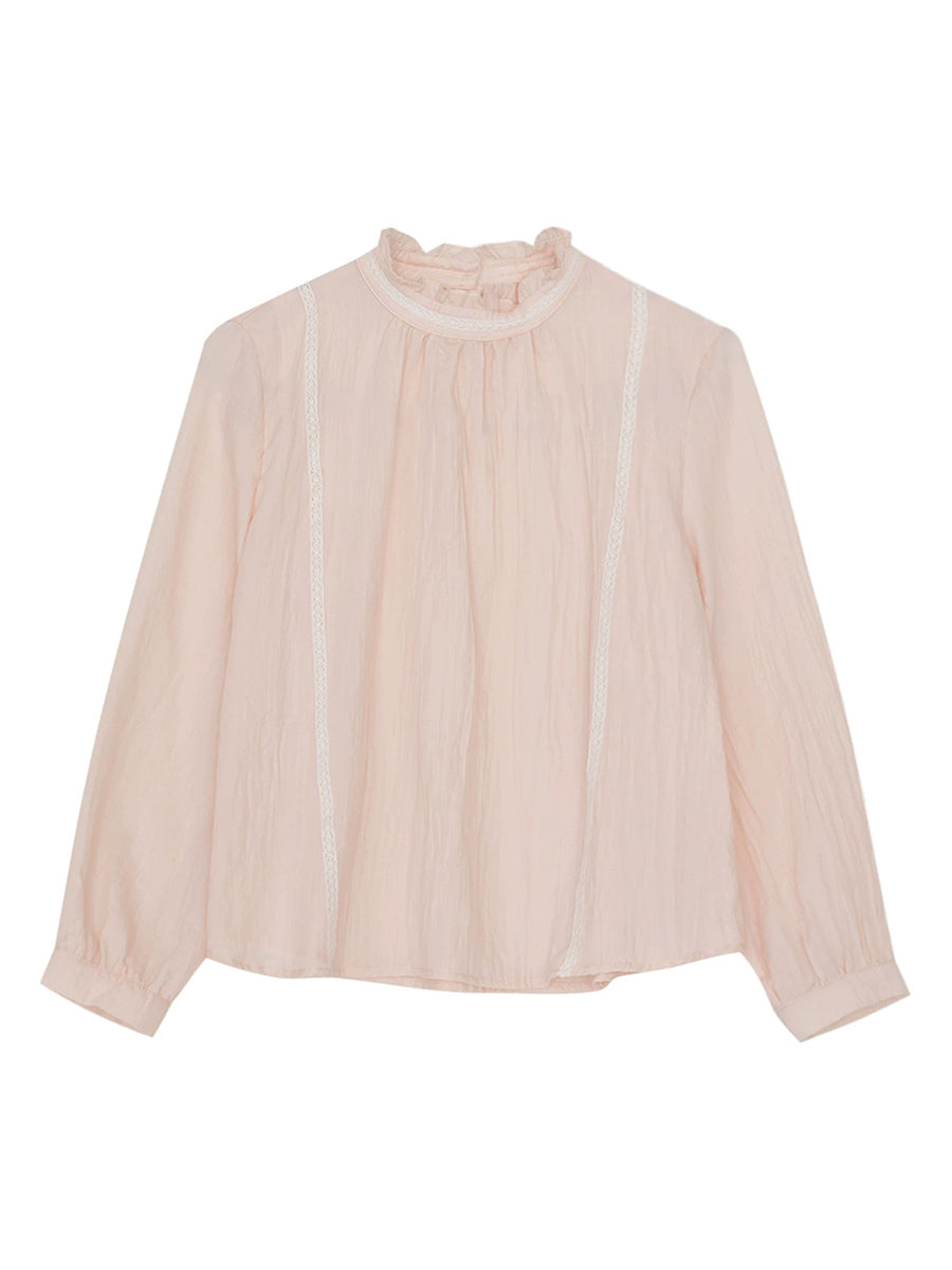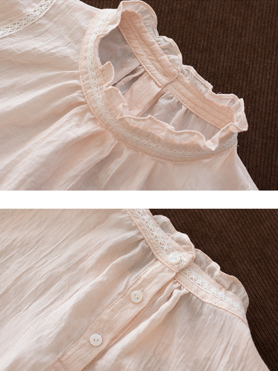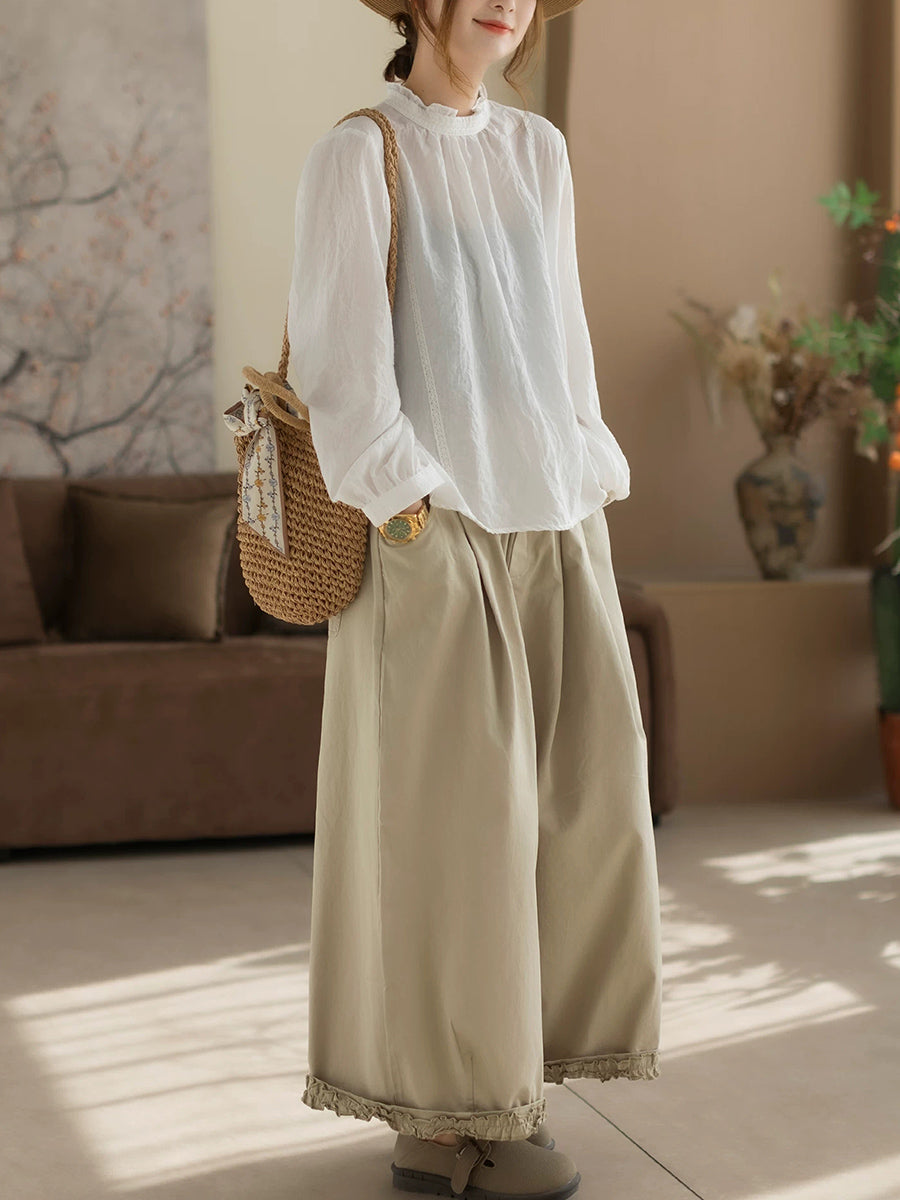 Women Spring Artsy Pure Color Cotton Stand Collar Blouse