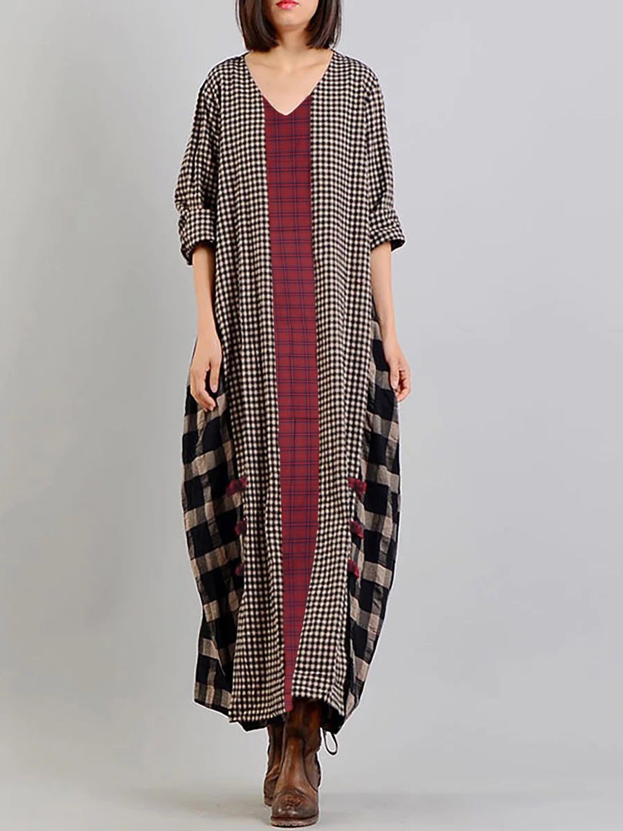 Plus Size Different Colored Plaid Retro Cotton Linen Dress