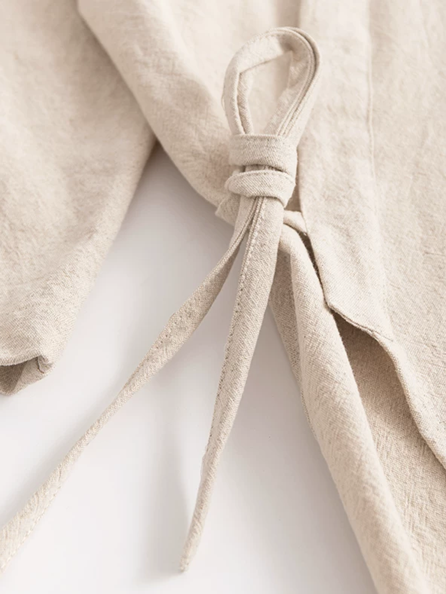 Crafted from a premium blend of 70% cotton and 30% linen, this loose-fit garment offers a soft, breathable feel that is perfect for everyday wear. Its minimalist design features a refined neckline that elegantly frames the neck, while the side ties ensure comfort and security. Enjoy effortless style and comfort with this versatile piece.