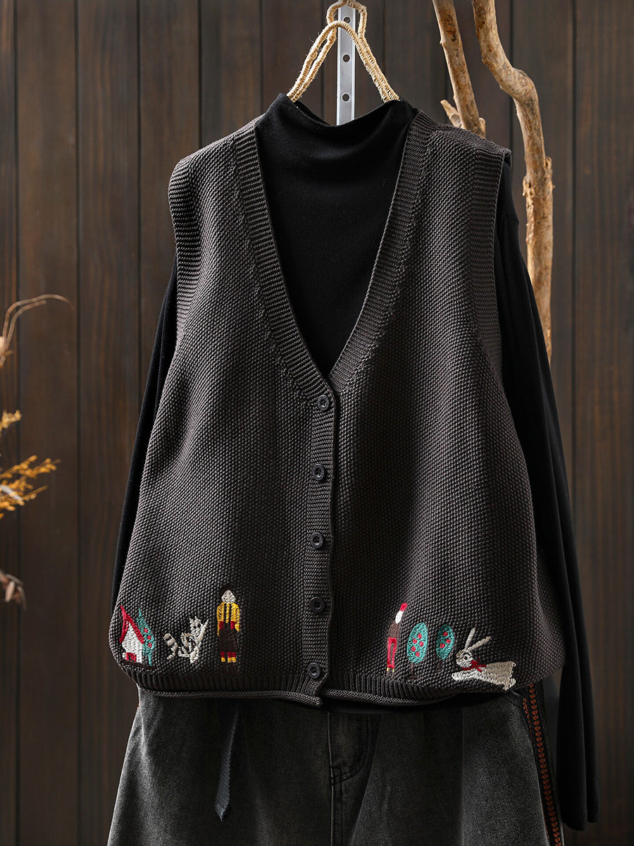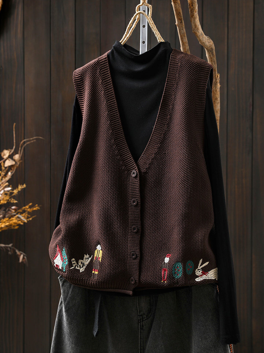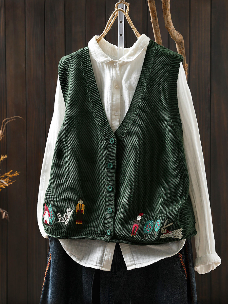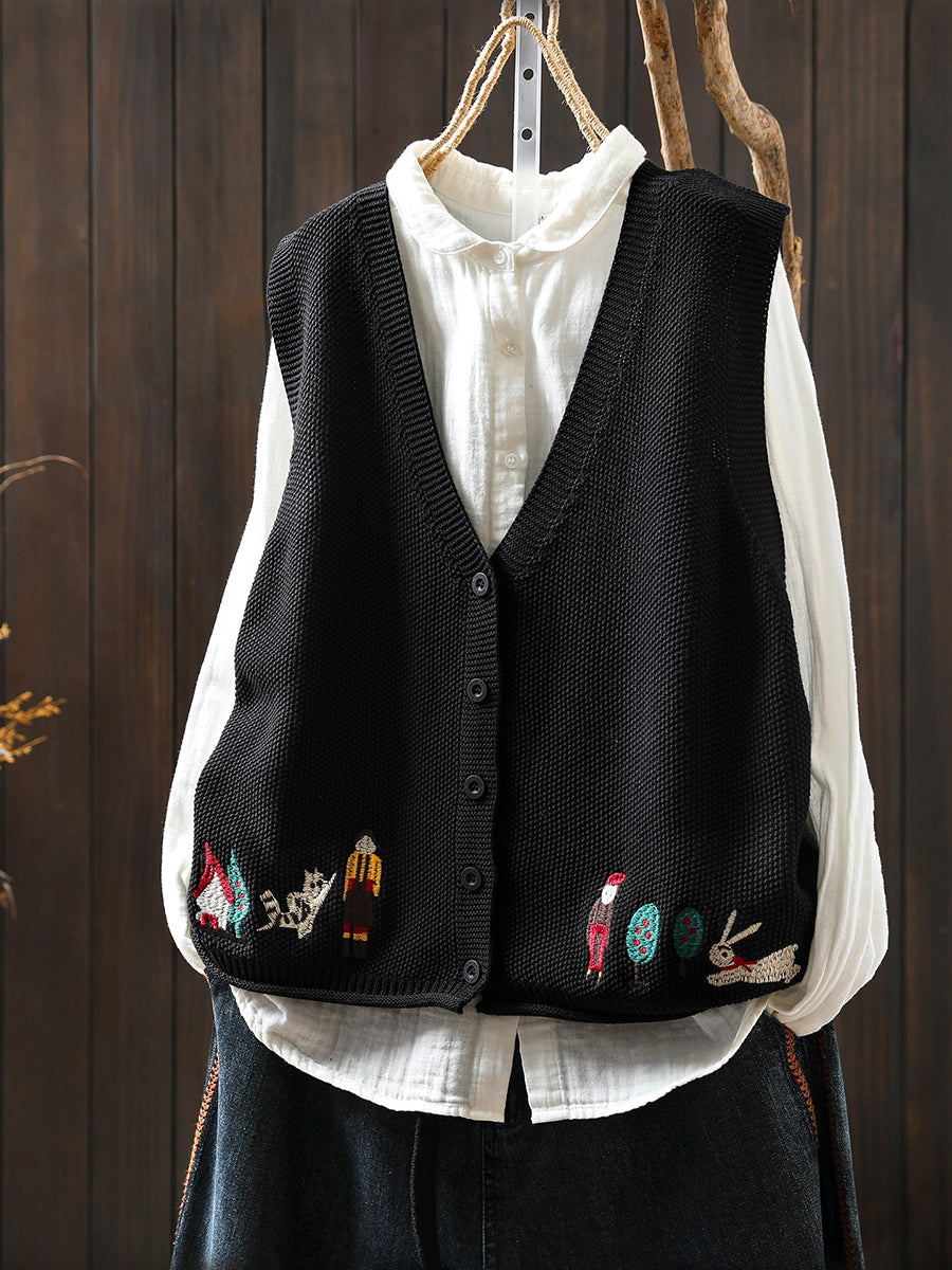 Women Artsy Autumn Embroidery V-Neck Knitted Vest