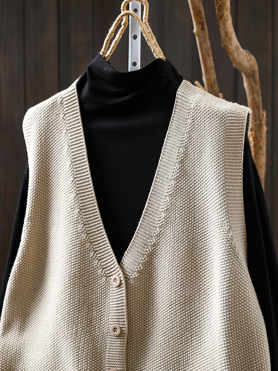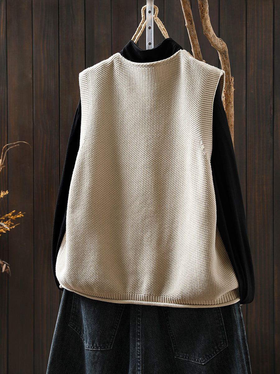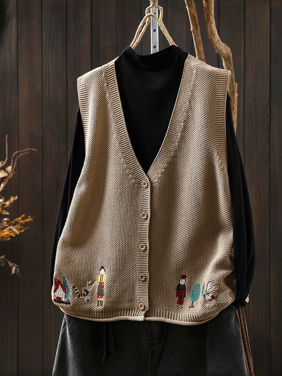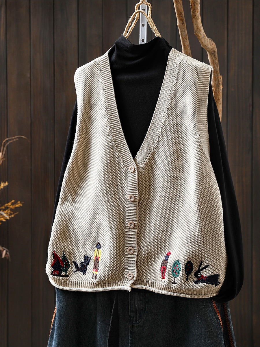 Women Artsy Autumn Embroidery V-Neck Knitted Vest