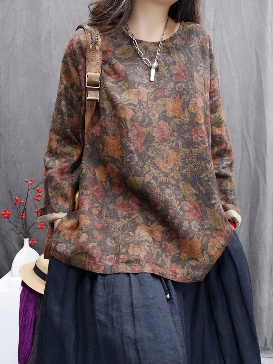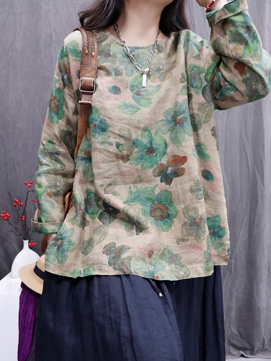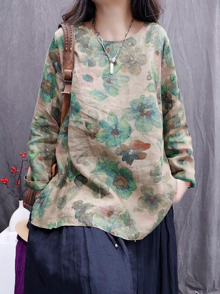 Women Artsy Spring Flower O-Neck 100%Linen Blouse