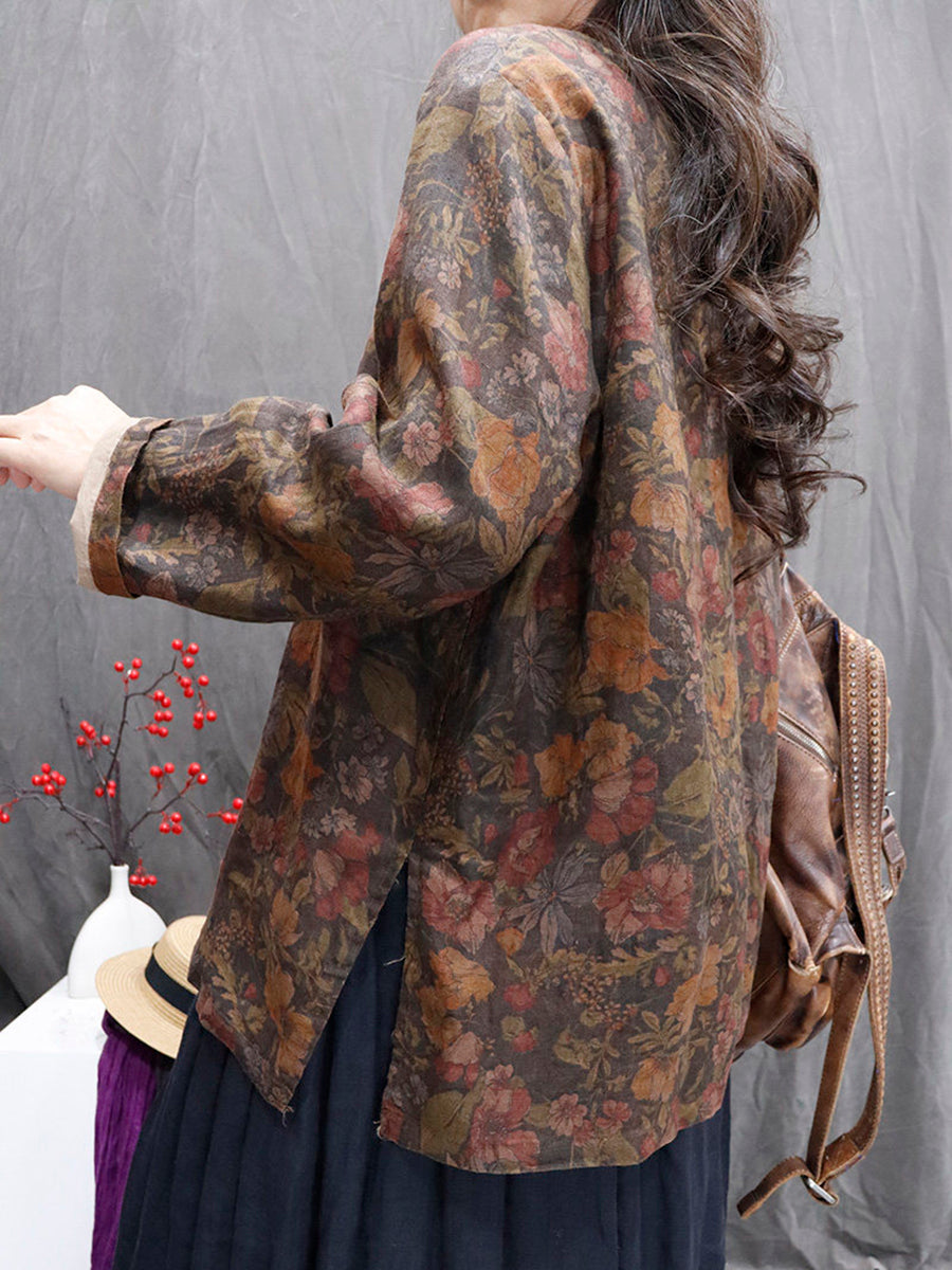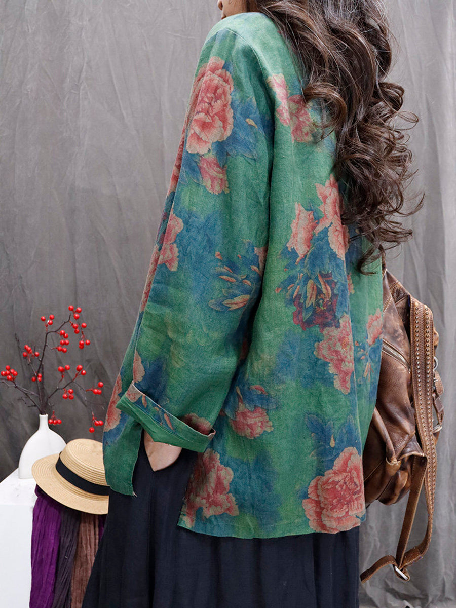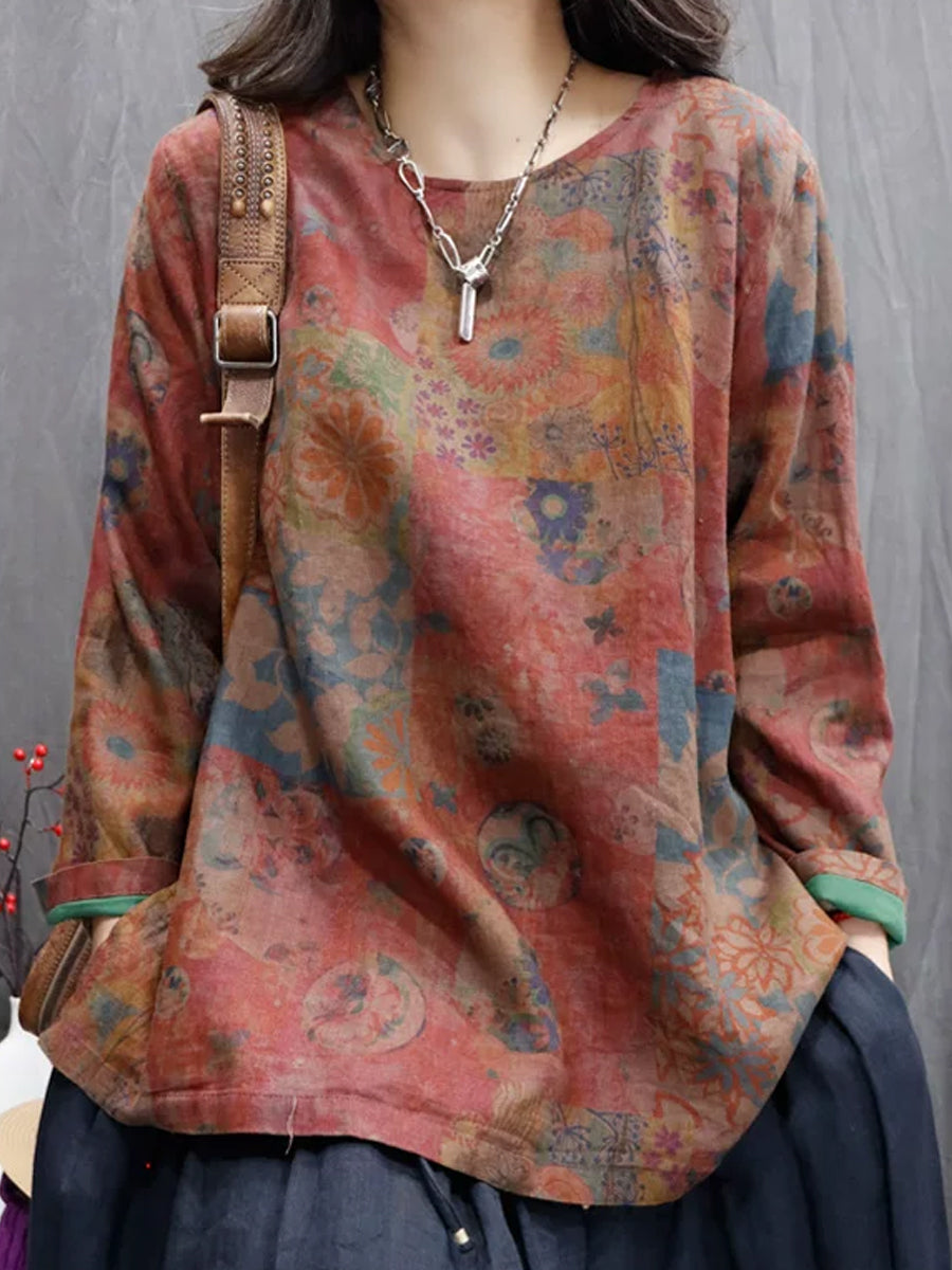 Women Artsy Spring Flower O-Neck 100%Linen Blouse