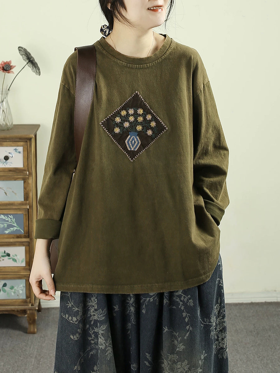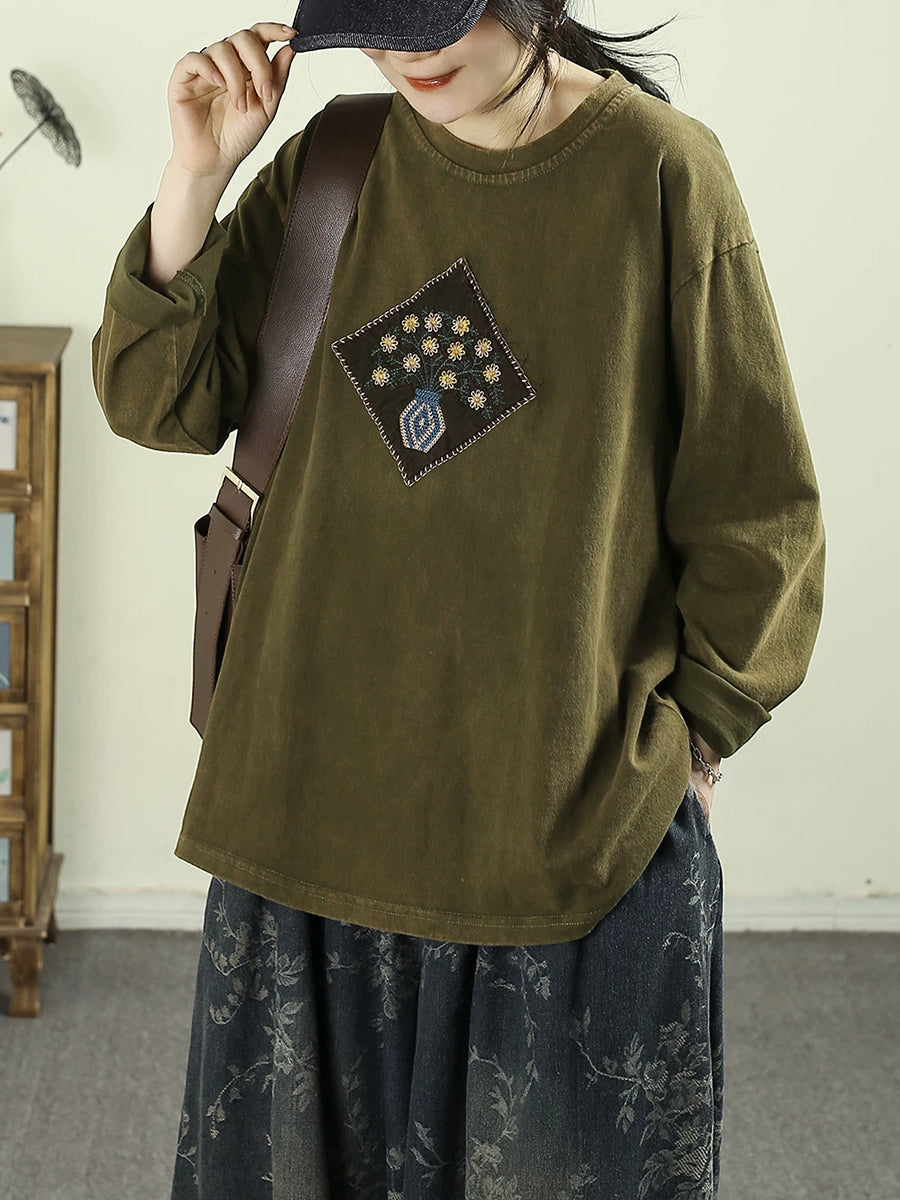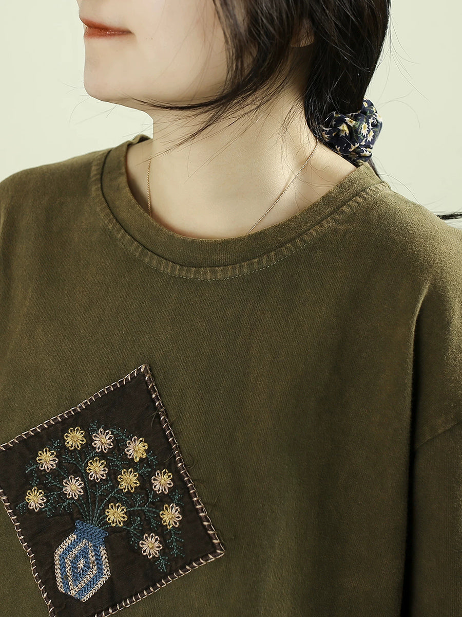 Women Artsy Spring Flower Patch Cotton O-Neck Blouse