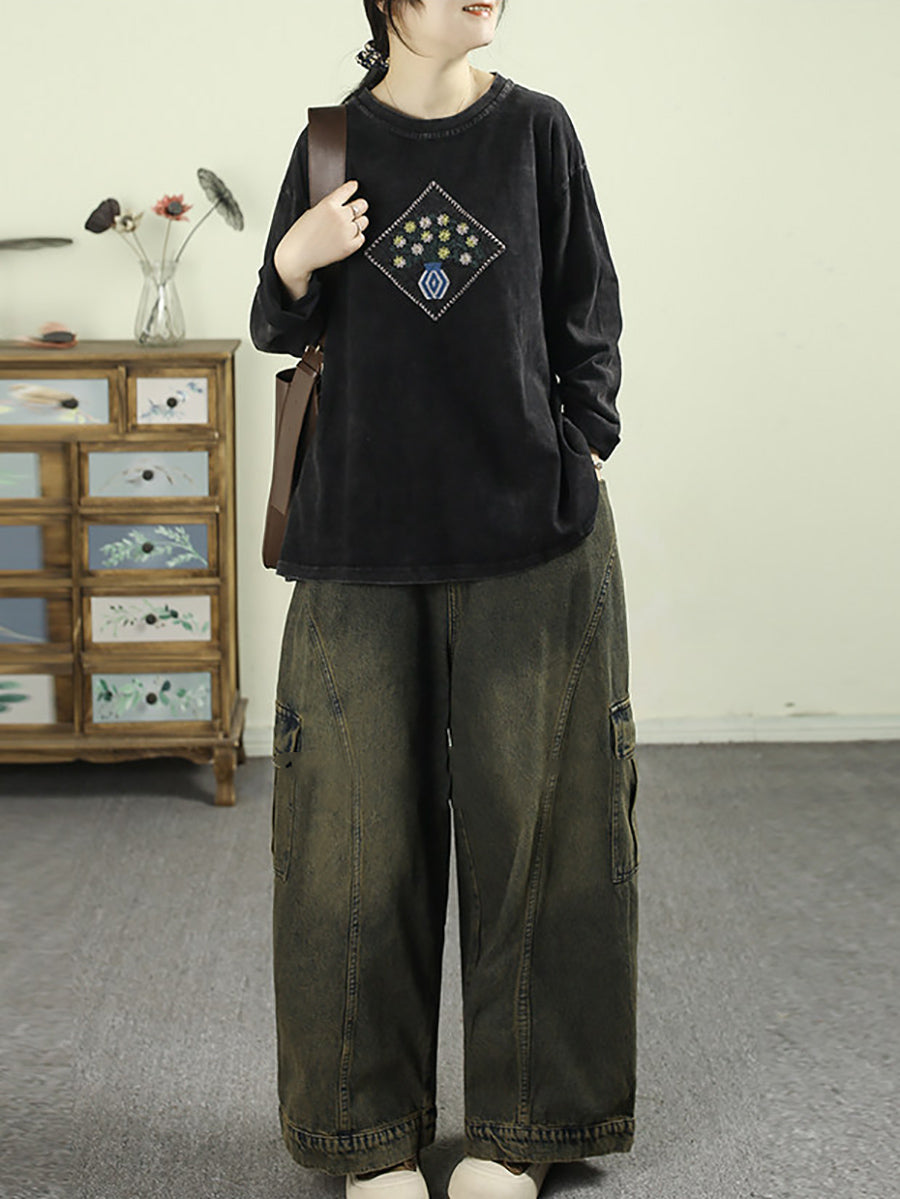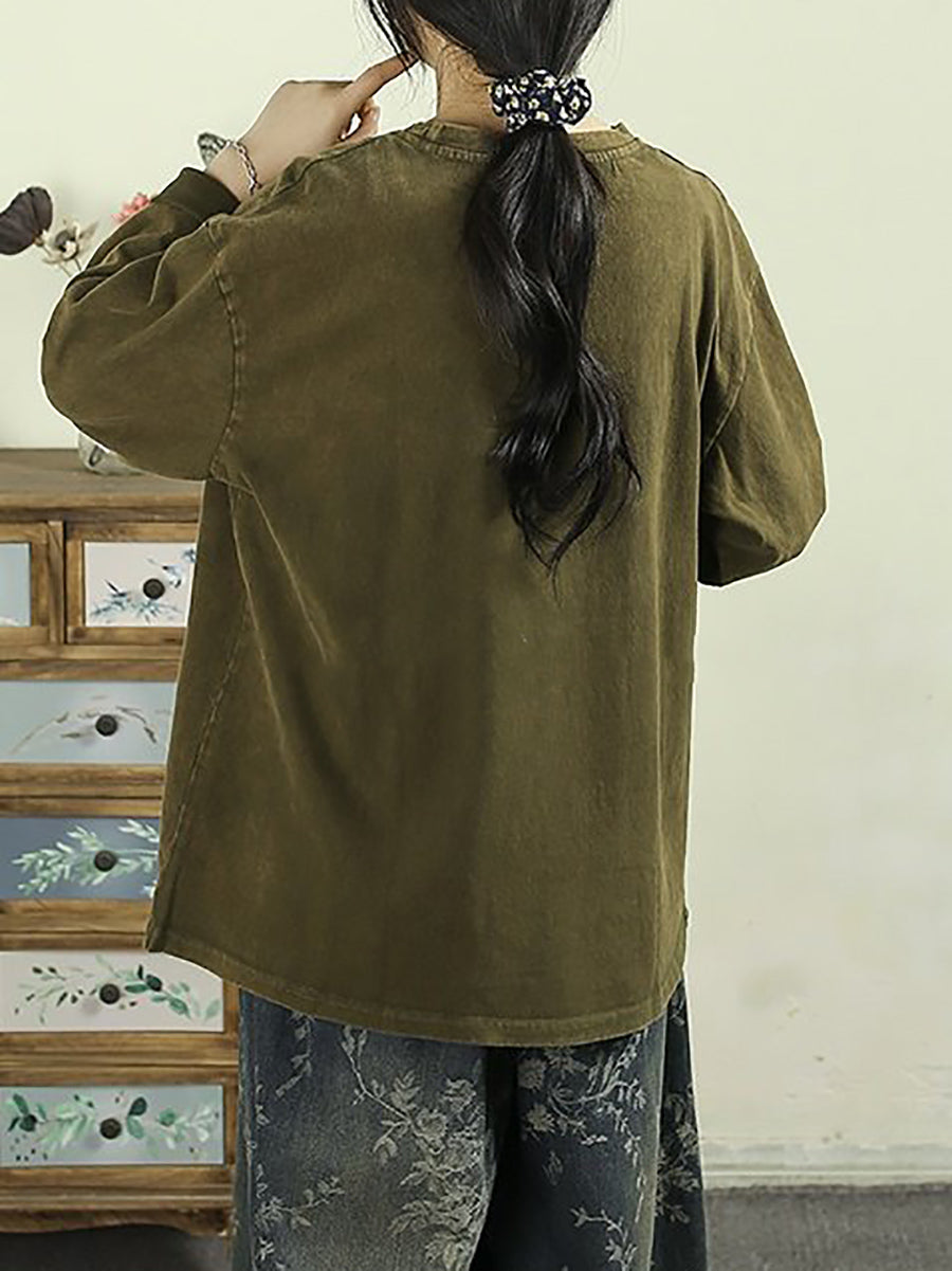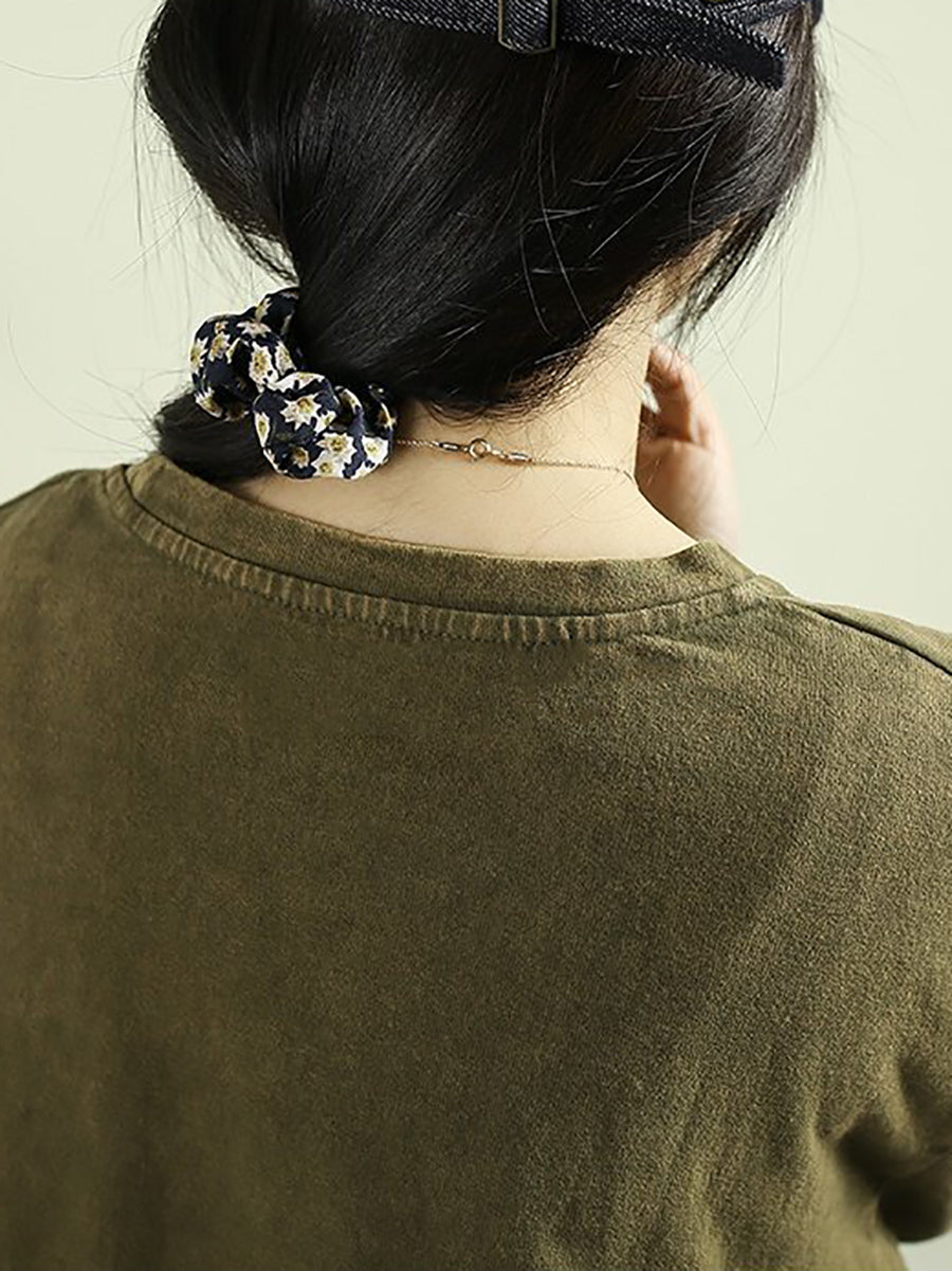 Women Artsy Spring Flower Patch Cotton O-Neck Blouse
