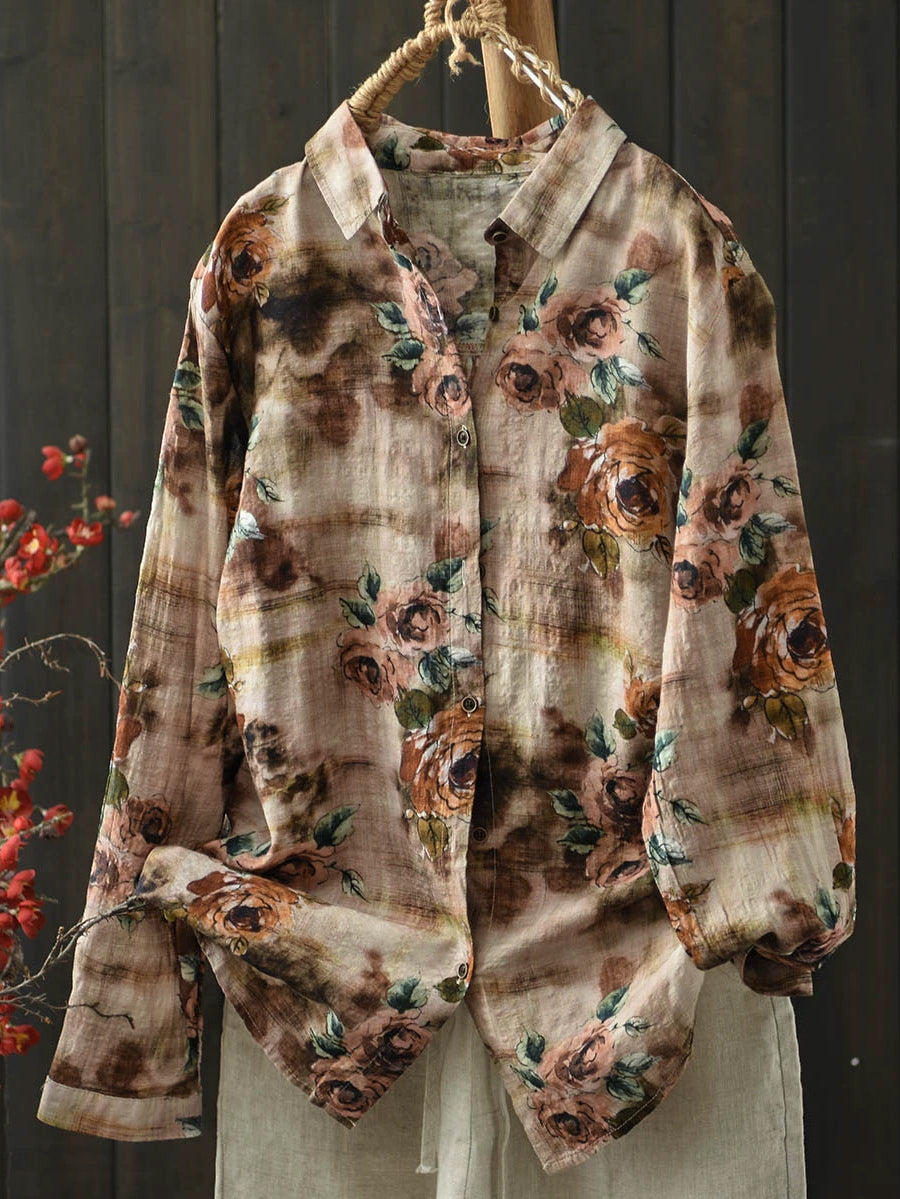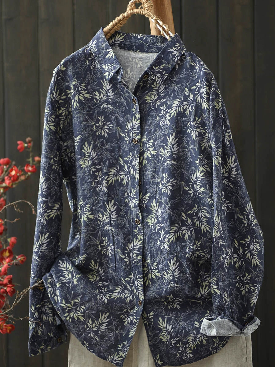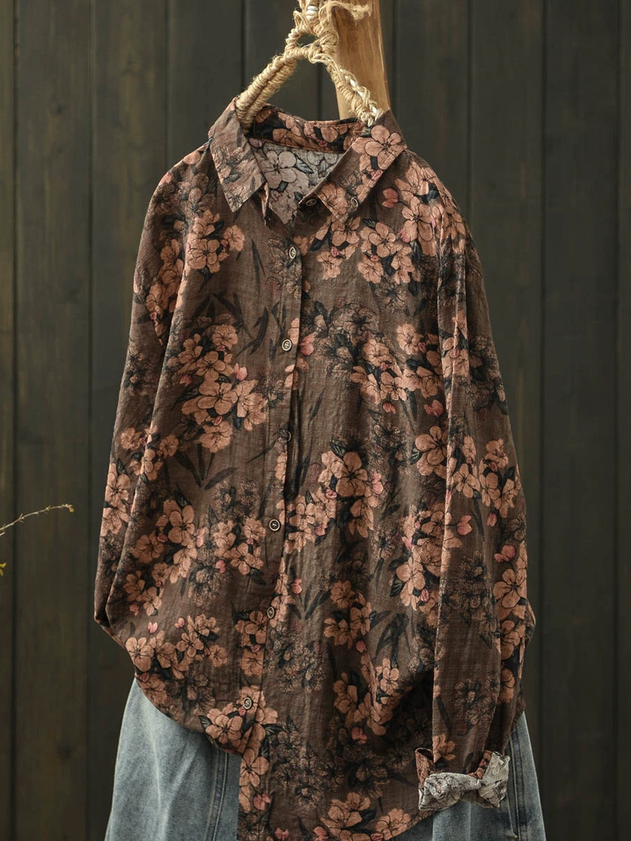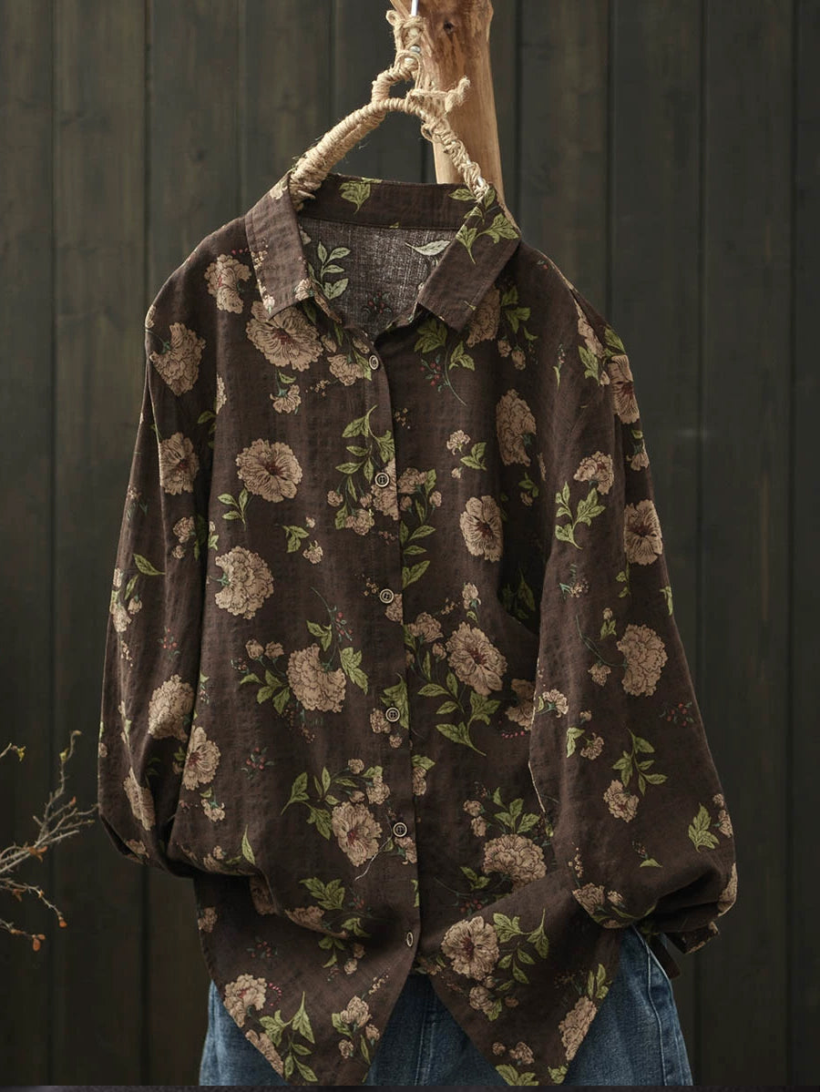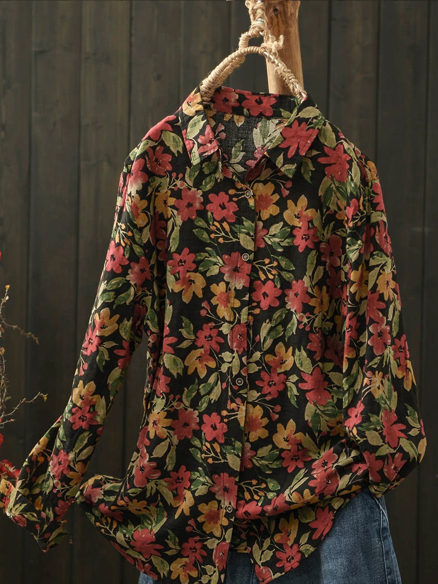 Women Artsy Spring Flower Turn-down Collar Cotton Blouse