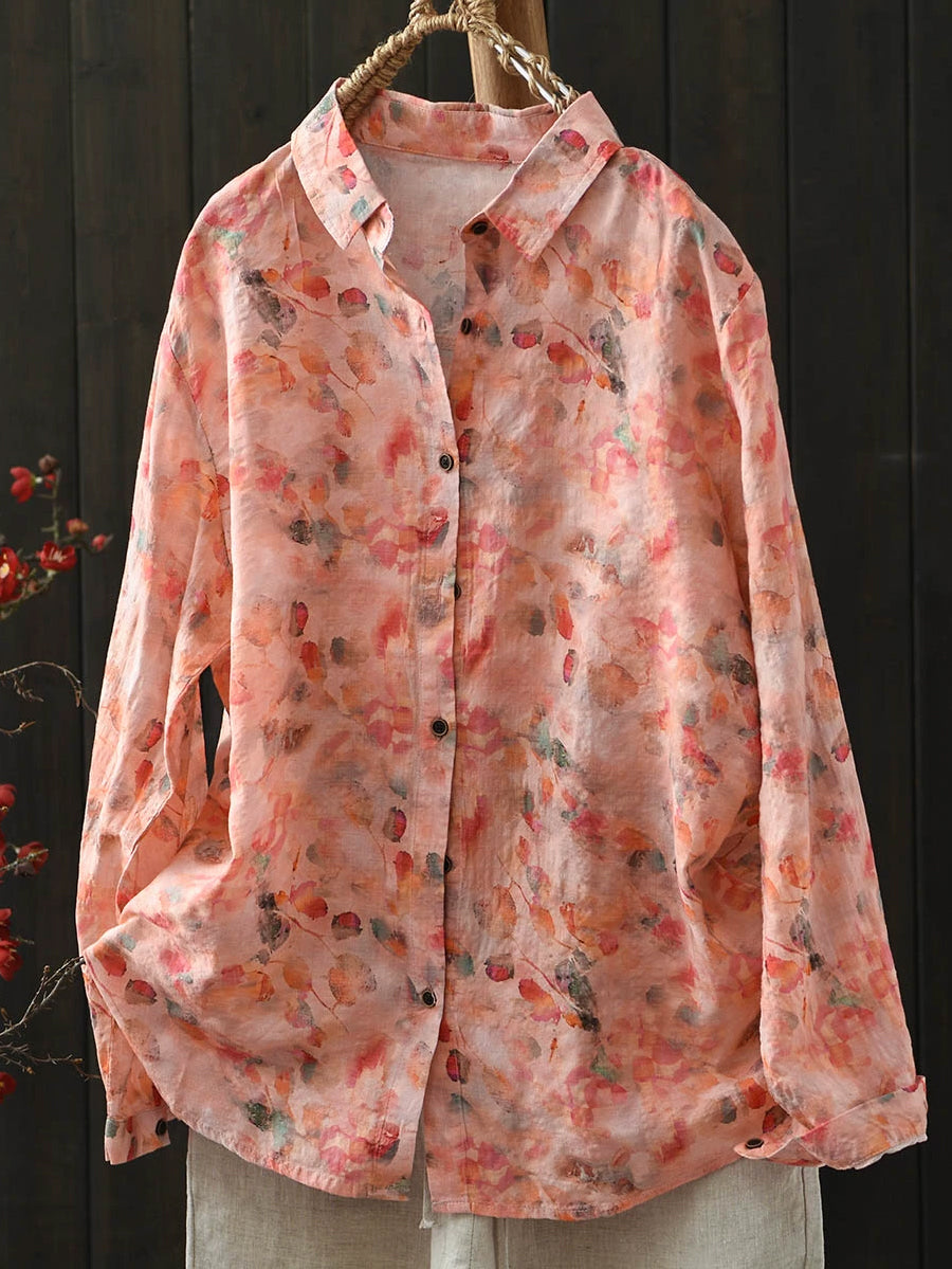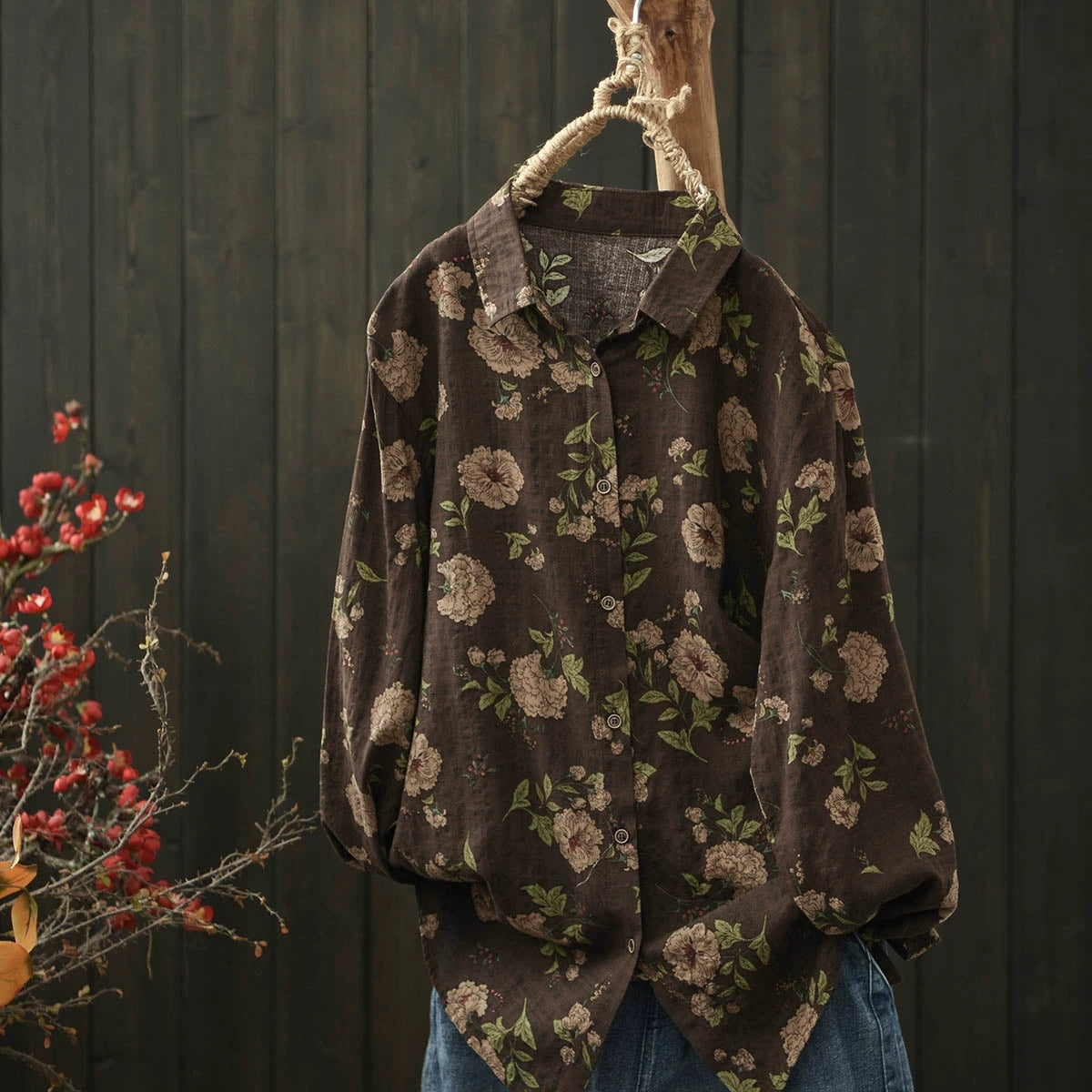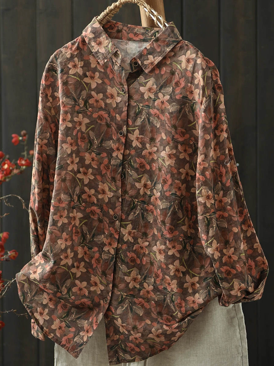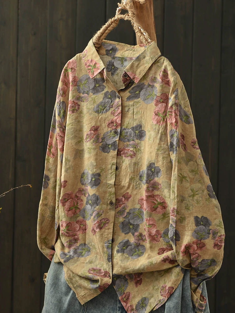 Women Artsy Spring Flower Turn-down Collar Cotton Blouse