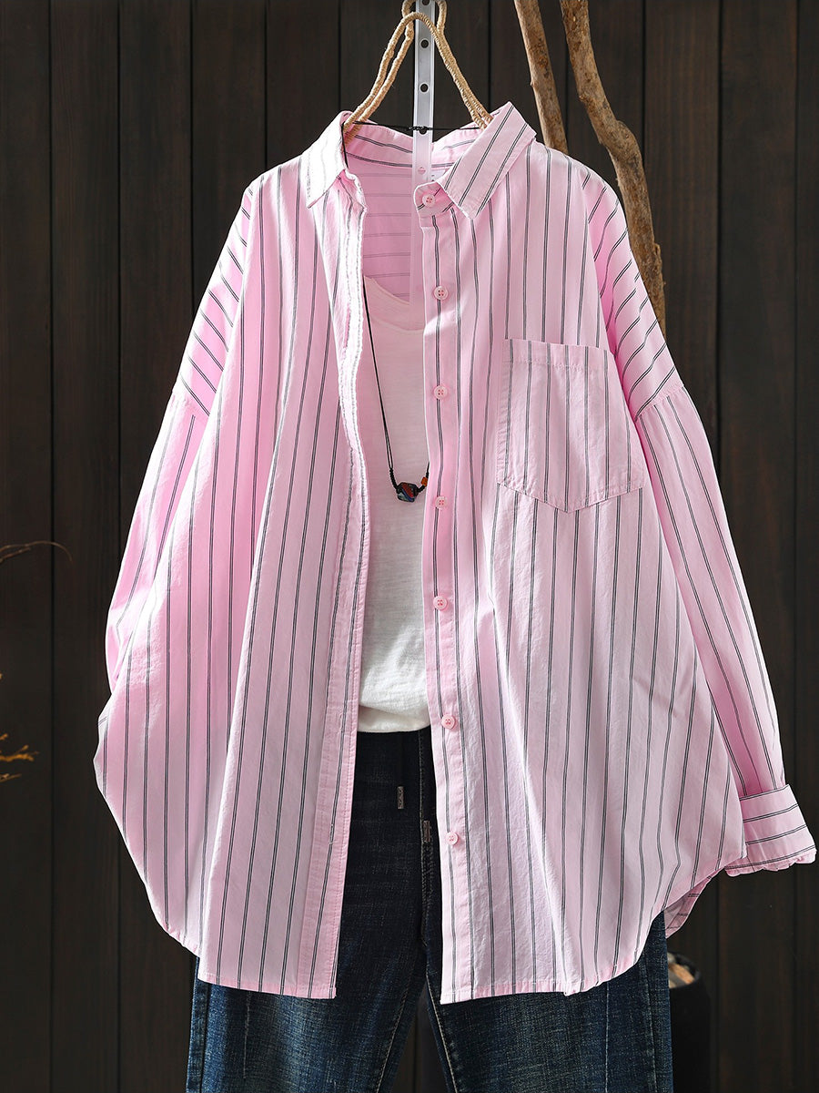 Women Artsy Spring Stripe 100%Cotton Turn-down Collar Shirt