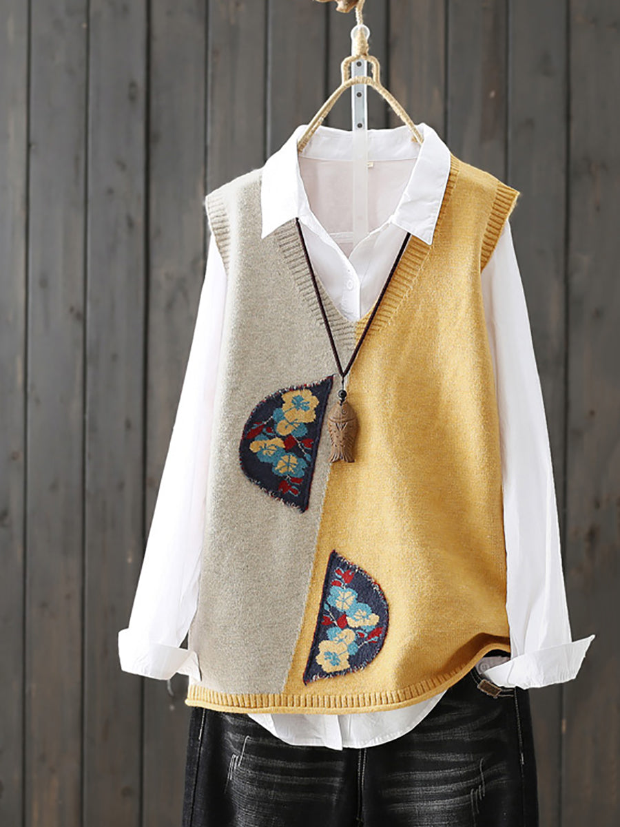 Women Autumn Artsy Colorblock V-Neck Knitted Vest