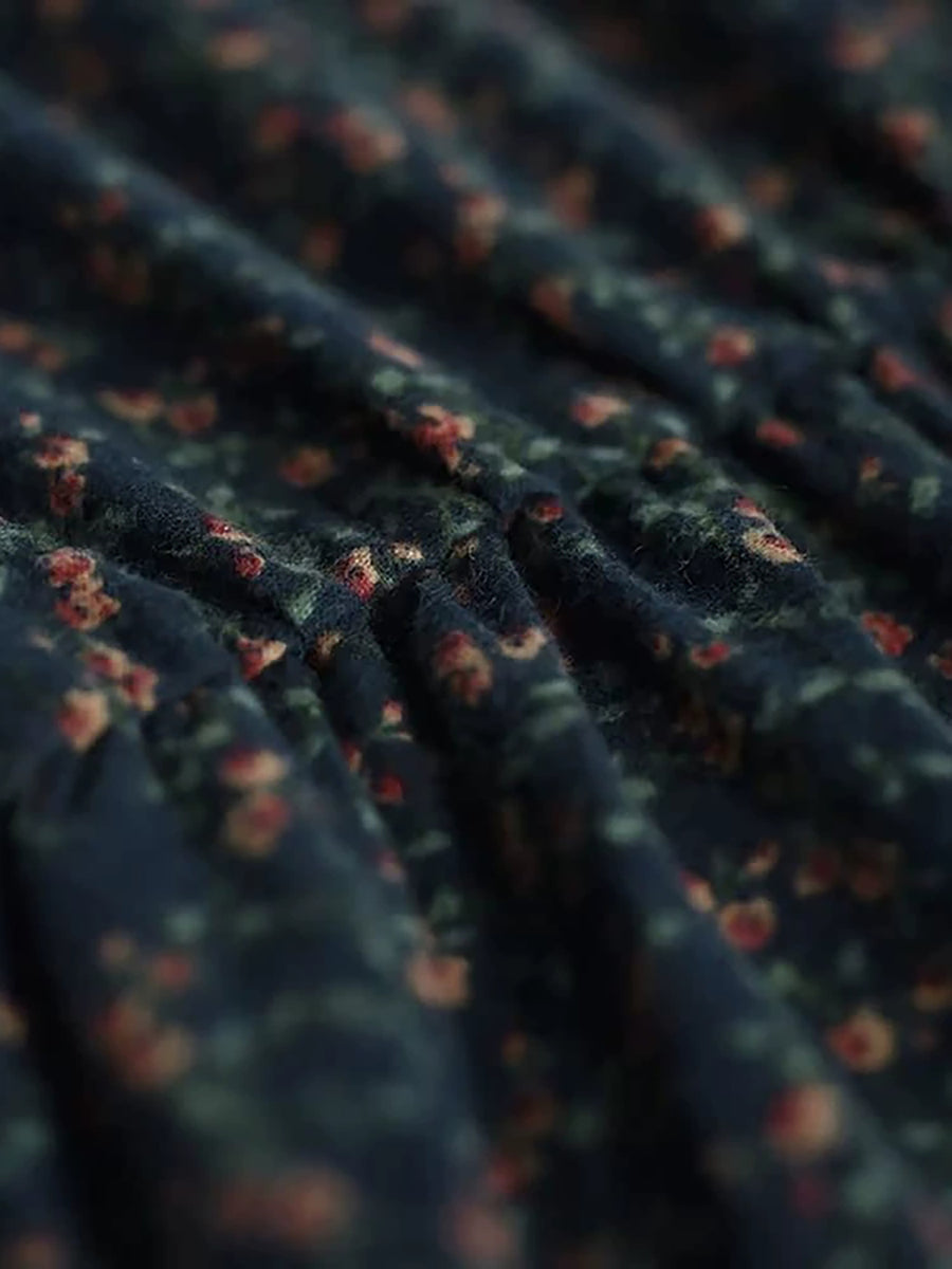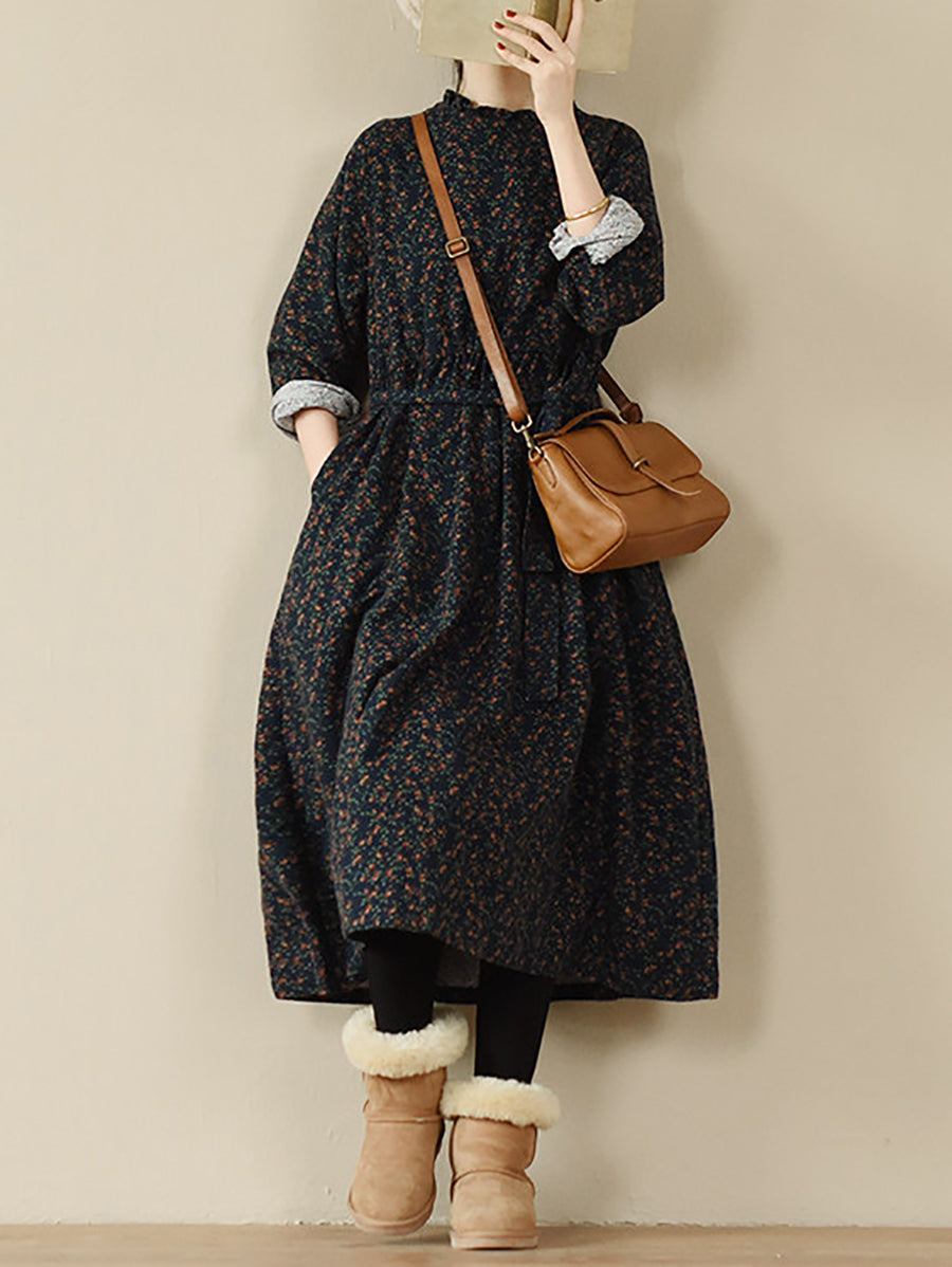 Women Autumn Artsy Floral Stand Collar Cotton Dress