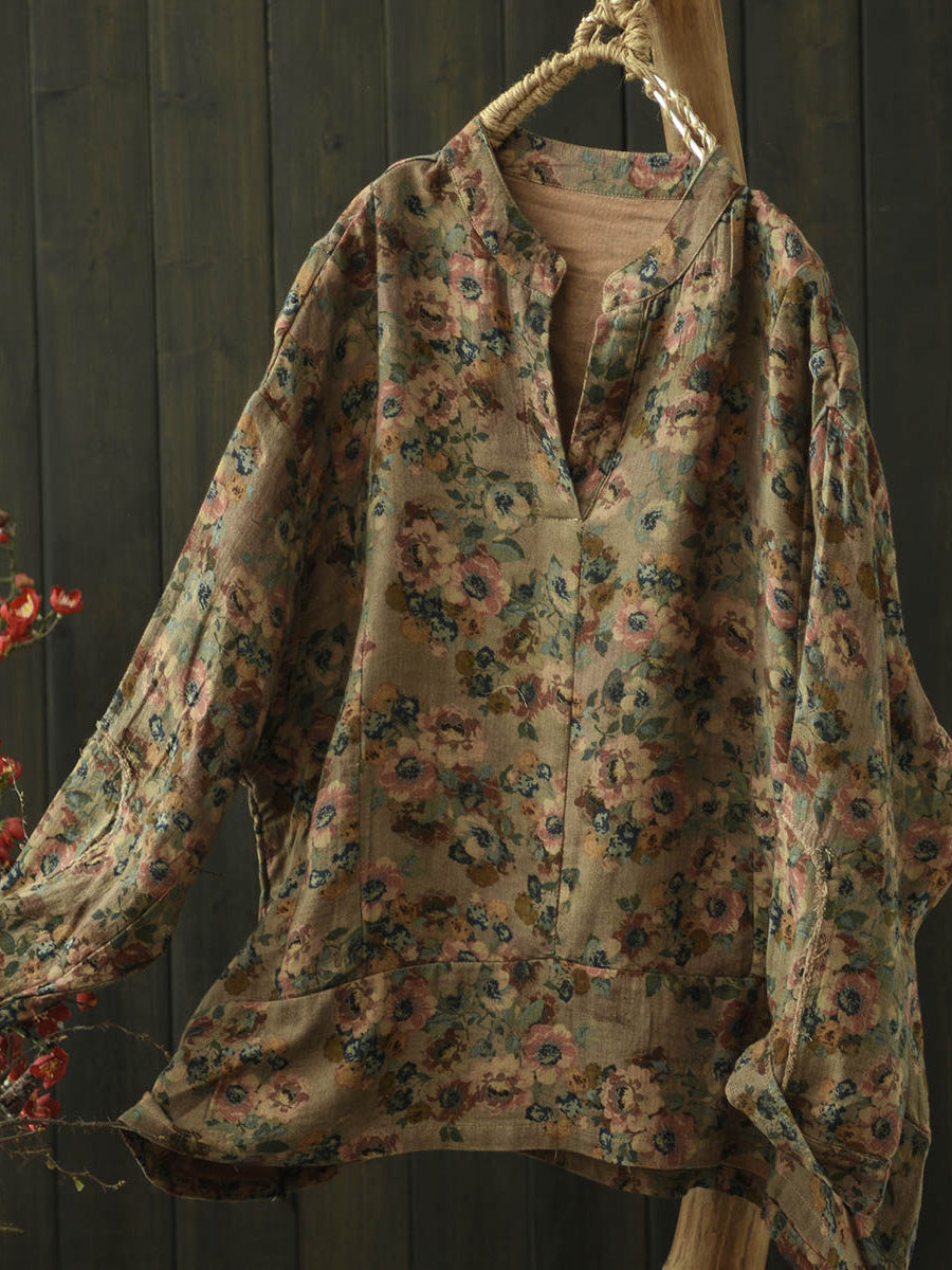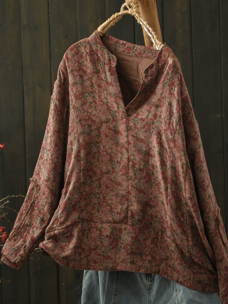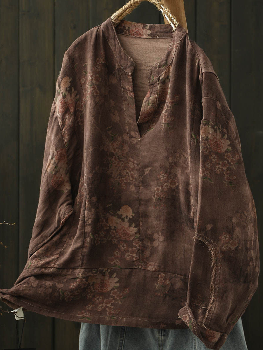 Women Autumn Artsy Flower V-Neck Cotton Blouse