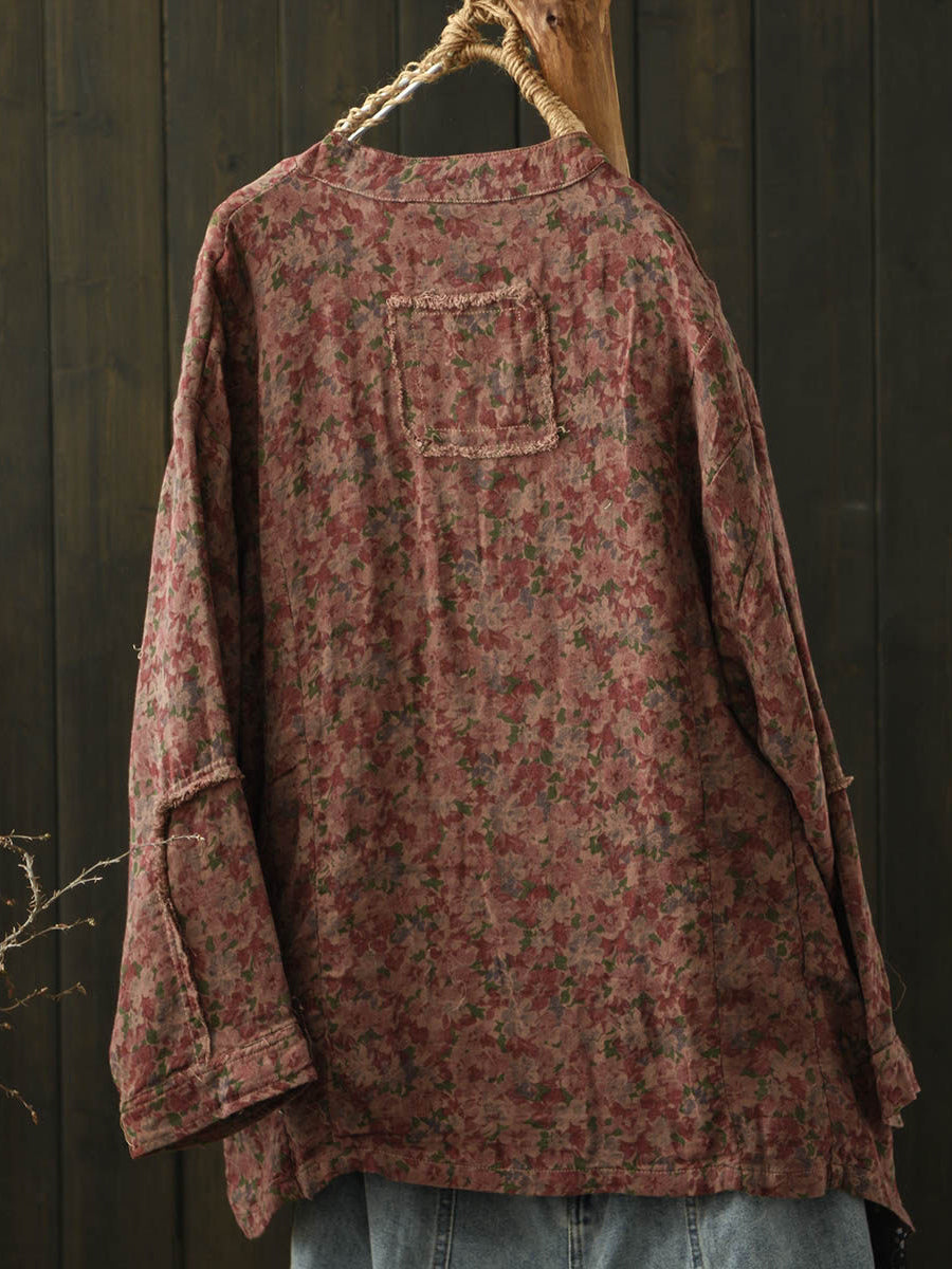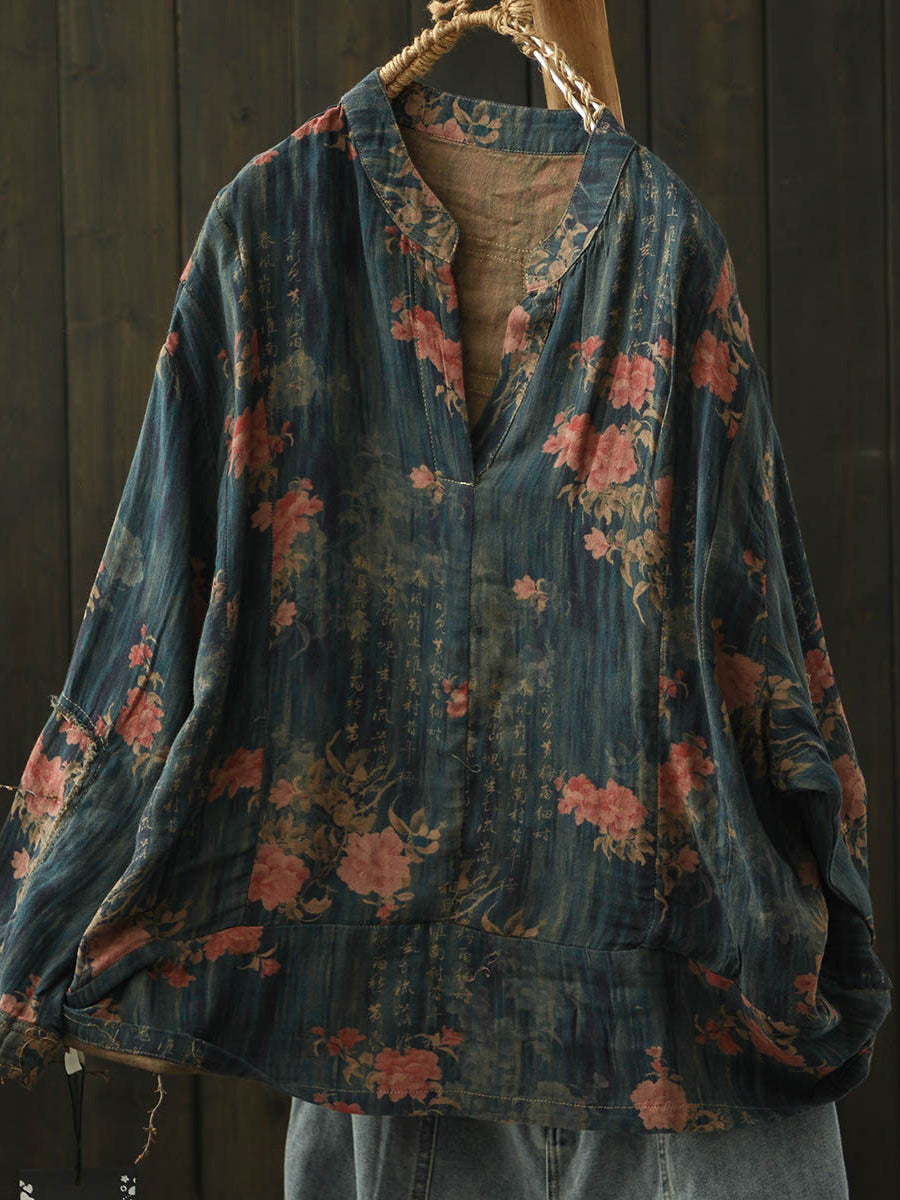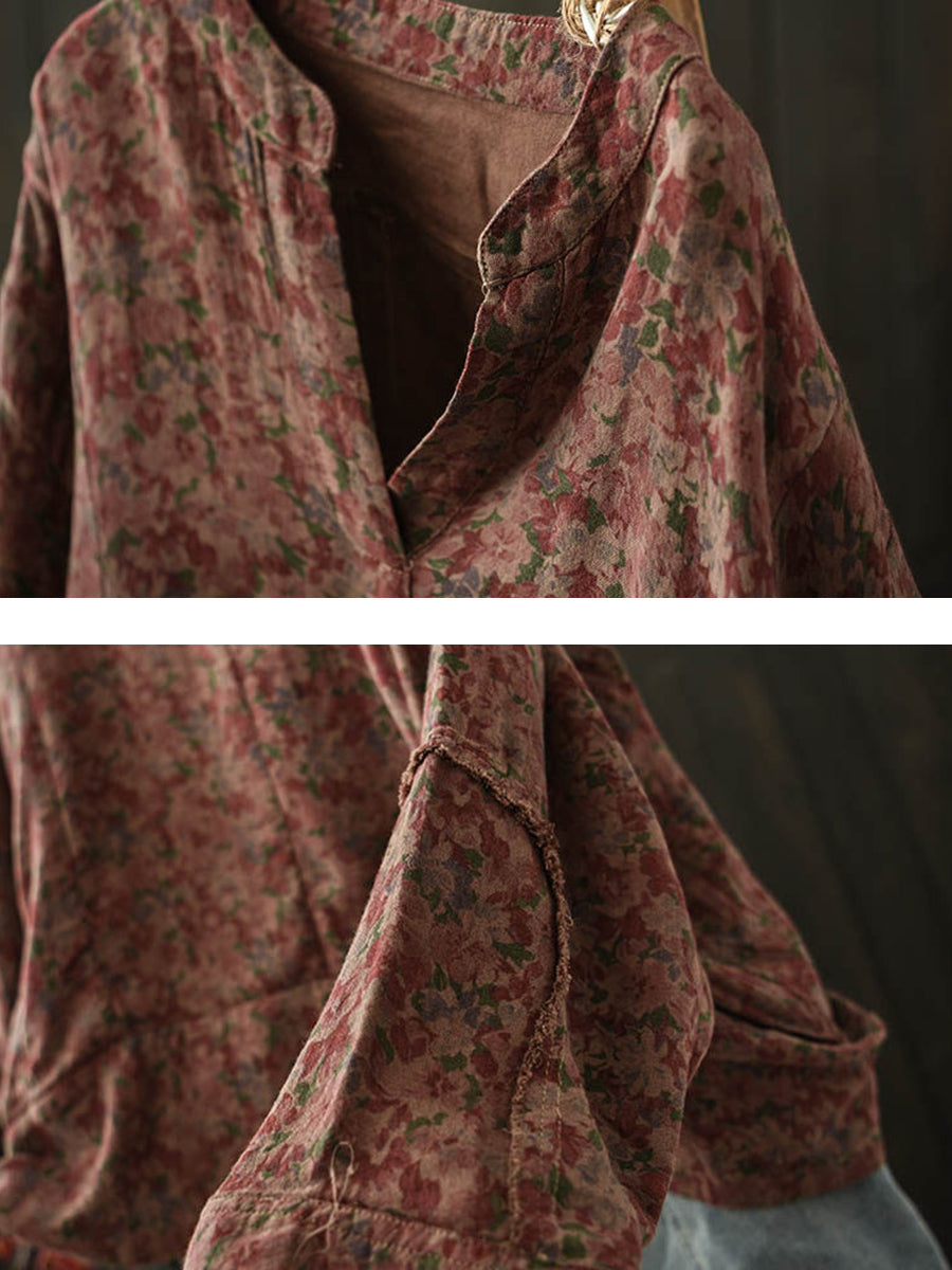 Women Autumn Artsy Flower V-Neck Cotton Blouse