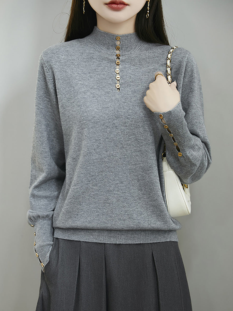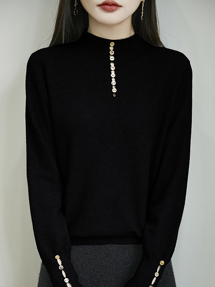 Women Autumn Artsy Pure Color Button Half-Turtleneck Sweater