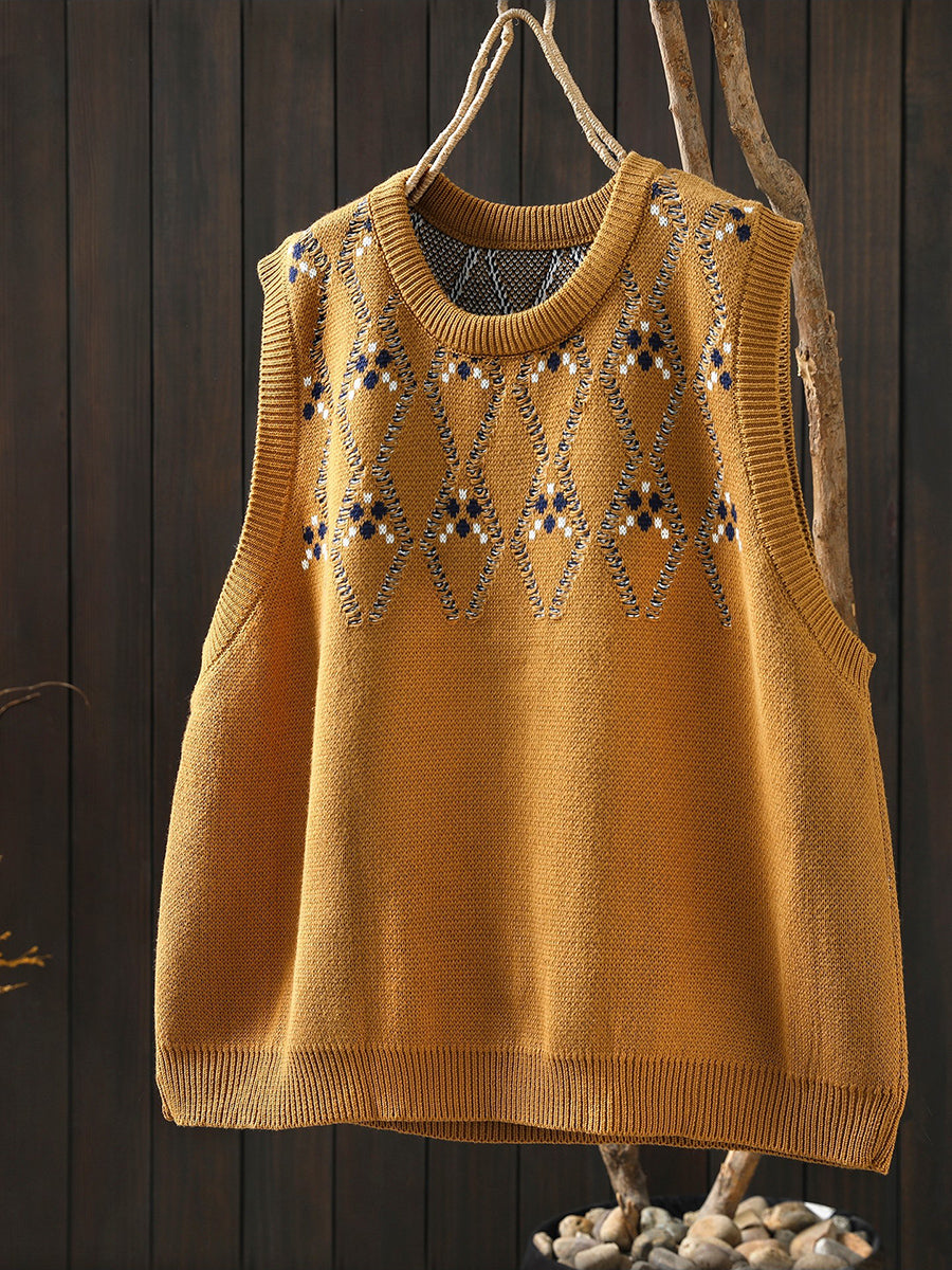 Women Autumn Artsy Rhomboids O-Neck Knitted Vest