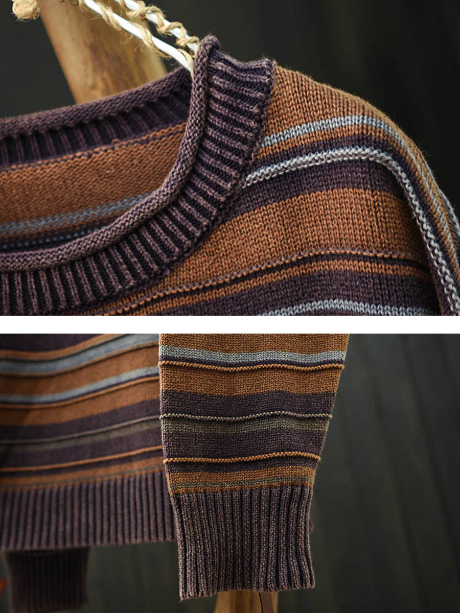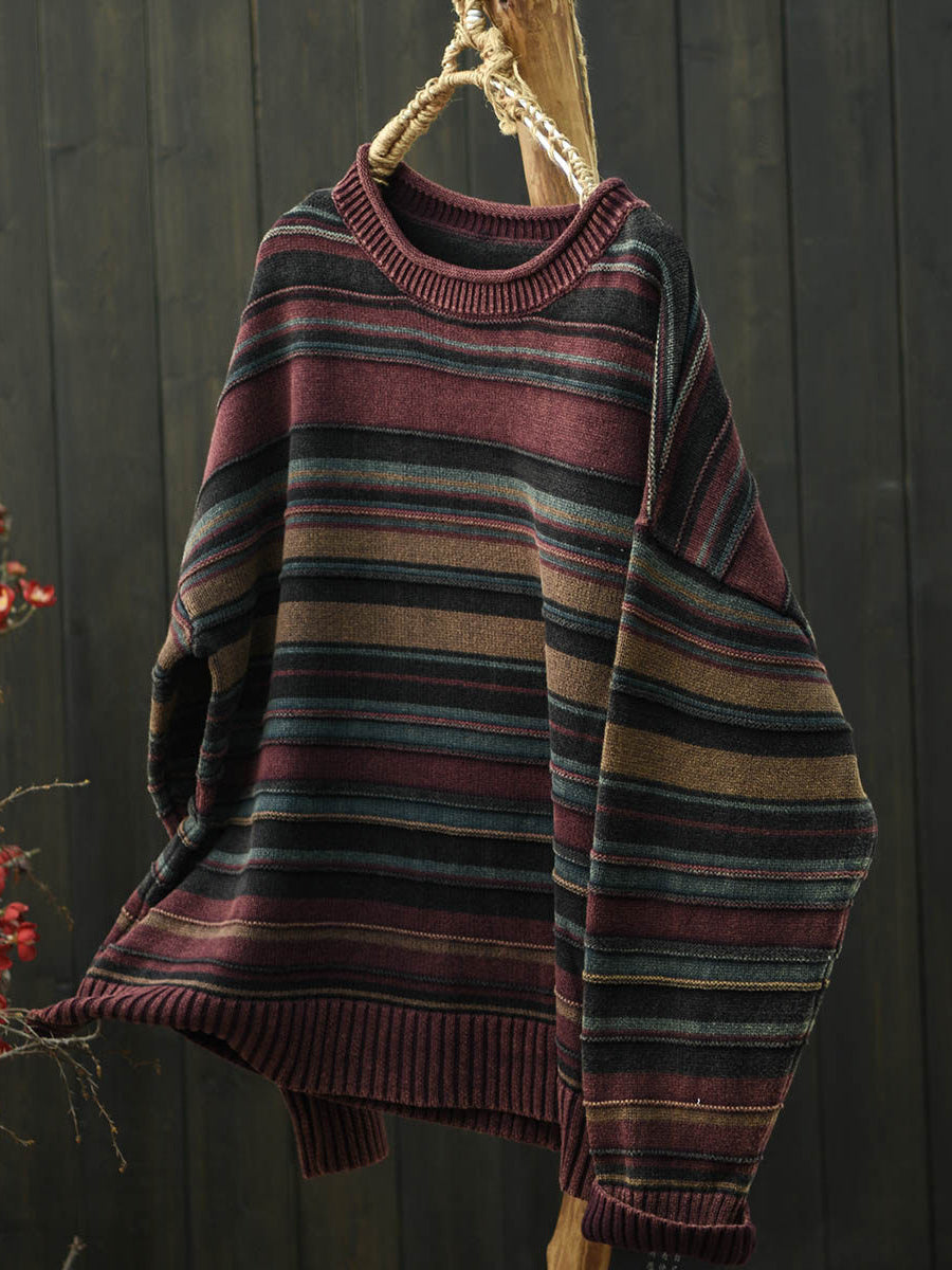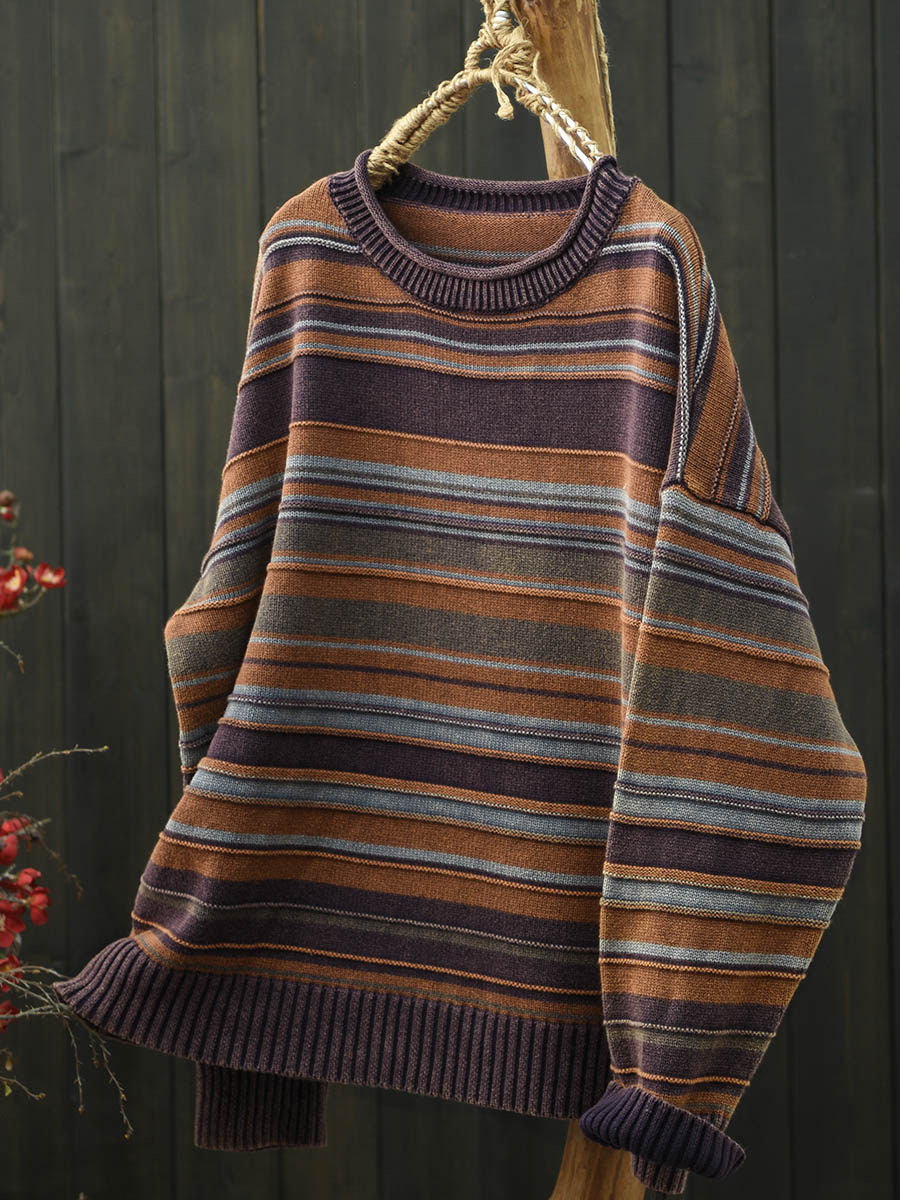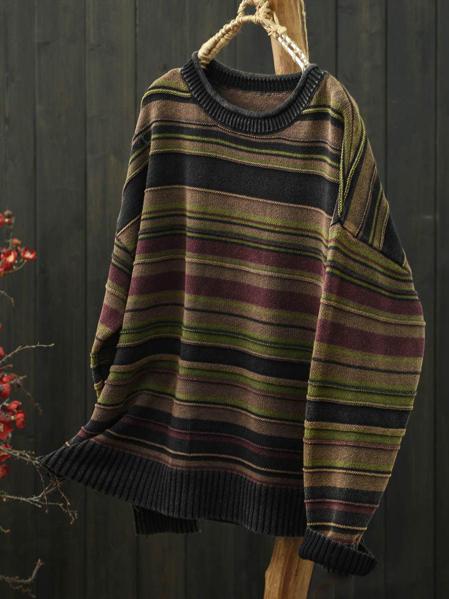 Women Autumn Artsy Stripe Knitted O-Neck Sweater