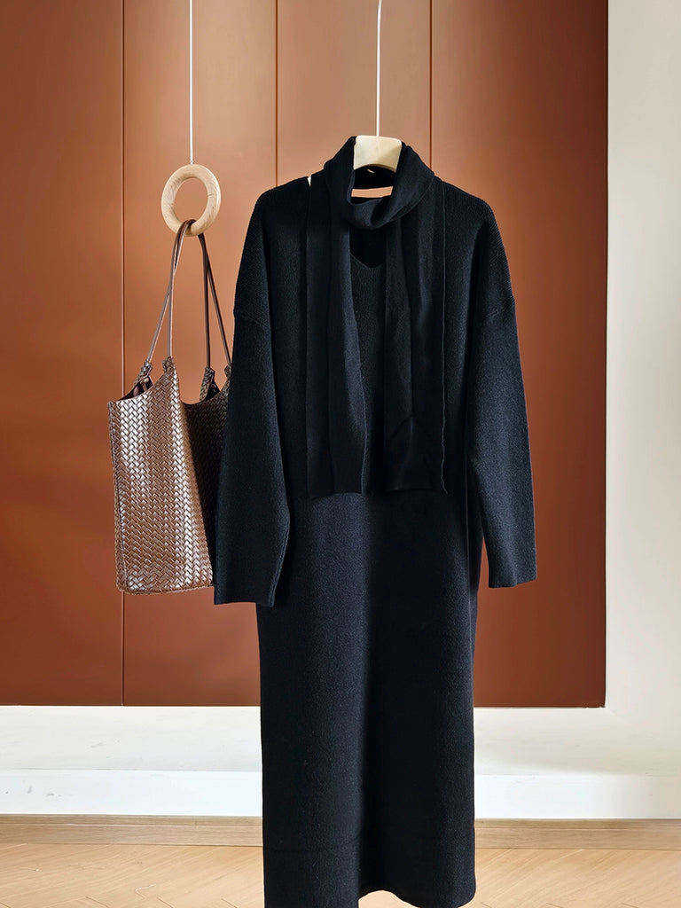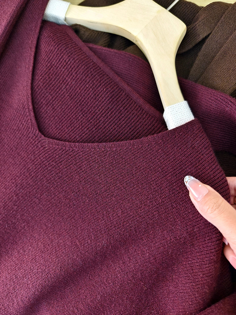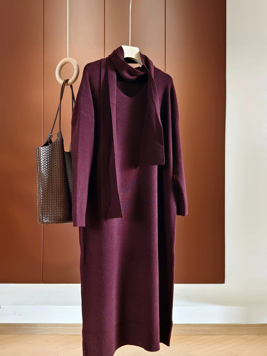 Women Autumn Casual Pure Color Knitted V-Neck Dress