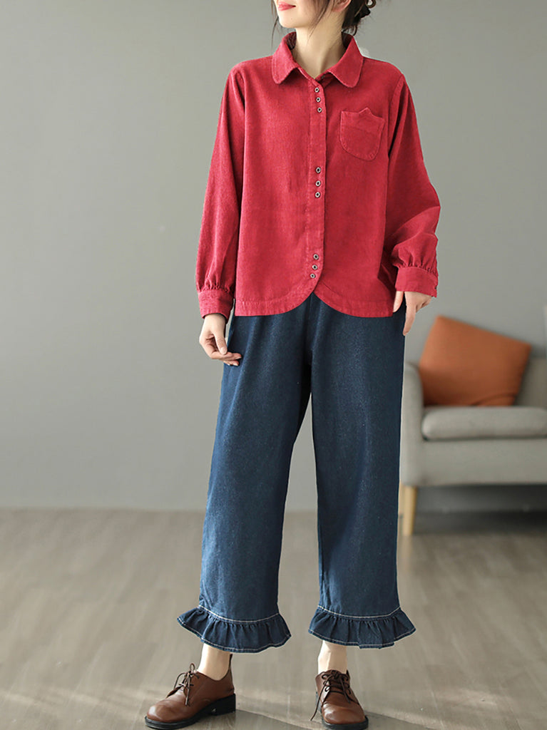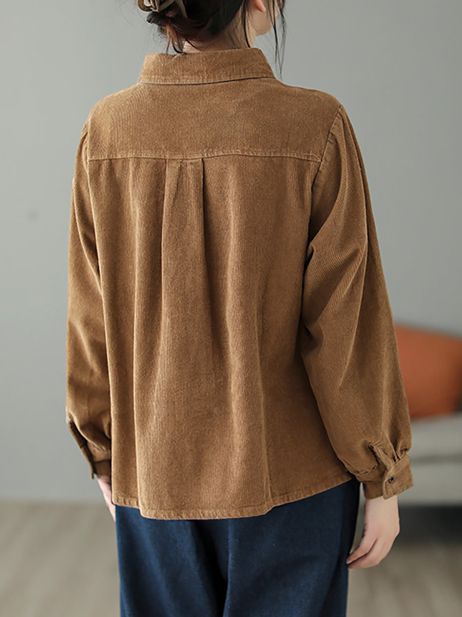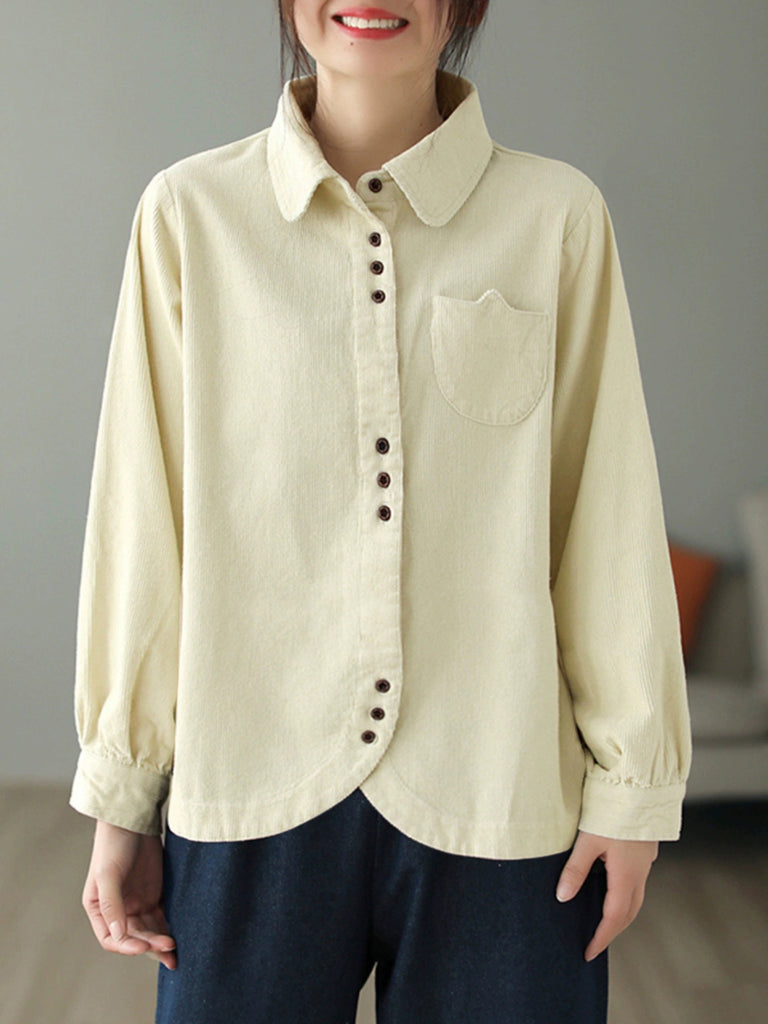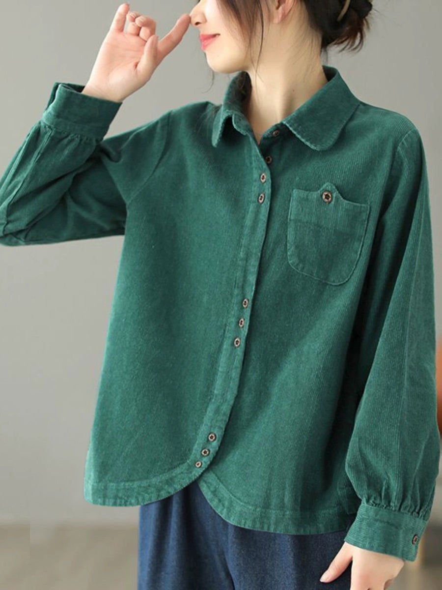 Plus Size Women Autumn Pure Color Turn-down Collar Corduroy Shirt