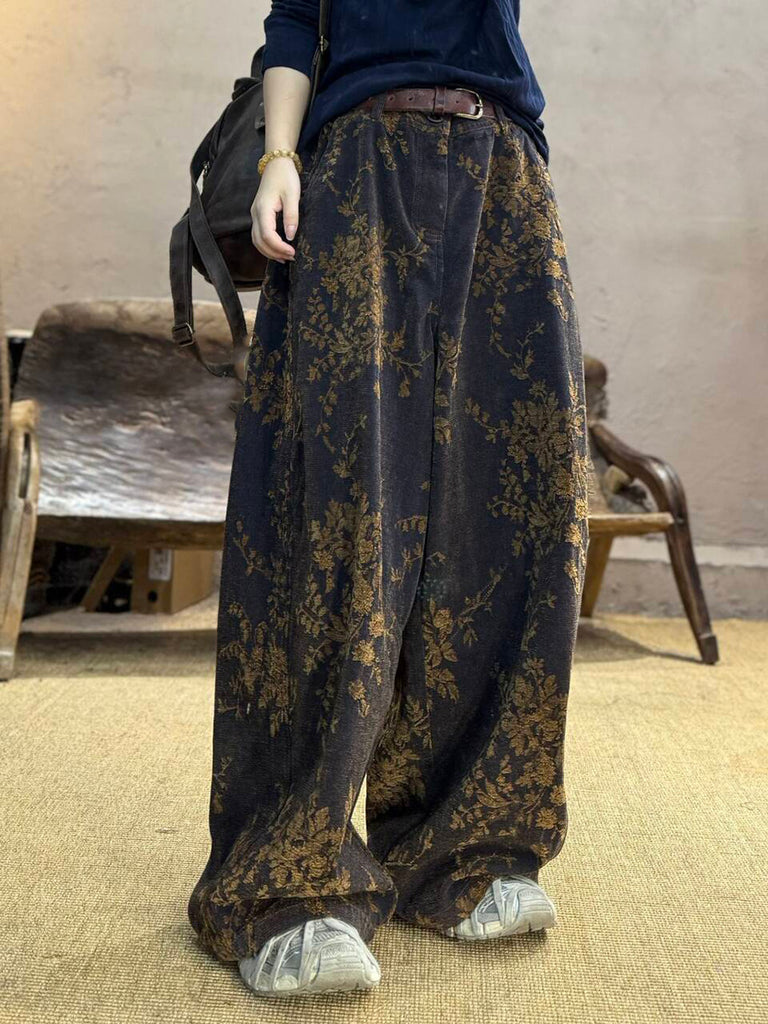 Women Autumn Retro Flower 100%Cotton Wide-leg Pants