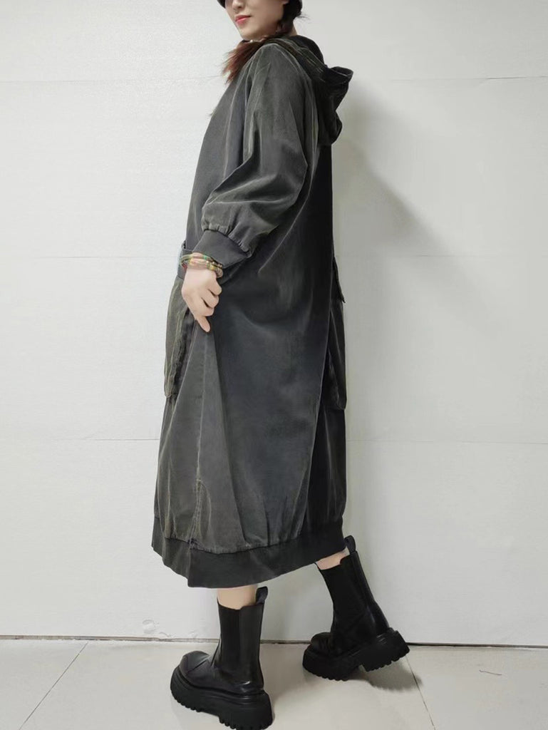Women Autumn Retro Pure Color Denim Hooded Dress