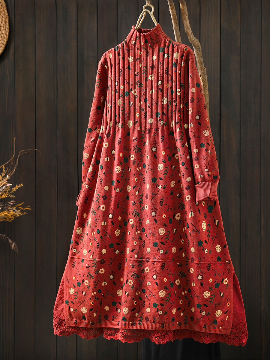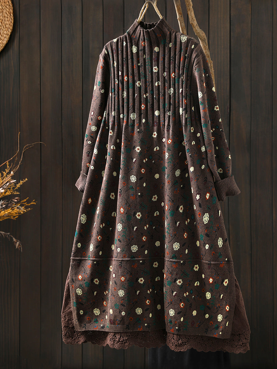 Women Autumn Vintage Floral Half-Turtleneck Knitted Dress