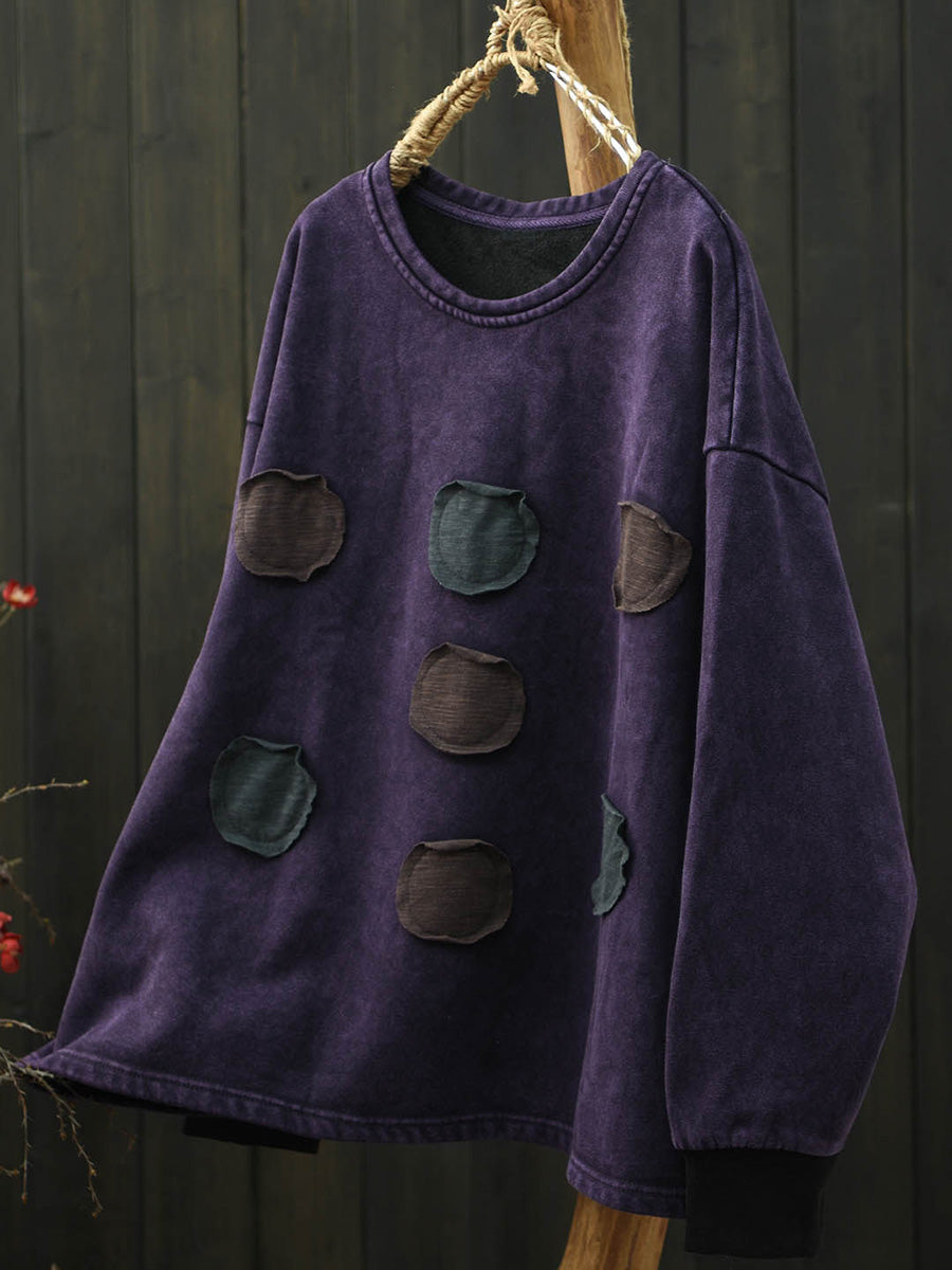 Women Retro Autumn Patchwork Fleece-lined O-Neck Blouse