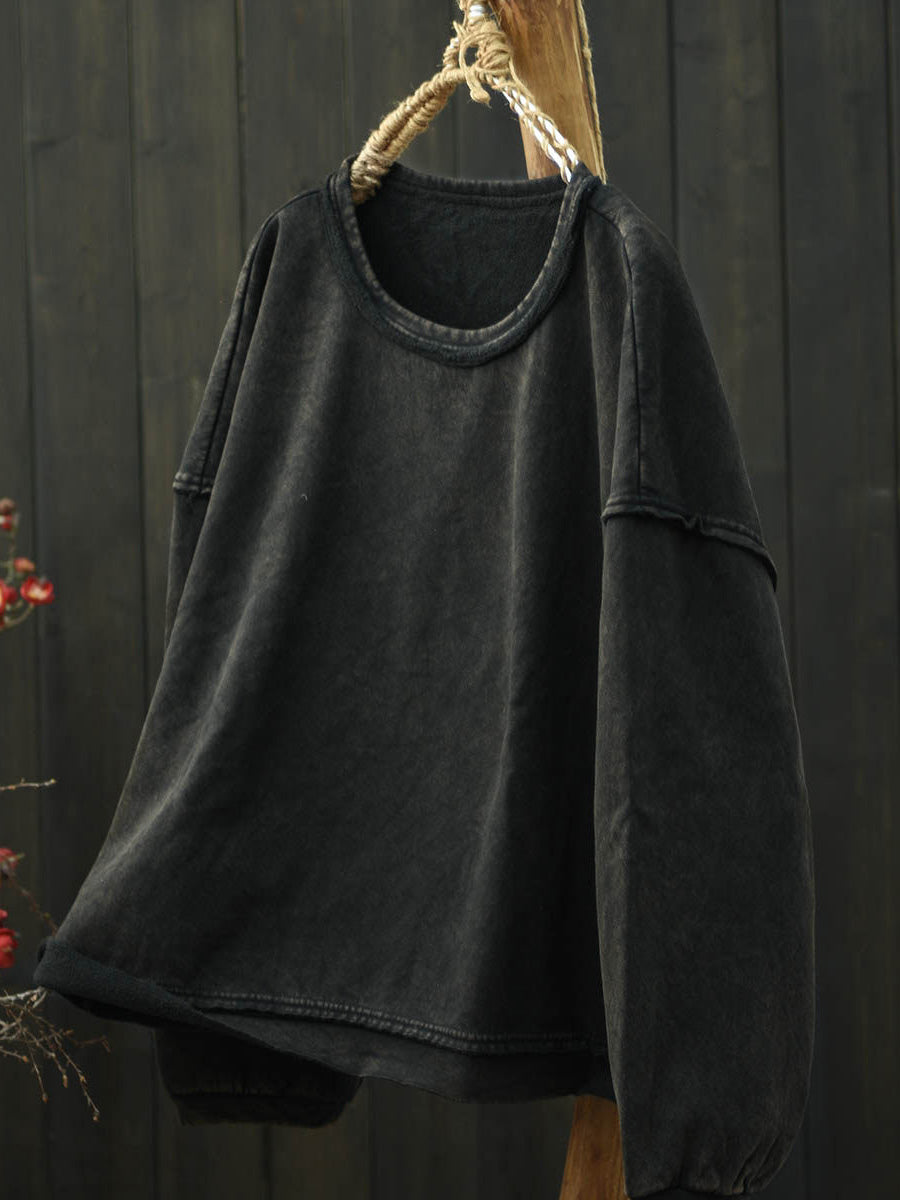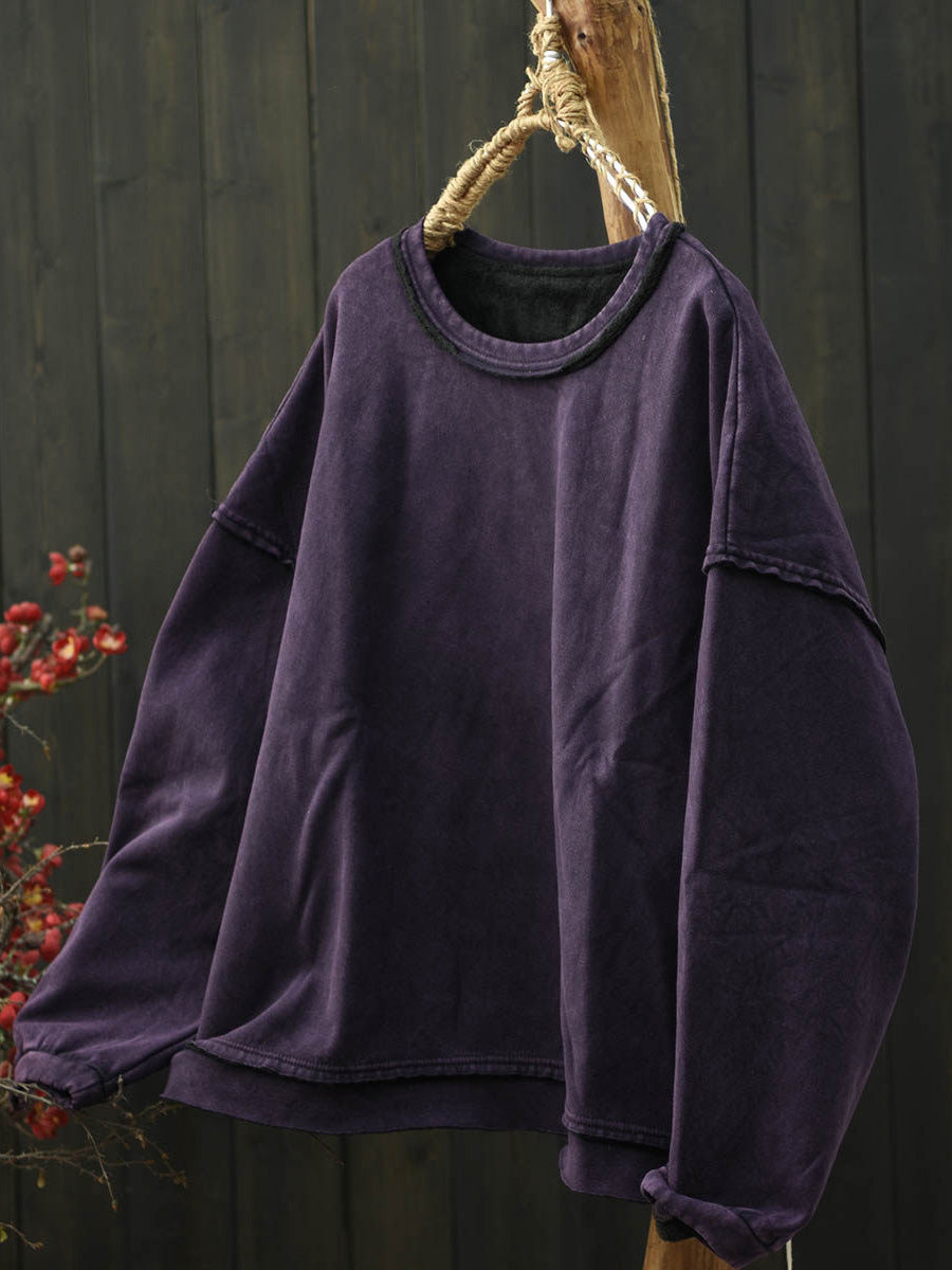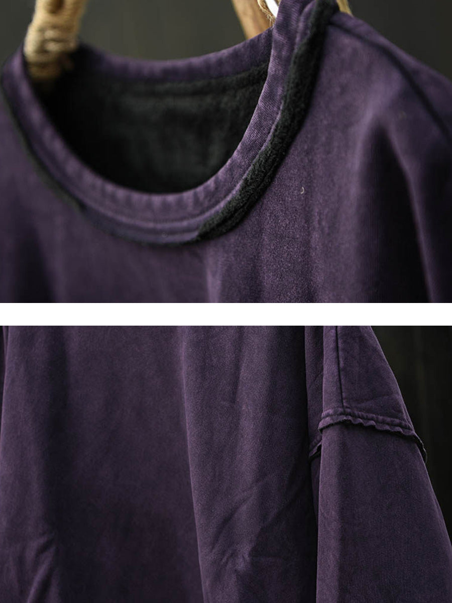 Women Retro Autumn Pure Color Fleece-lined O-Neck Blouse
