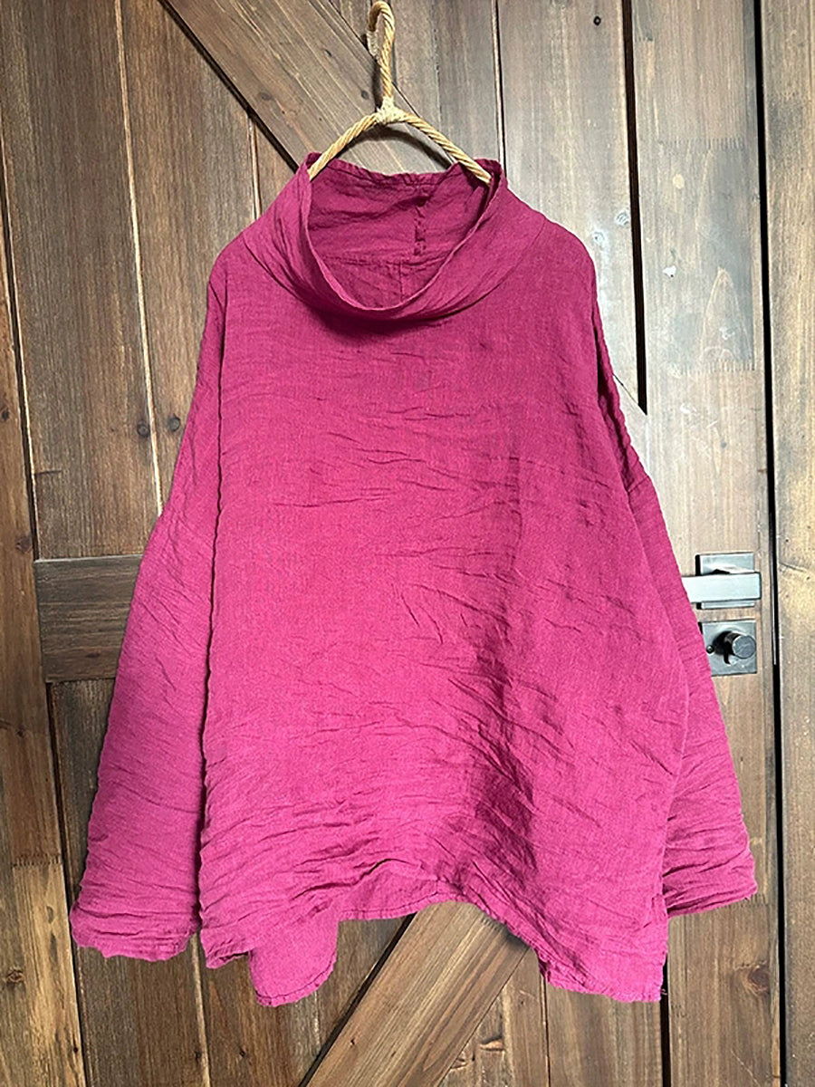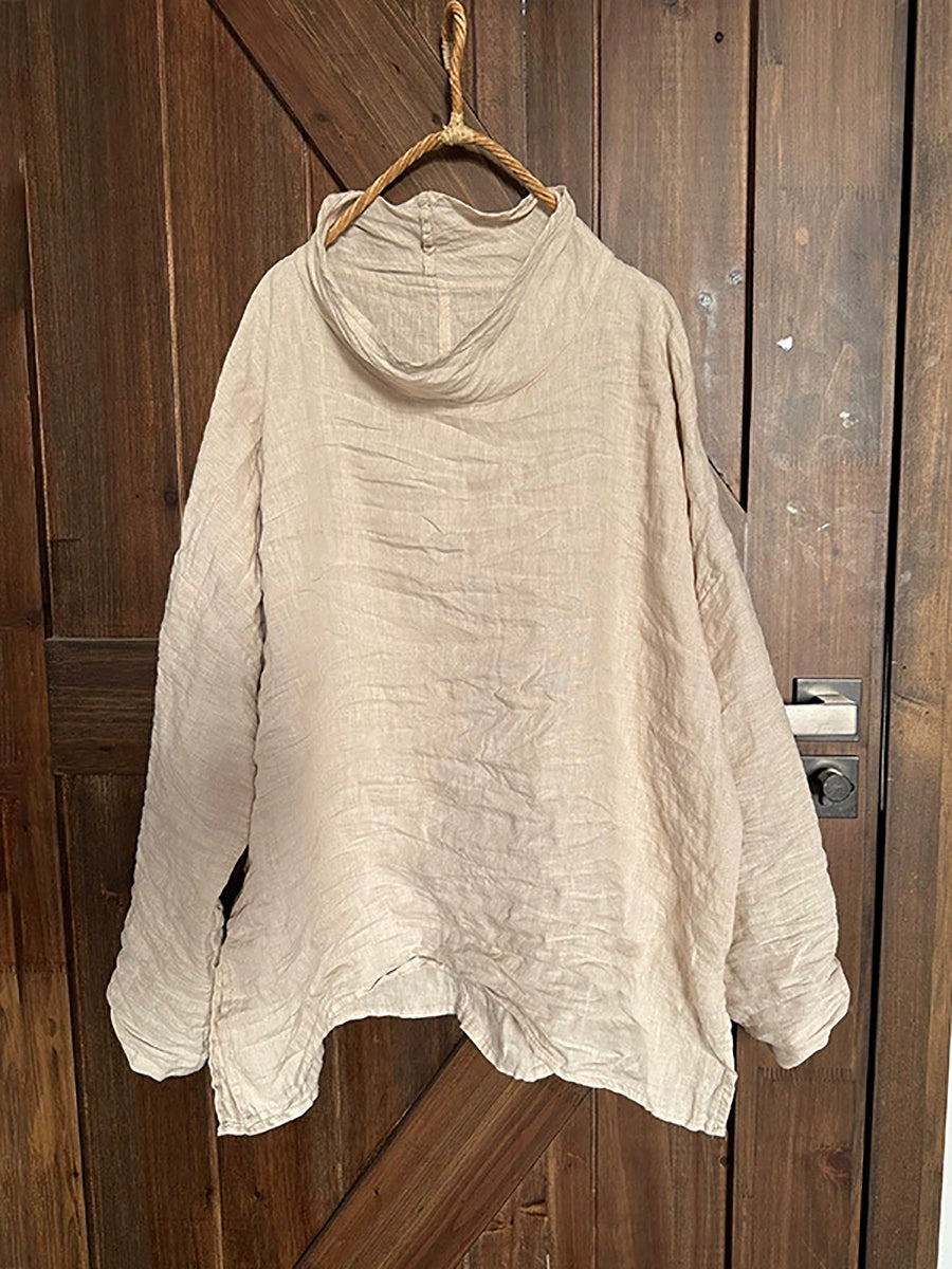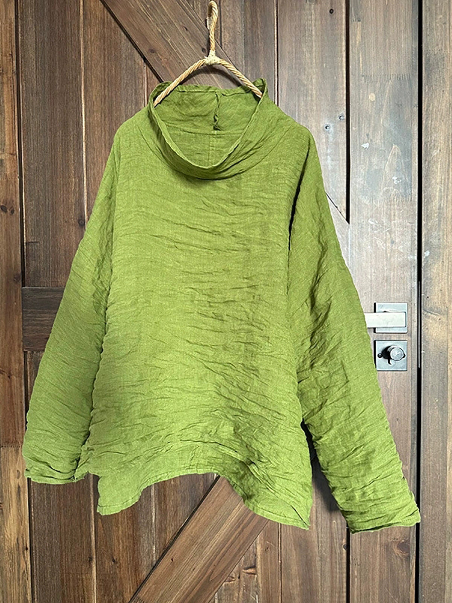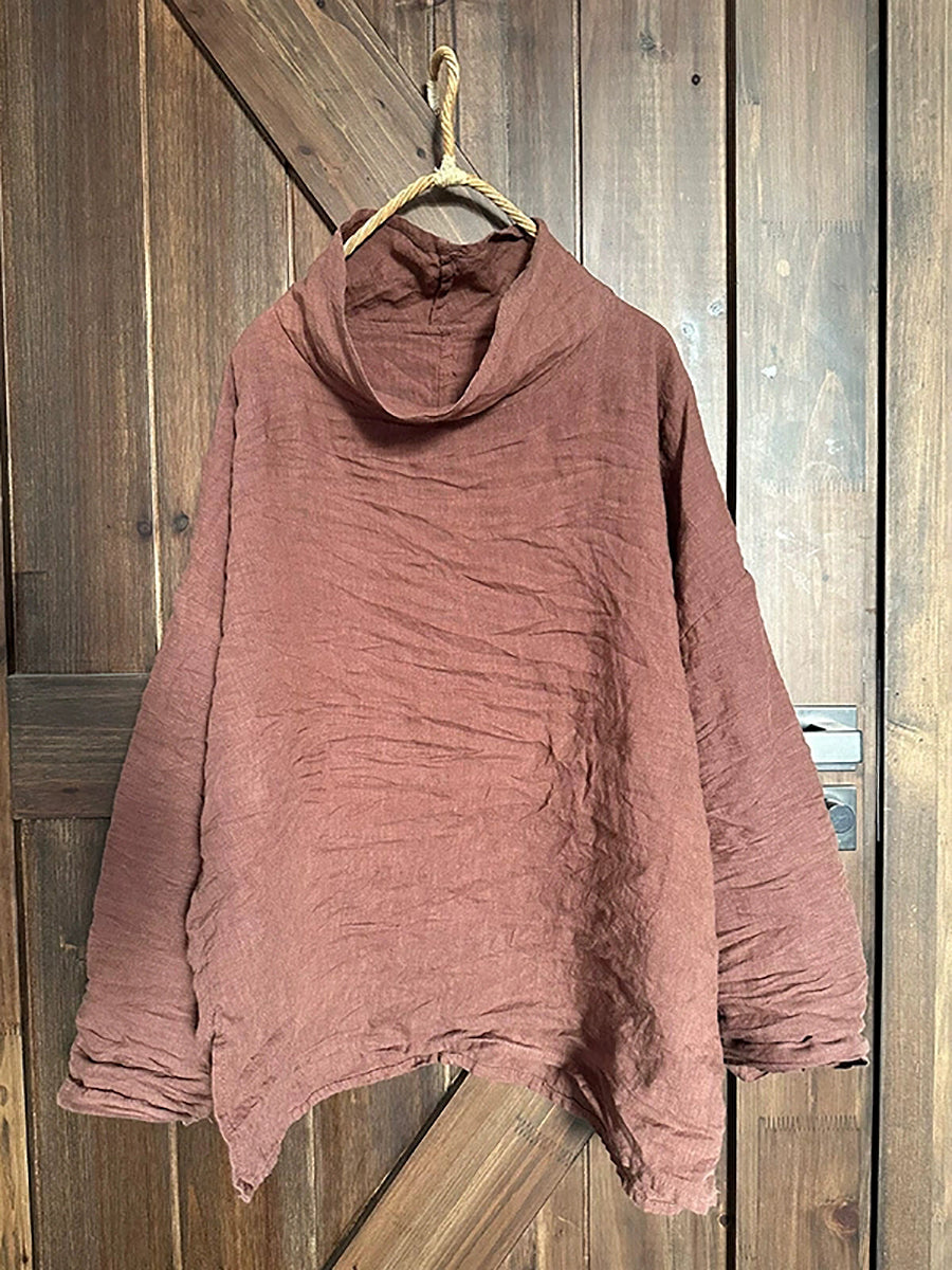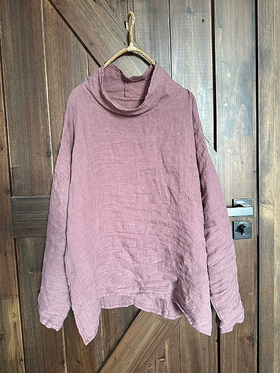 Women Retro Spring Pure Color Linen Turtleneck Blouse