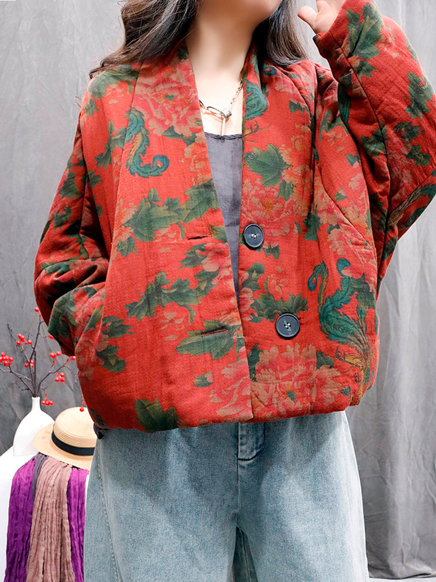 Women Retro Flower 100%Cotton V-Neck Padded Coat