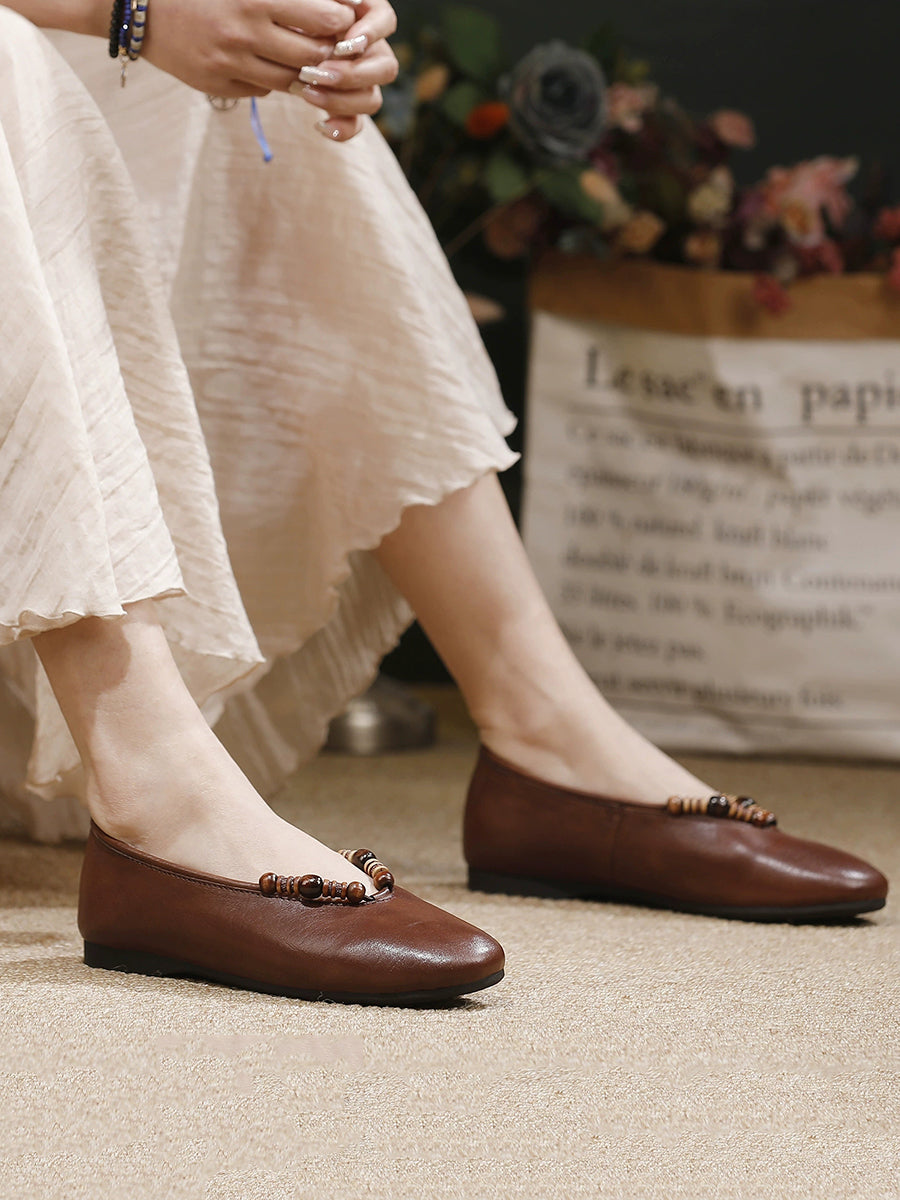 Women Retro Genuine Leather Beads Flat Shoes