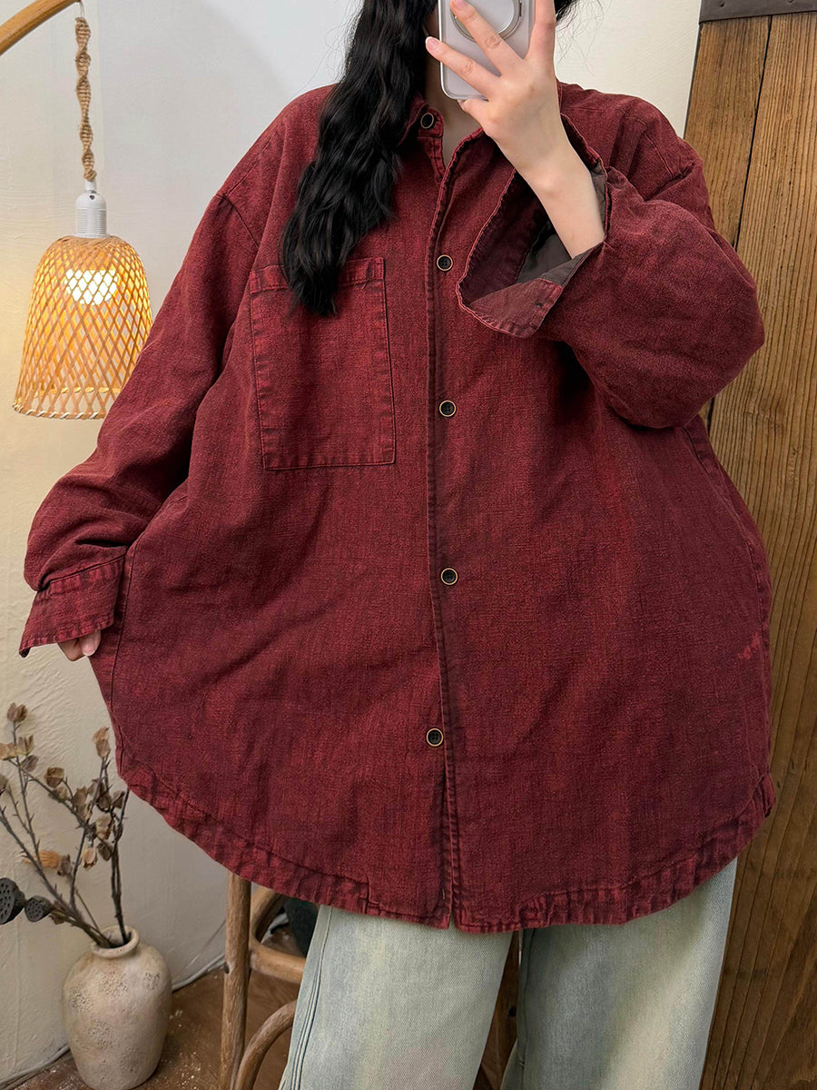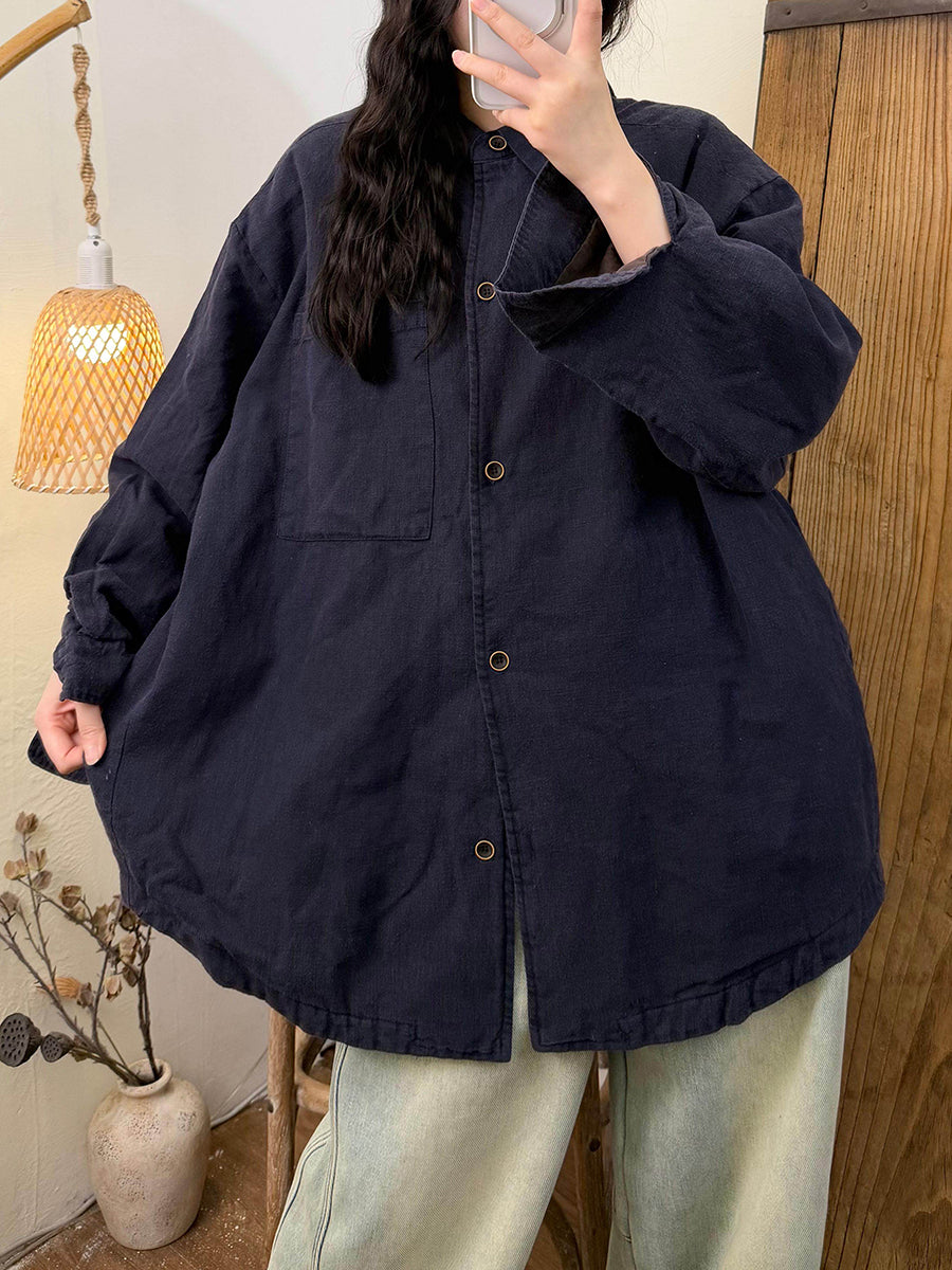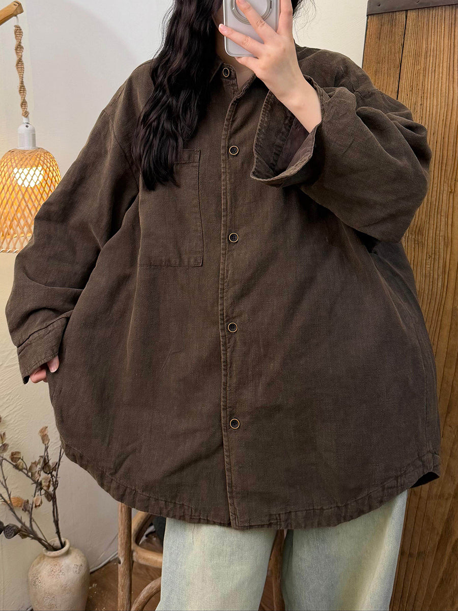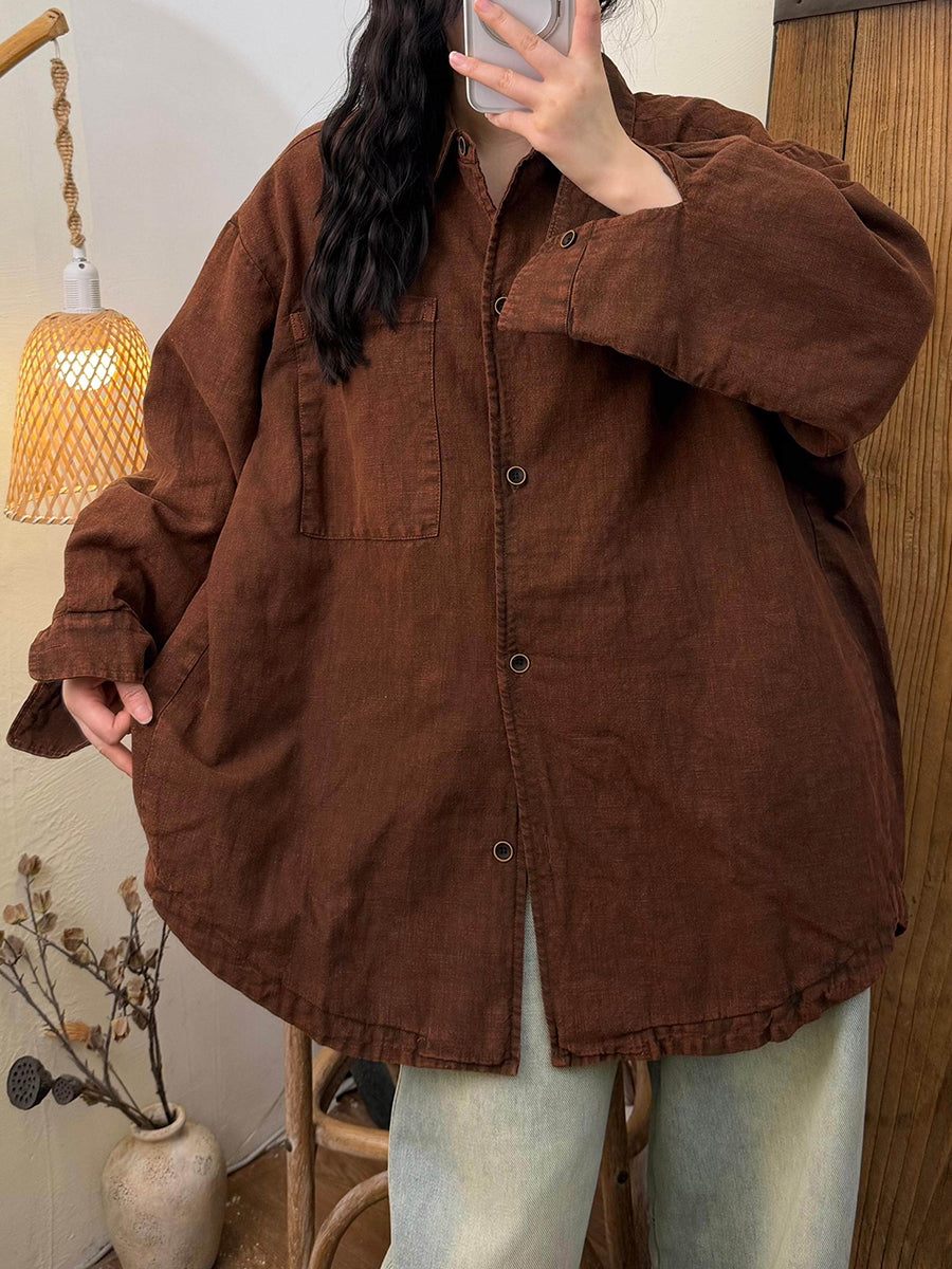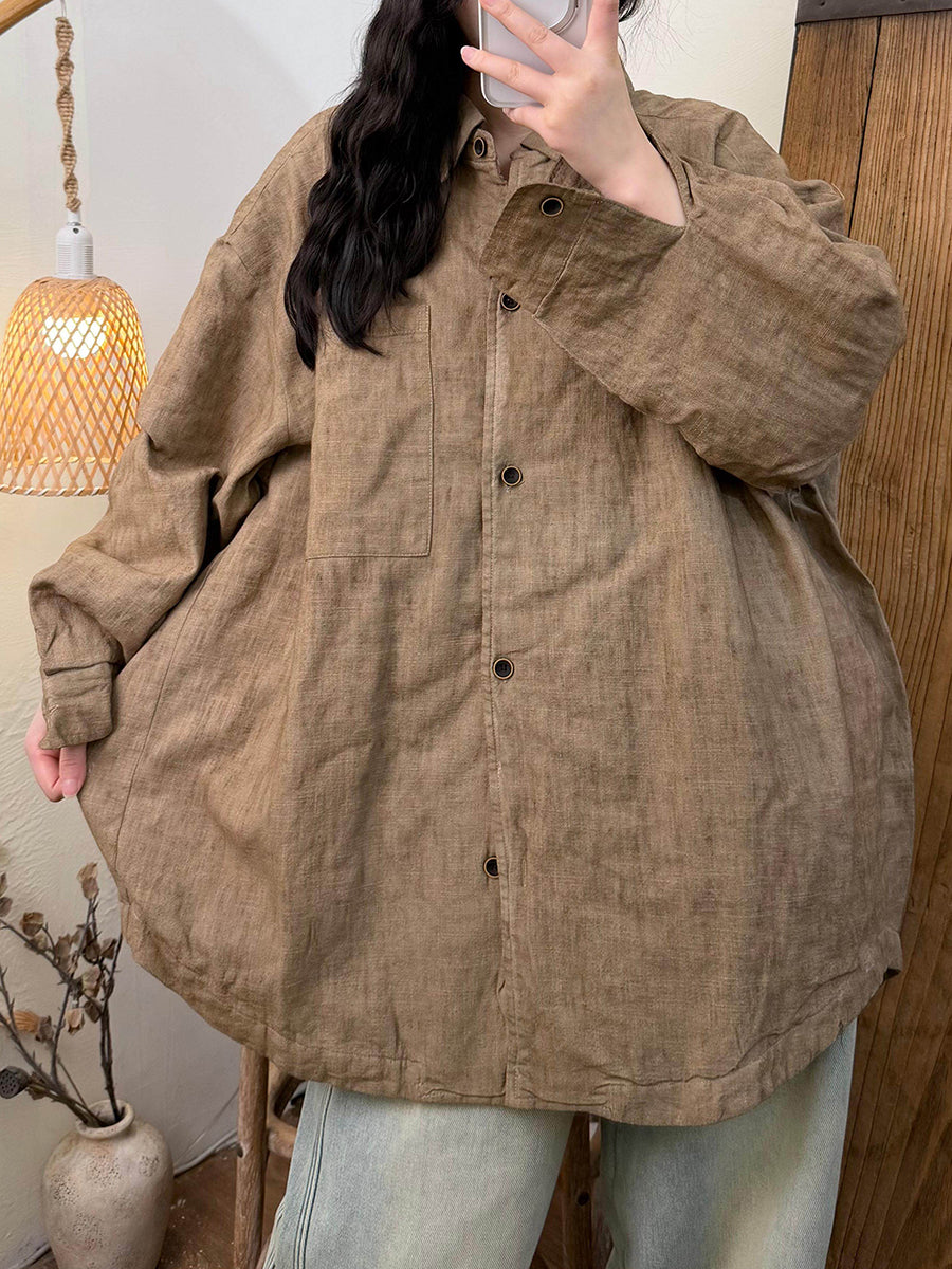 Women Retro Winter Pure Color Turn-down Collar Linen Shirt