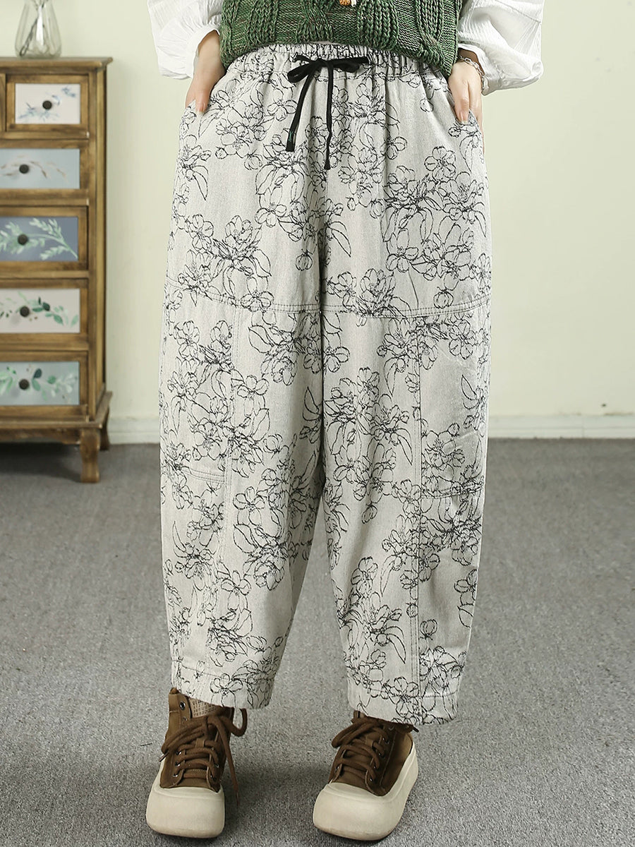 Women Spring Artsy Denim Flower Harem Pants
