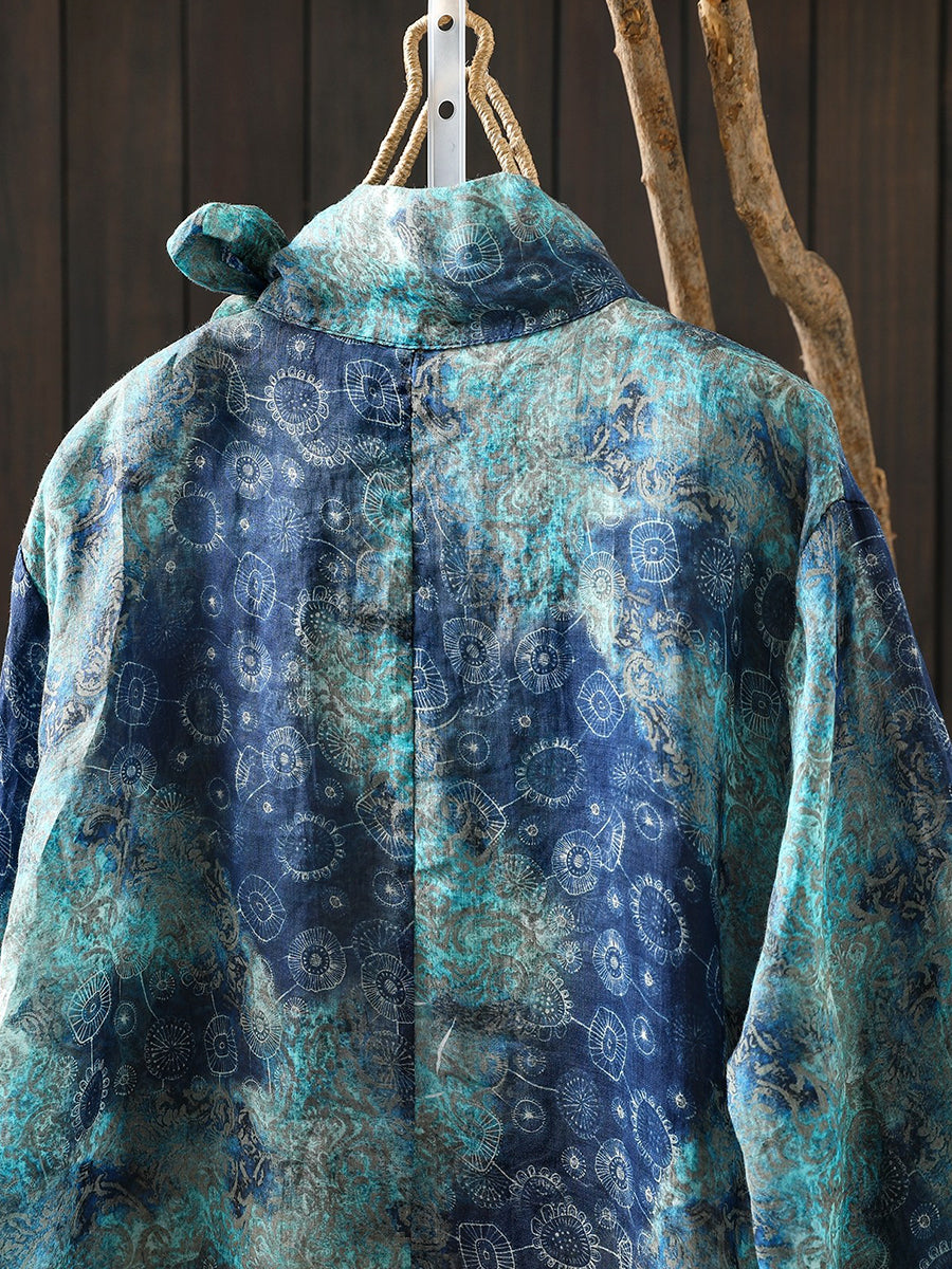 Women Spring Artsy Flower 100%Ramie Stand Collar Blouse
