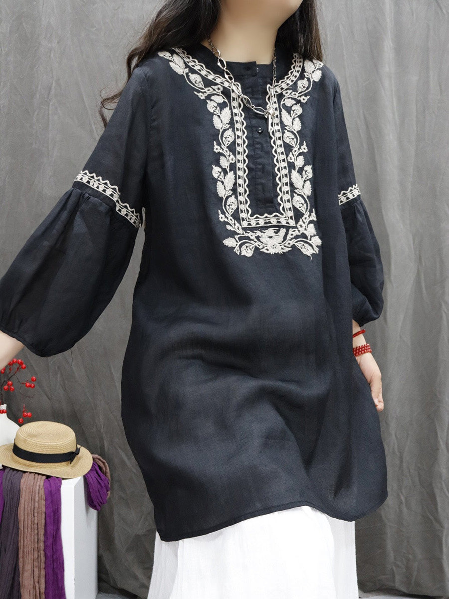 Women Spring Artsy Flower Embroidery 100%Ramie O-Neck Shirt