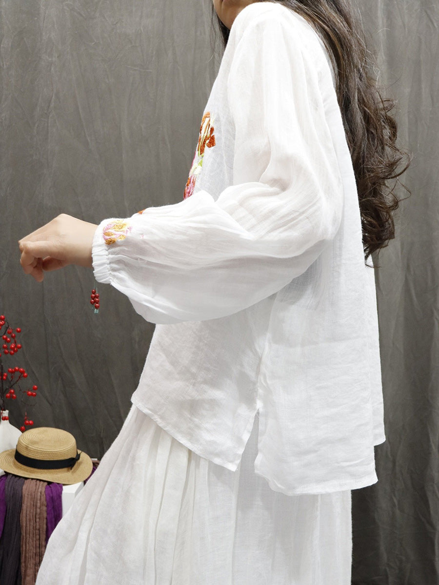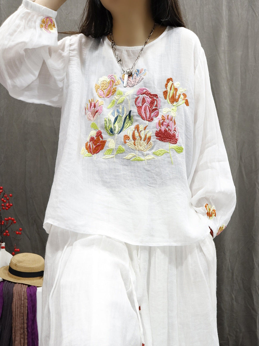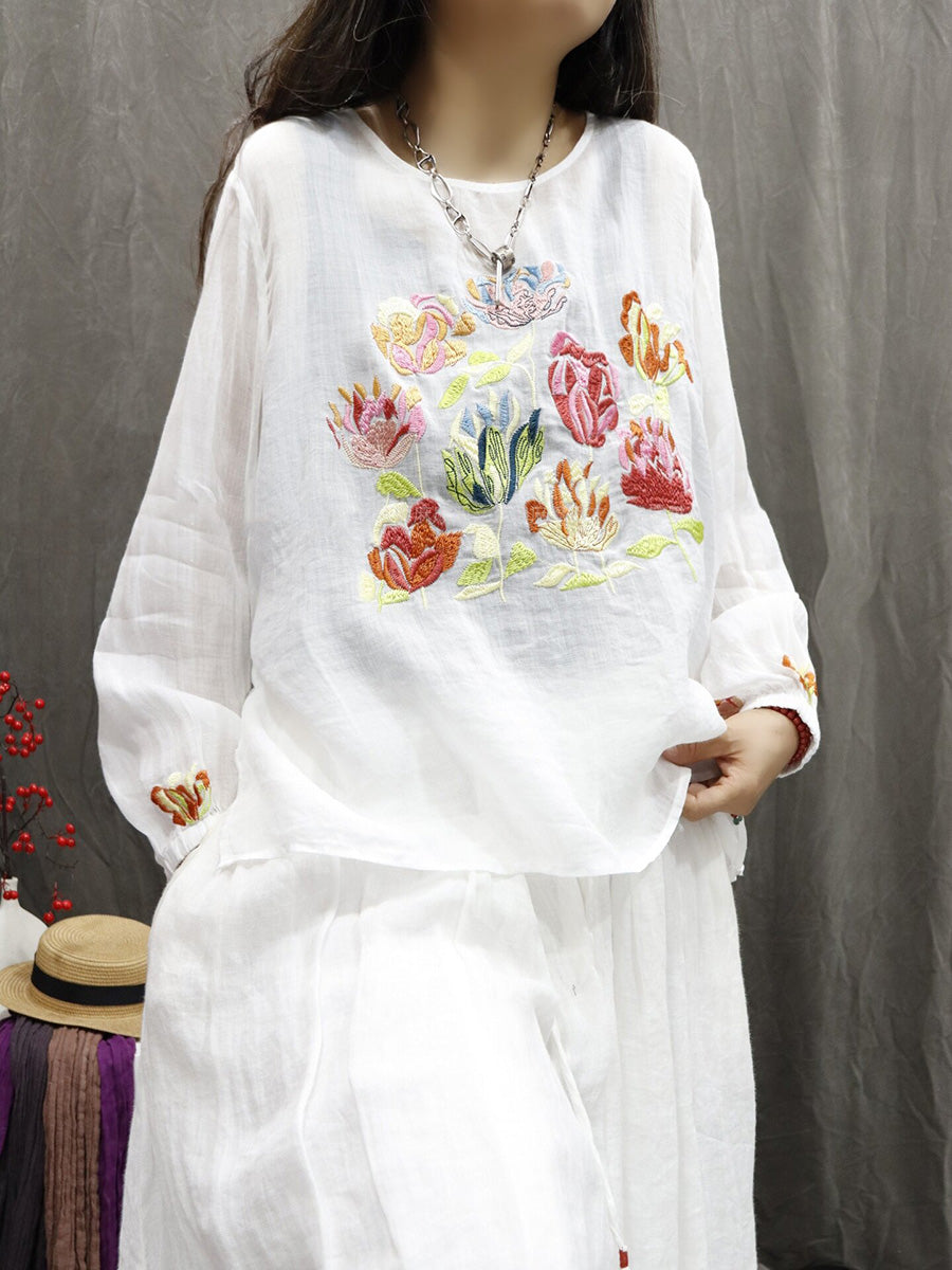 Women Spring Artsy Flower Embroidery O-Neck 100%Ramie Shirt