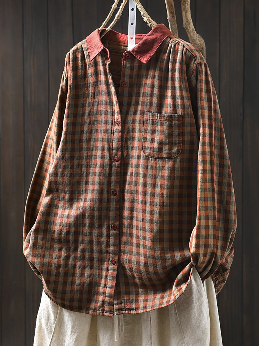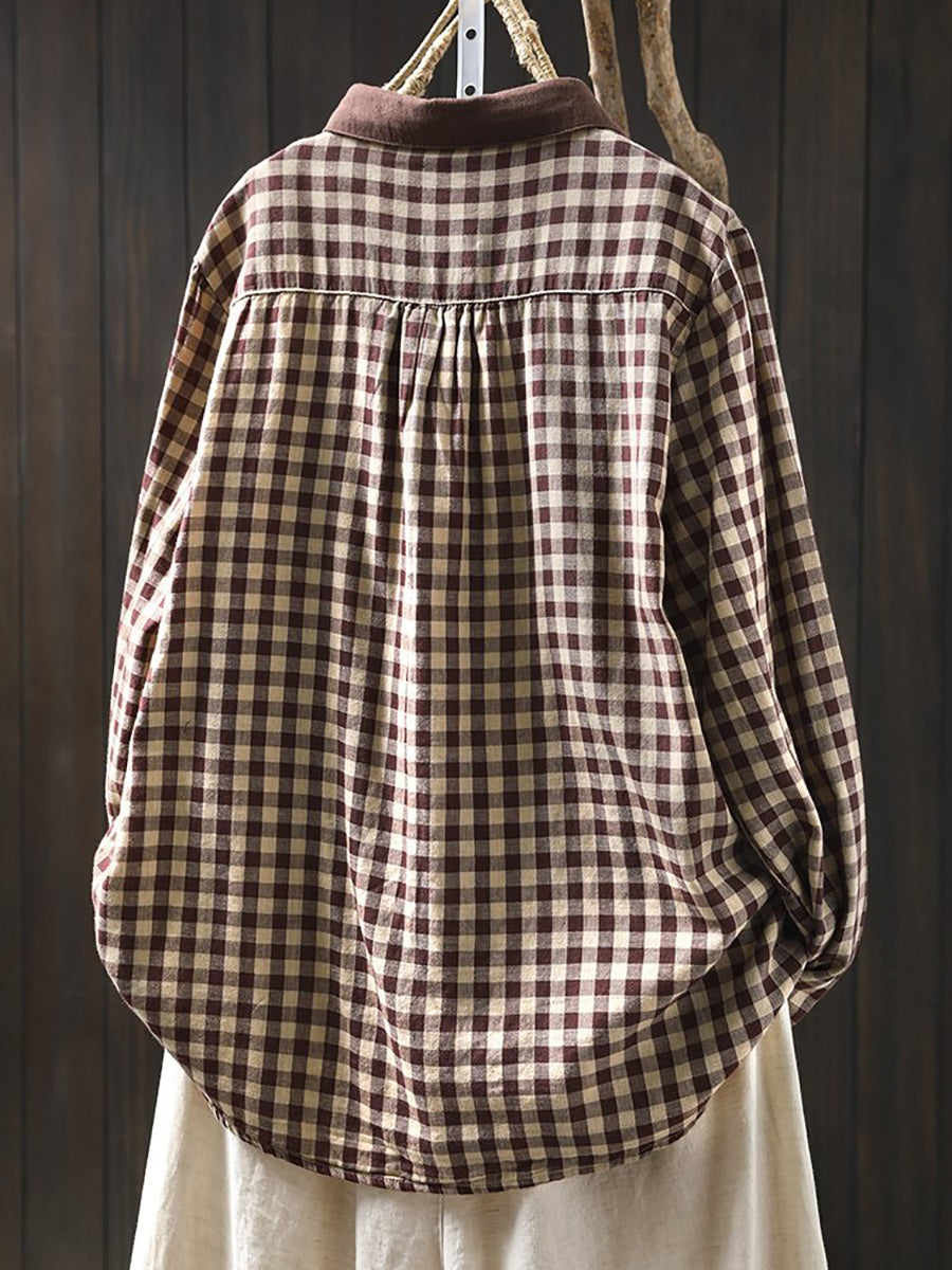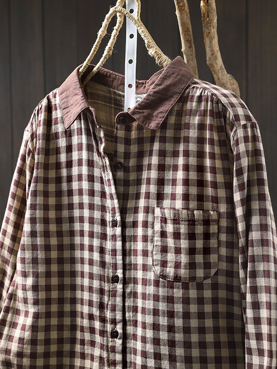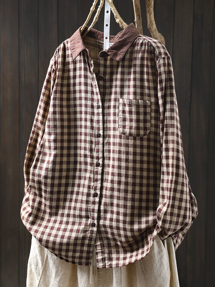 Women Spring Artsy Plaid Colorblock 100%Cotton Shirt