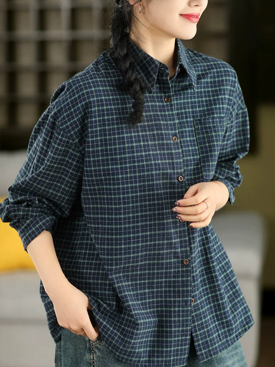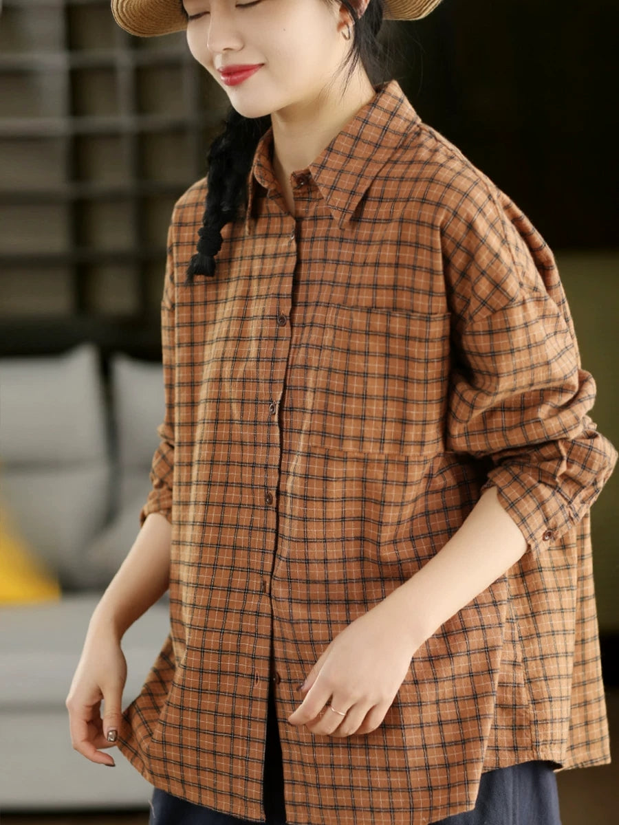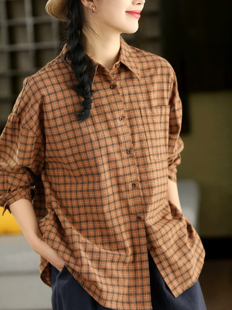 Women Spring Artsy Plaid Cotton Shirt
