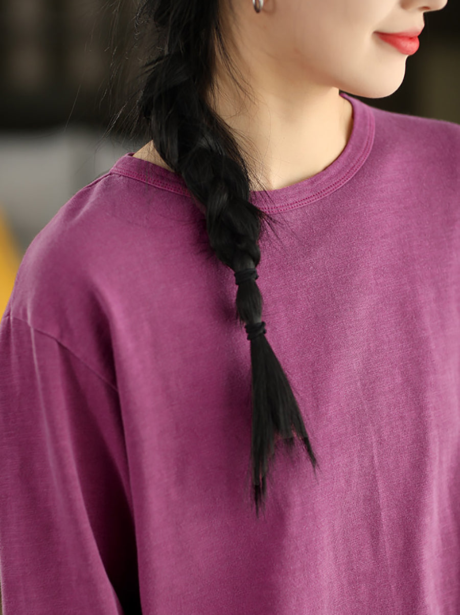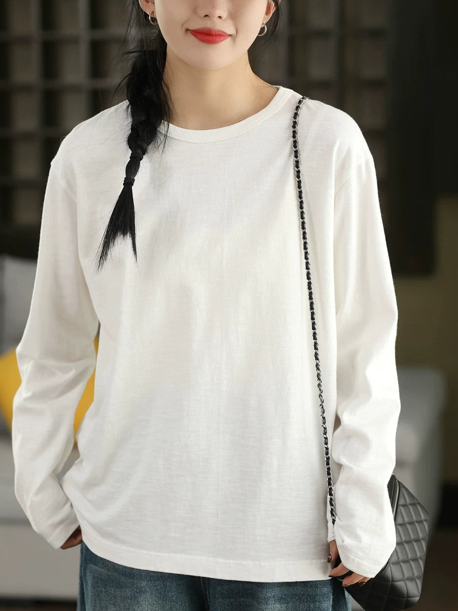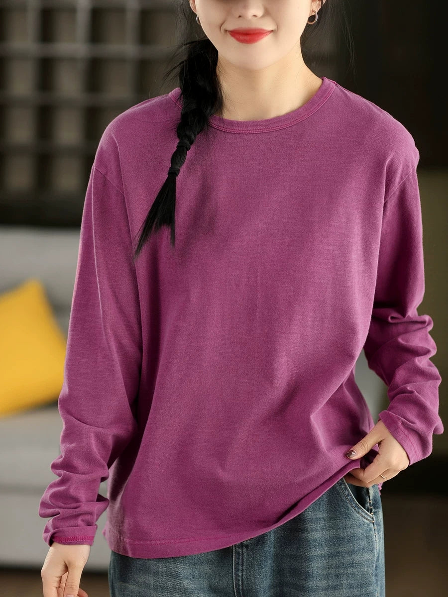Women Spring Artsy Pure Color 100%Cotton O-Neck Blouse