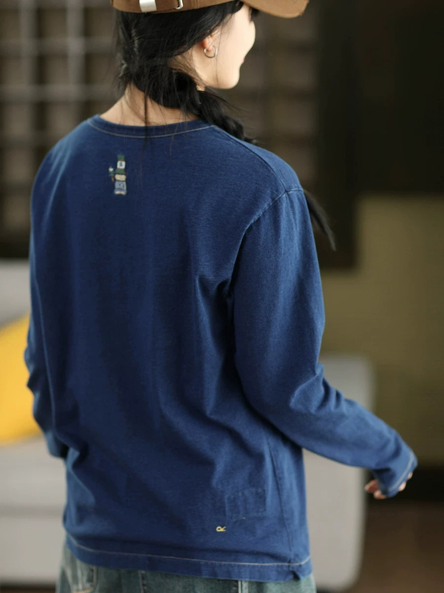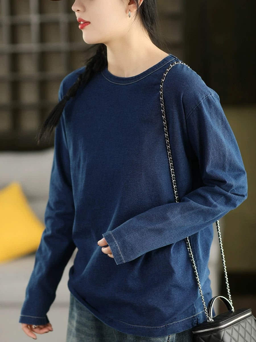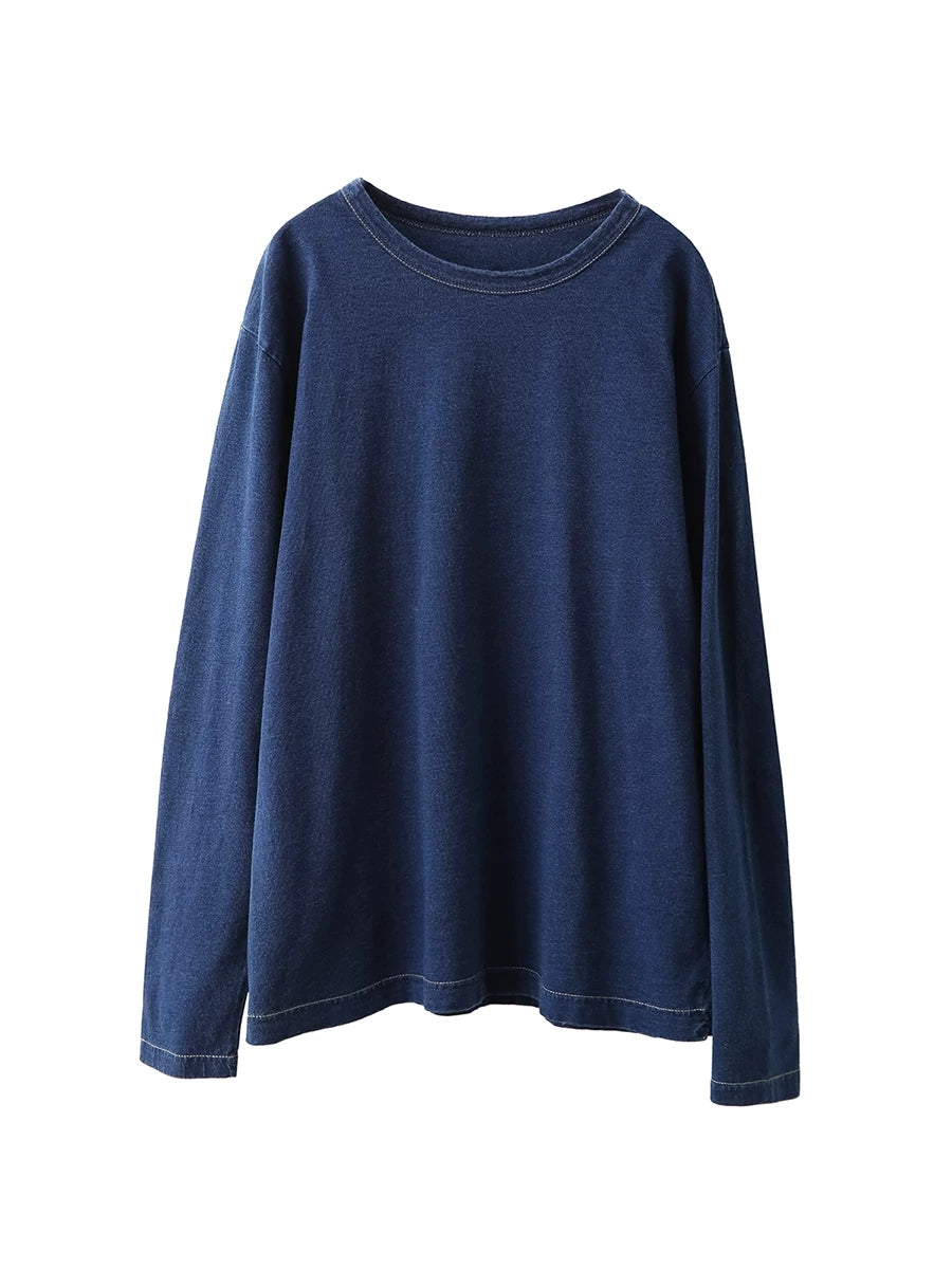Women Spring Artsy Pure Color 100%Cotton O-Neck Blouse