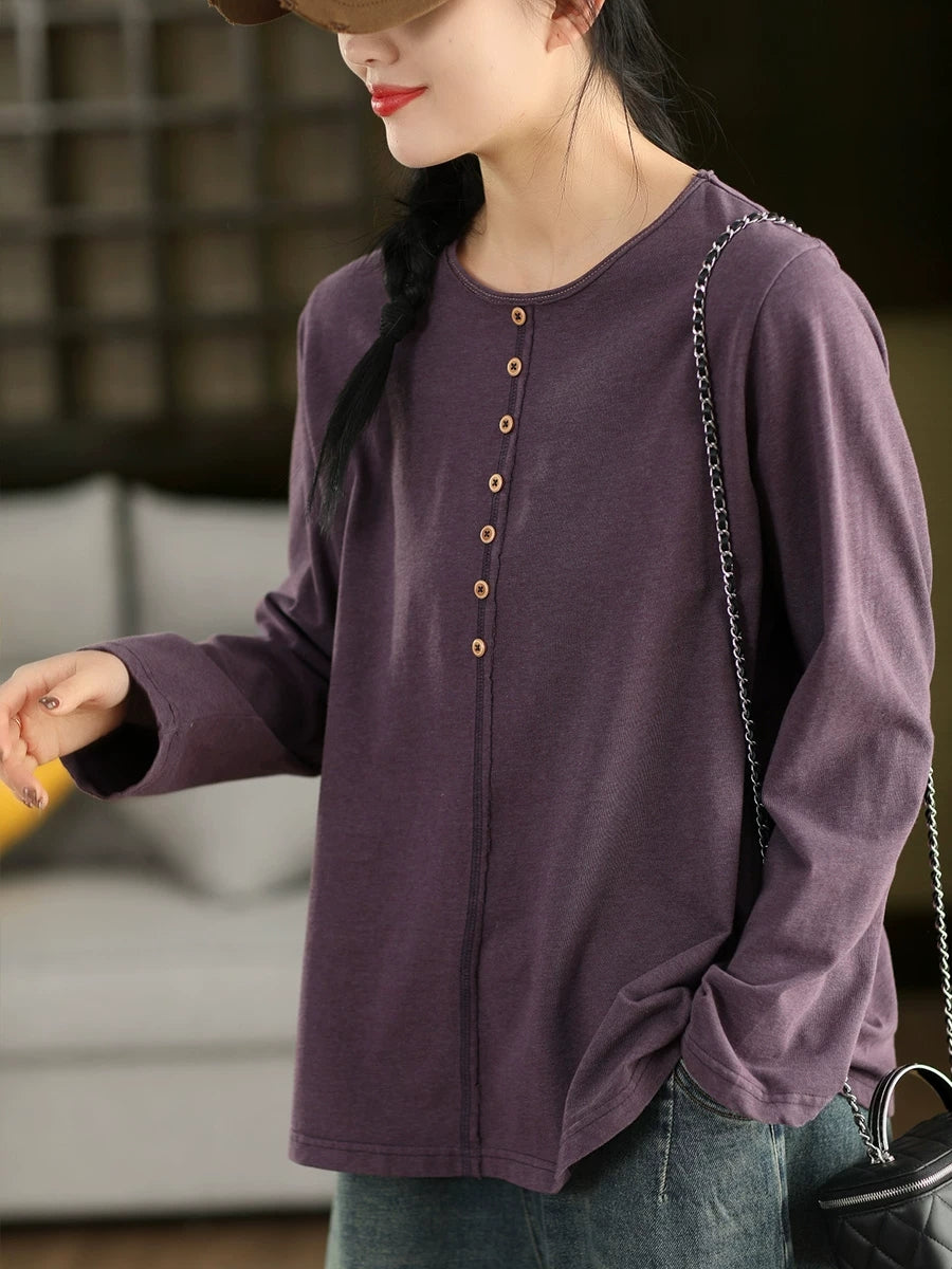 Women Spring Artsy Pure Color 100%Cotton O-Neck Blouse