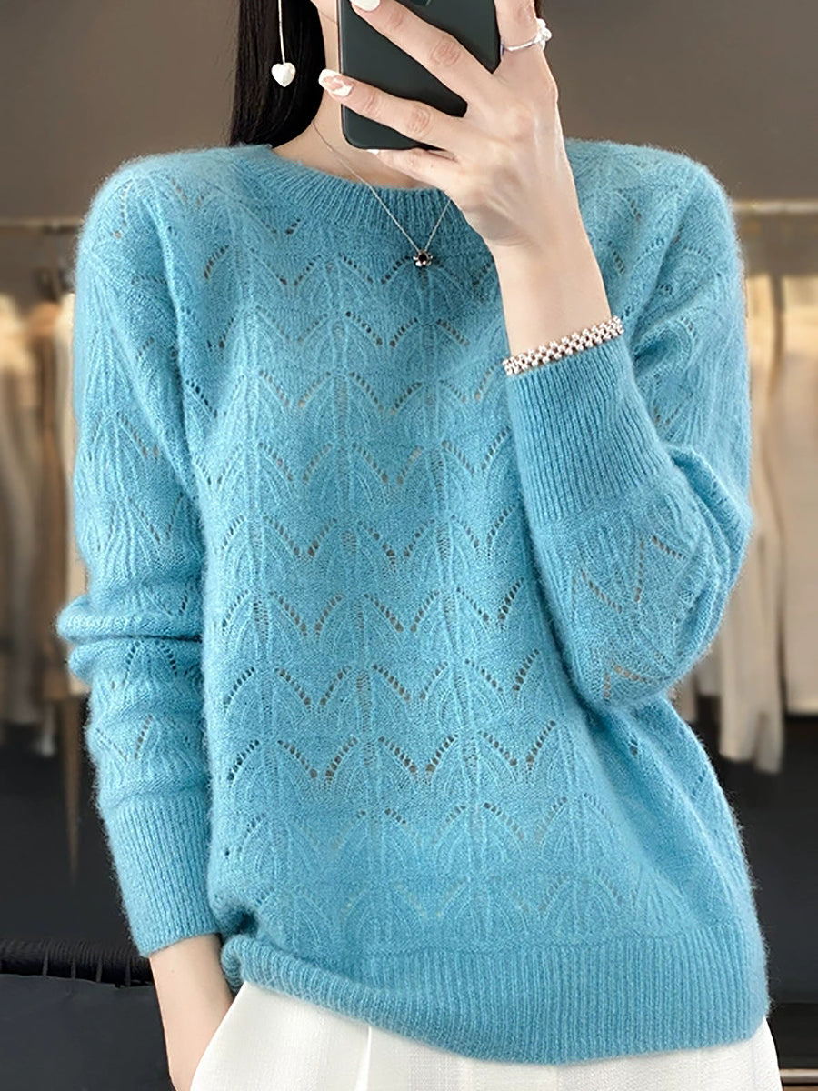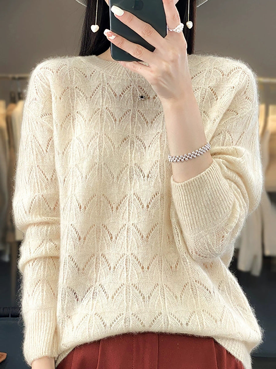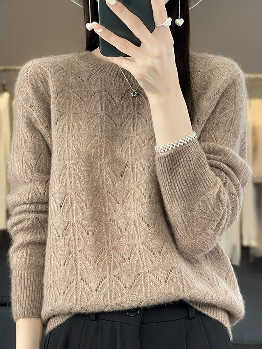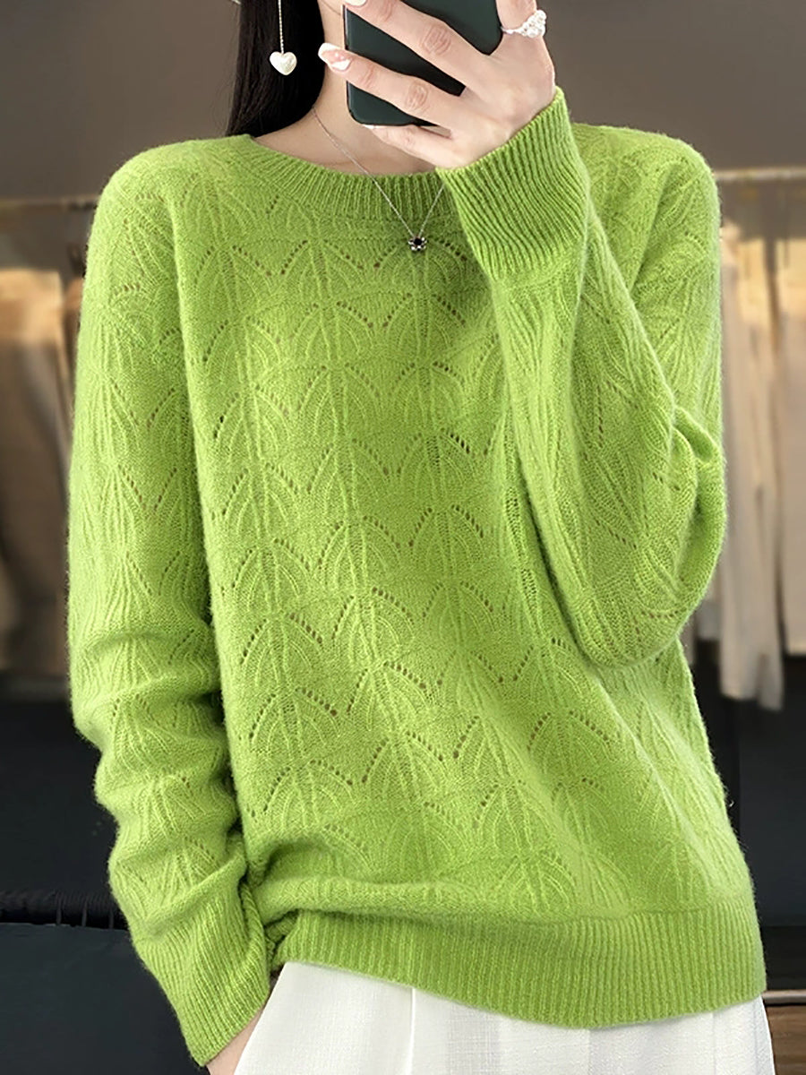 Women Spring Artsy Pure Color O-Neck Wool Sweater